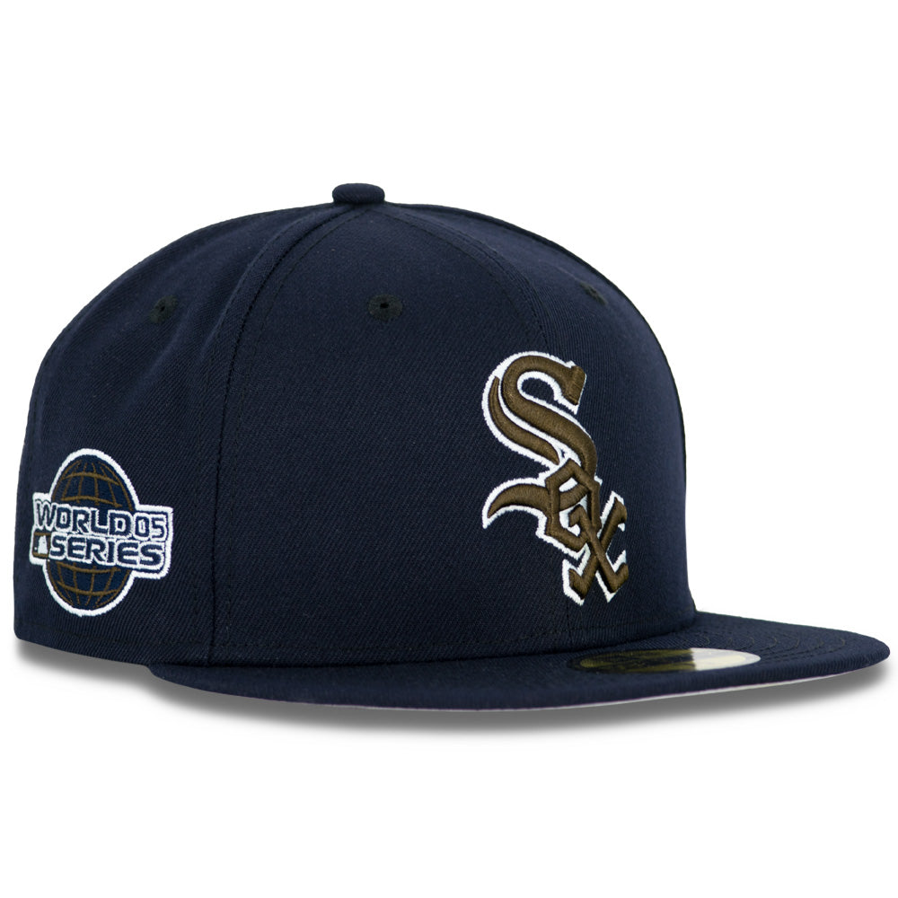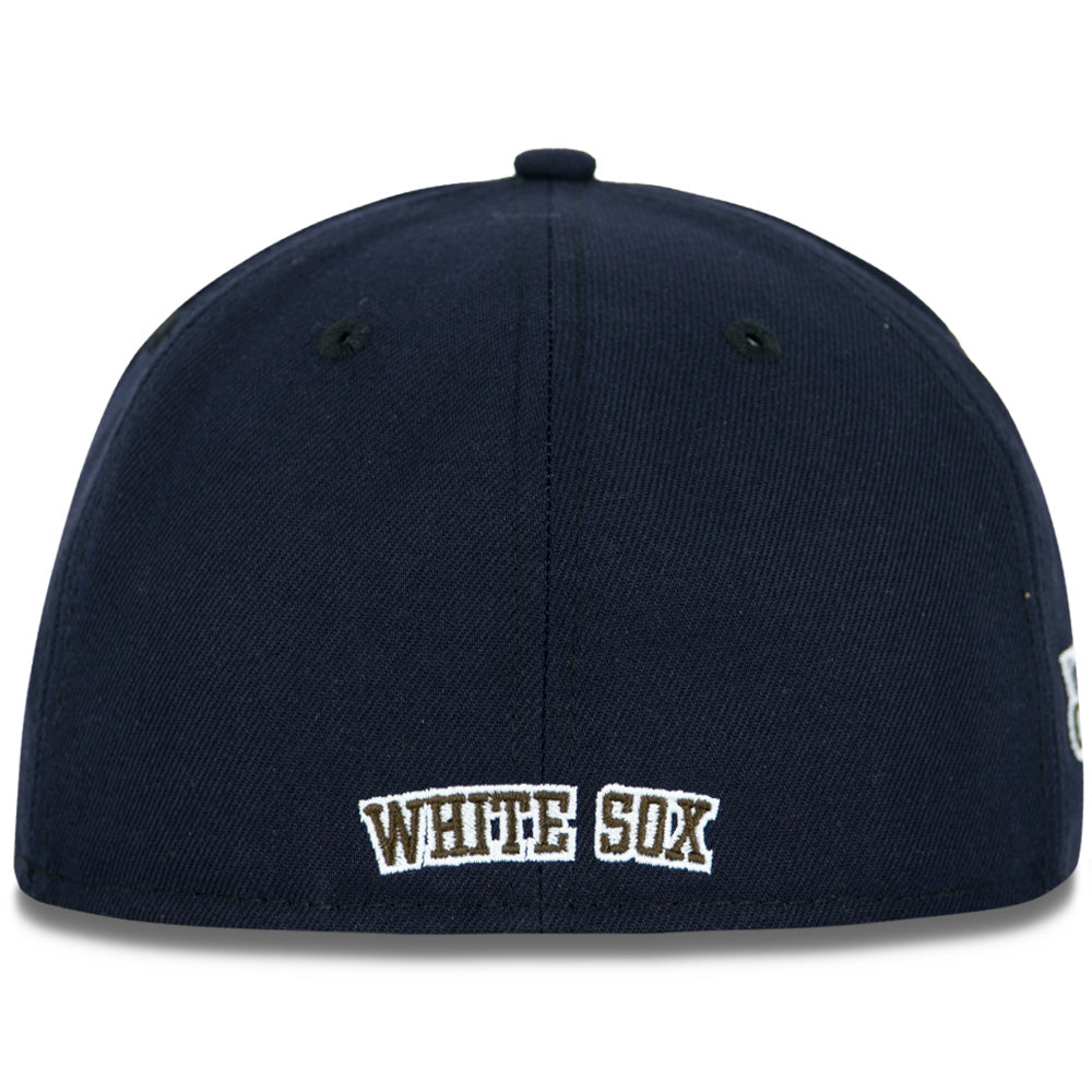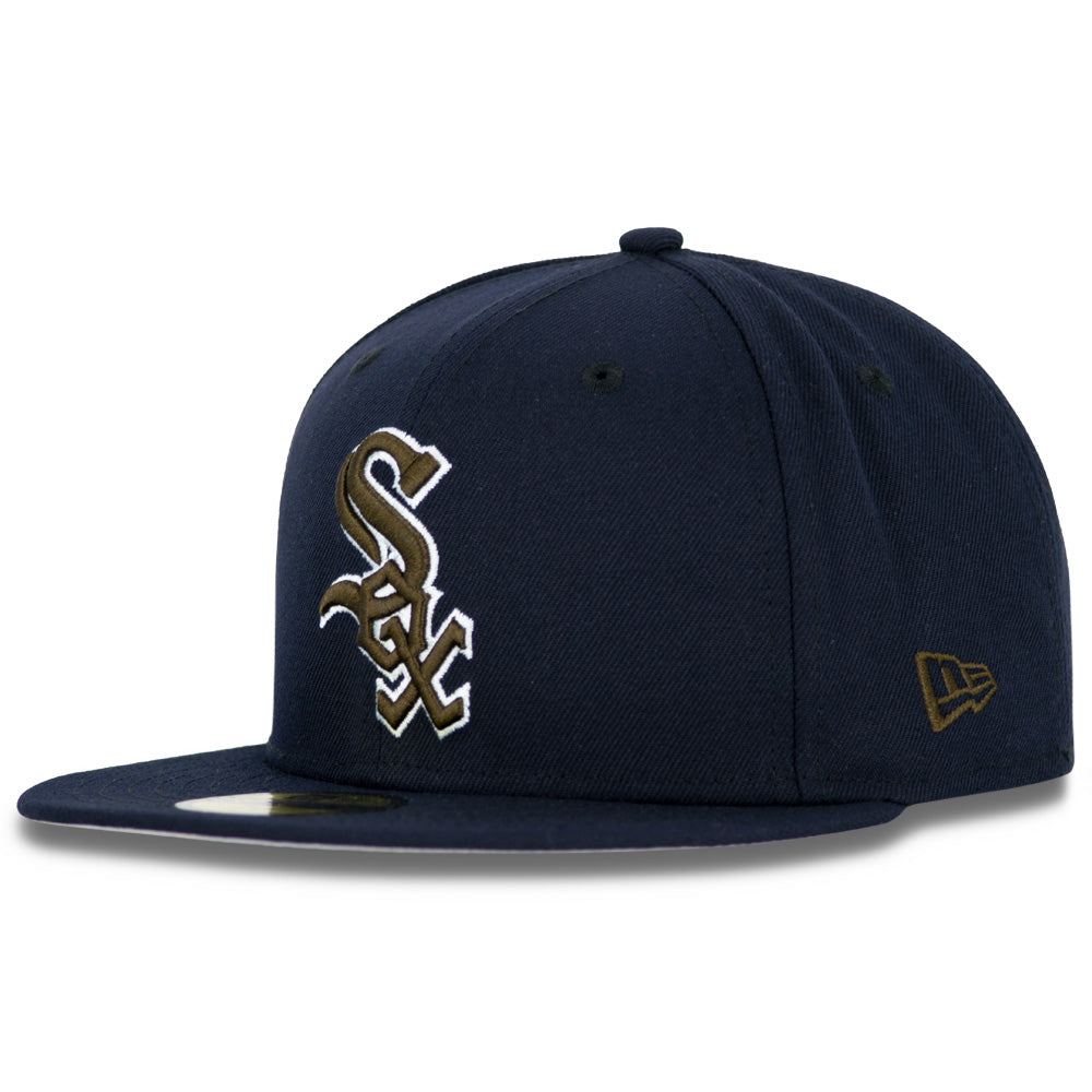 This New Era Chicago White Sox 'Arctic Tundra' 59FIFTY Fitted Hat was released by Just Sports. The fitted has a navy blue six panel structured high crown, embroidered eyelets and fabric squatchee button. The flat bill of the fitted cap is navy blue with a gray undervisor. The front panel features the Chicago White Sox logo embroidered in brown and white stitching and a side patch embroidery on the right panel in the same colorway as the primary logo. The left panel of the fitted displays the New Era logo and the Chicago White Sox