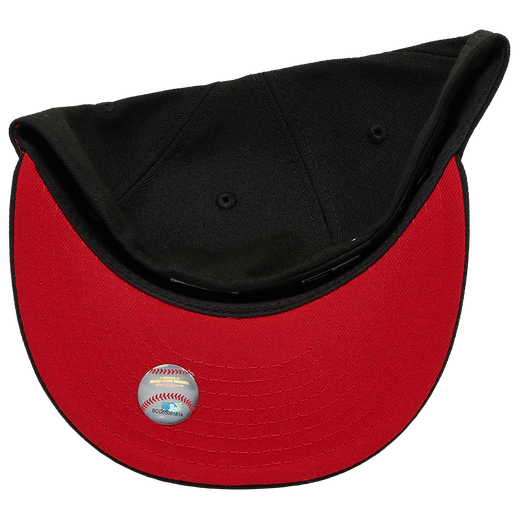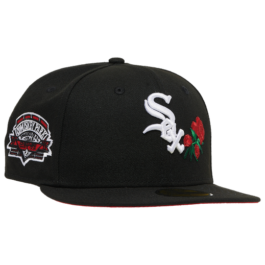 This New Era Chicago White Sox fitted hat has a black six panel structured high crown, embroidered eyelets, fabric squatchee button and flat bill. The undervisor of the fitted cap is red with a black sweatband. The front panel features the Chicago White Sox logo embroidered in white thread with a red rose embroidered patch. The right panel features a Comiskey Park Stadium side patch embroidery.