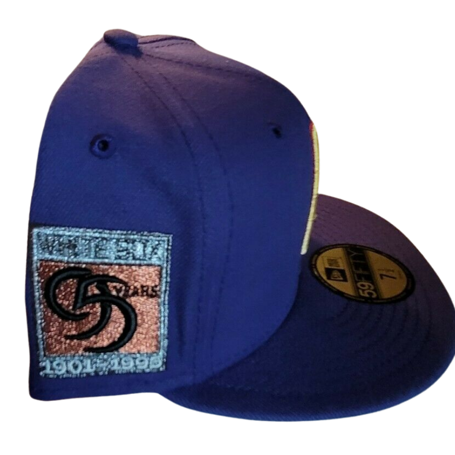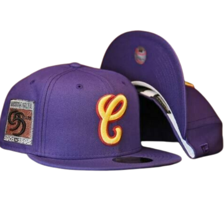 The New Era Chicago White Sox "Castlevania Symphony of The Night" inspired fitted hat is a My Fitteds exclusive drop. The fitted features a purple six panel structured high crown, embroidered eyelets and fabric squatchee button. The flat bill and undervisor of the fitted is also purple with a white sweatband. The front panel features the Chicago White Sox logo embroidered in yellow, outlined in red threads (similar to the wordmark on Castevania video game cover). The right panel features a 95 Years side patch embroidery.