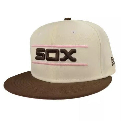 This New Era Chicago White Sox Ice Cream Dreams 59FIFTY fitted hat has a cream six panel structured high crown and embroidered eyelets with a mocha fabric squatchee button and flat bill with a pink undervisor and white sweatband. The front panel features the Chicago White sox logo embroidered in mocha and pink stitching.