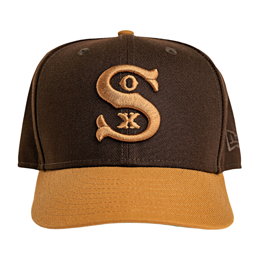 This Chicago White Sox fitted hat was released by Burdeens Chicago. The fitted has a burnt wood six panel structured high crown and embroidered eyelets with a light bronze fabric squatchee button. The fitted cap also has a light bronze flat bill. The front panel features the number the Chicago White Sox with no visble side patch on the right panel.