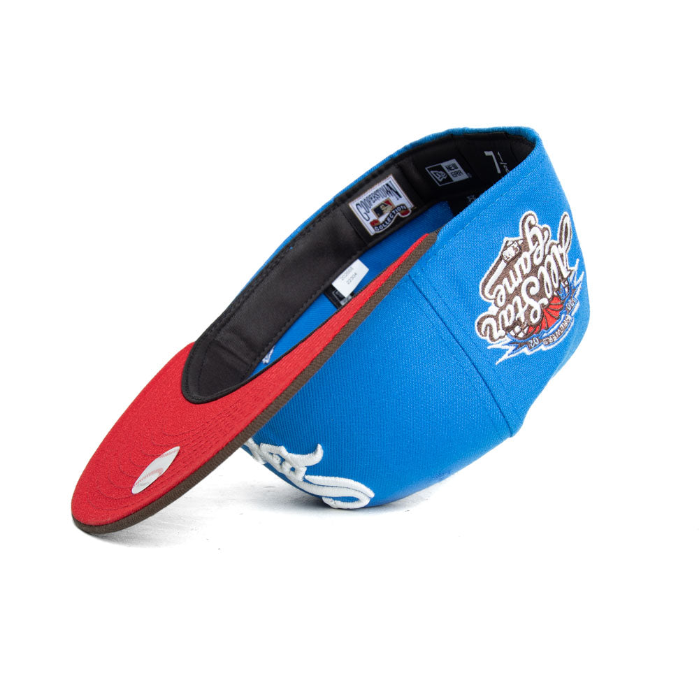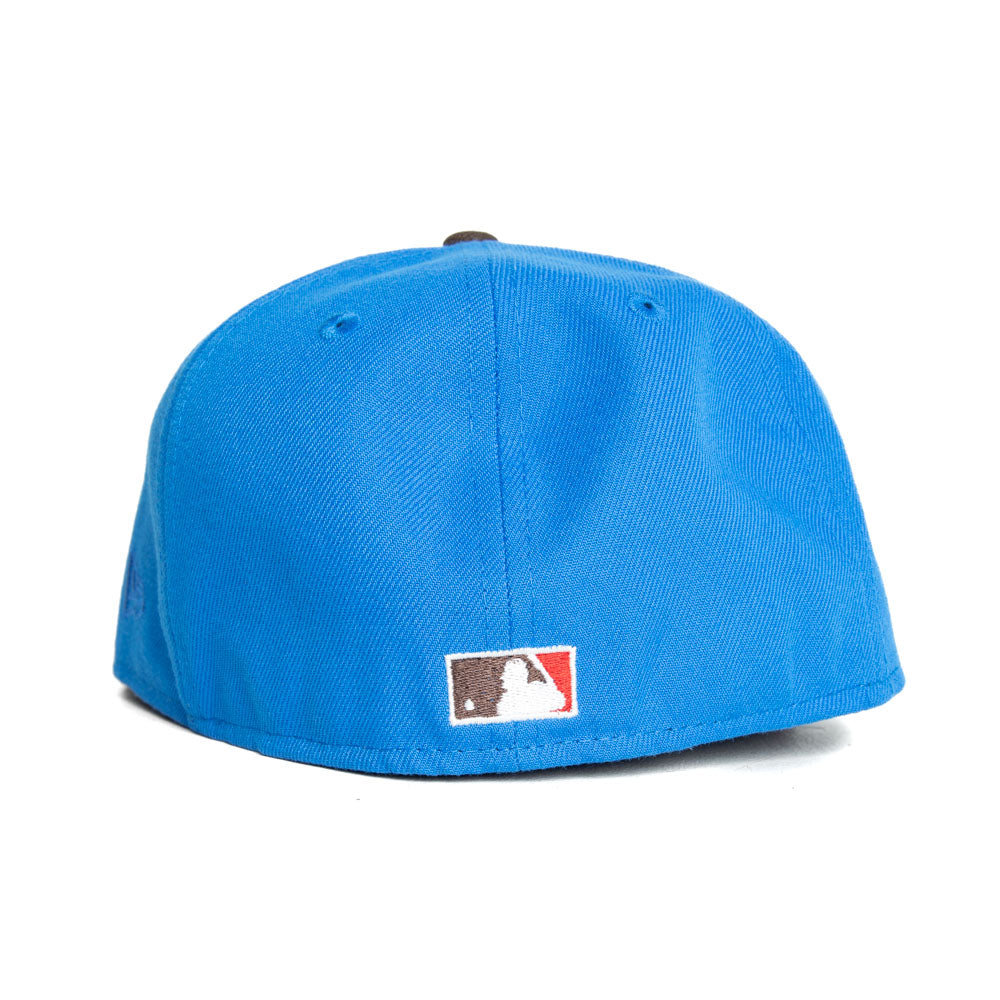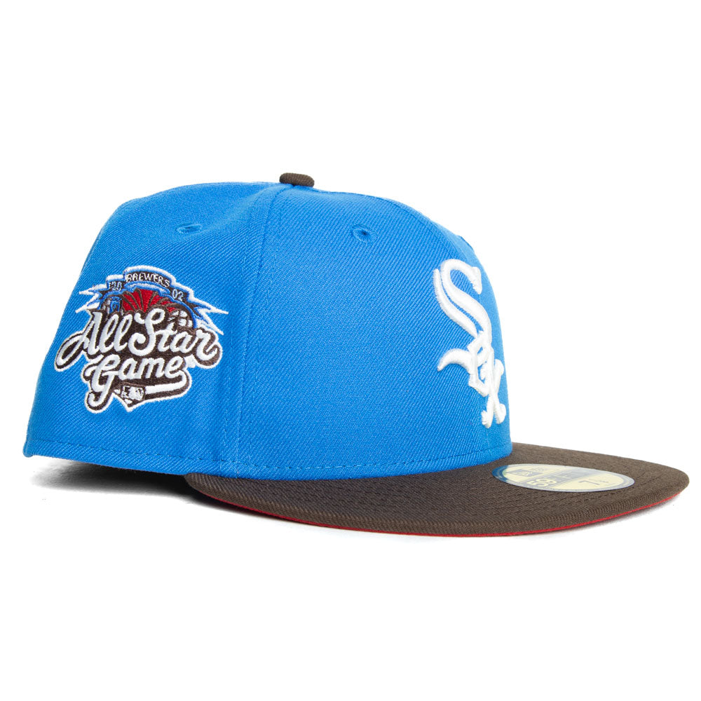 This Chicago White Sox 59FIFTY fitted hat was released by Capanova. The fitted has a blue six panel structured high crown and embroidered eyelets with a walnut brown tone fabric squatchee button and flat bill with an icy undervisor. The front panel features the Chicago White Sox logo embroidery with a side patch on the right panel. The left panel of the fitted displays the New Era logo and the official MLB Batterman embroidery on the rear crown.