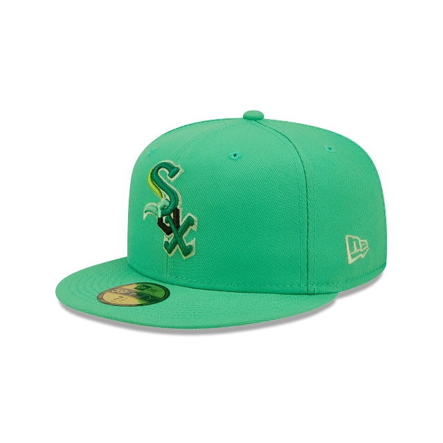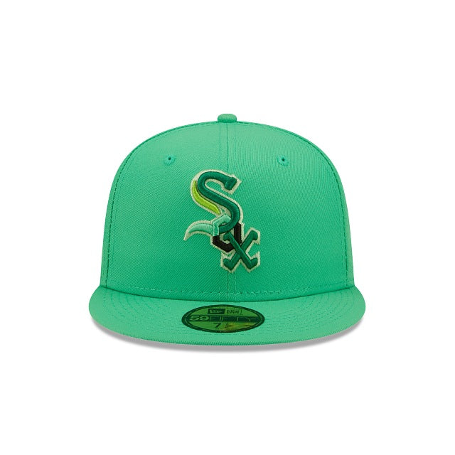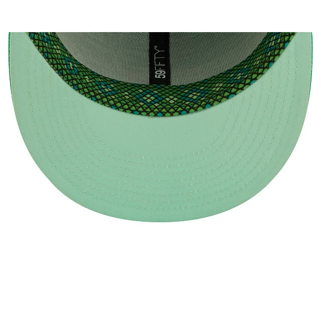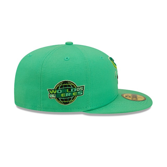 The Chicago White Sox Snakeskin 59FIFTY Fitted Cap features an embroidered White Sox multi-colored logo at the front panels, a 2005 World Series patch at the right-wear side, and a matching MLB Batterman logo at the rear. Additional details include a snakeskin inspired inner sweatband and green undervisor.