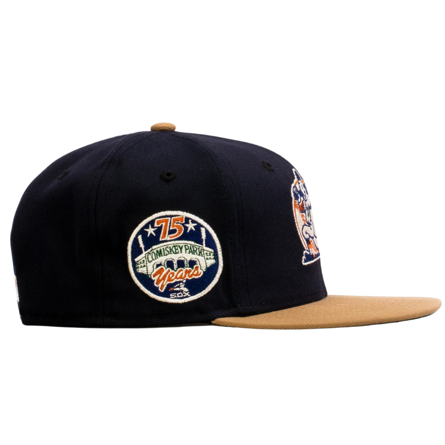 This New Era Chicago White Sox 'Varsity Blues' 2023 59FIFTY Fitted Hat was released by Shoe Palace. The fitted has a navy blue six panel structured high crown and embroidered eyelets with a khaki fabric squatchee button. The flat bill of the fitted cap is also khaki with a pine green undervisor and black sweatband. The front panel features the Chicago White Sox logo embroidery and a side patch on the right panel. The left panel of the fitted displays the New Era logo and the MLB