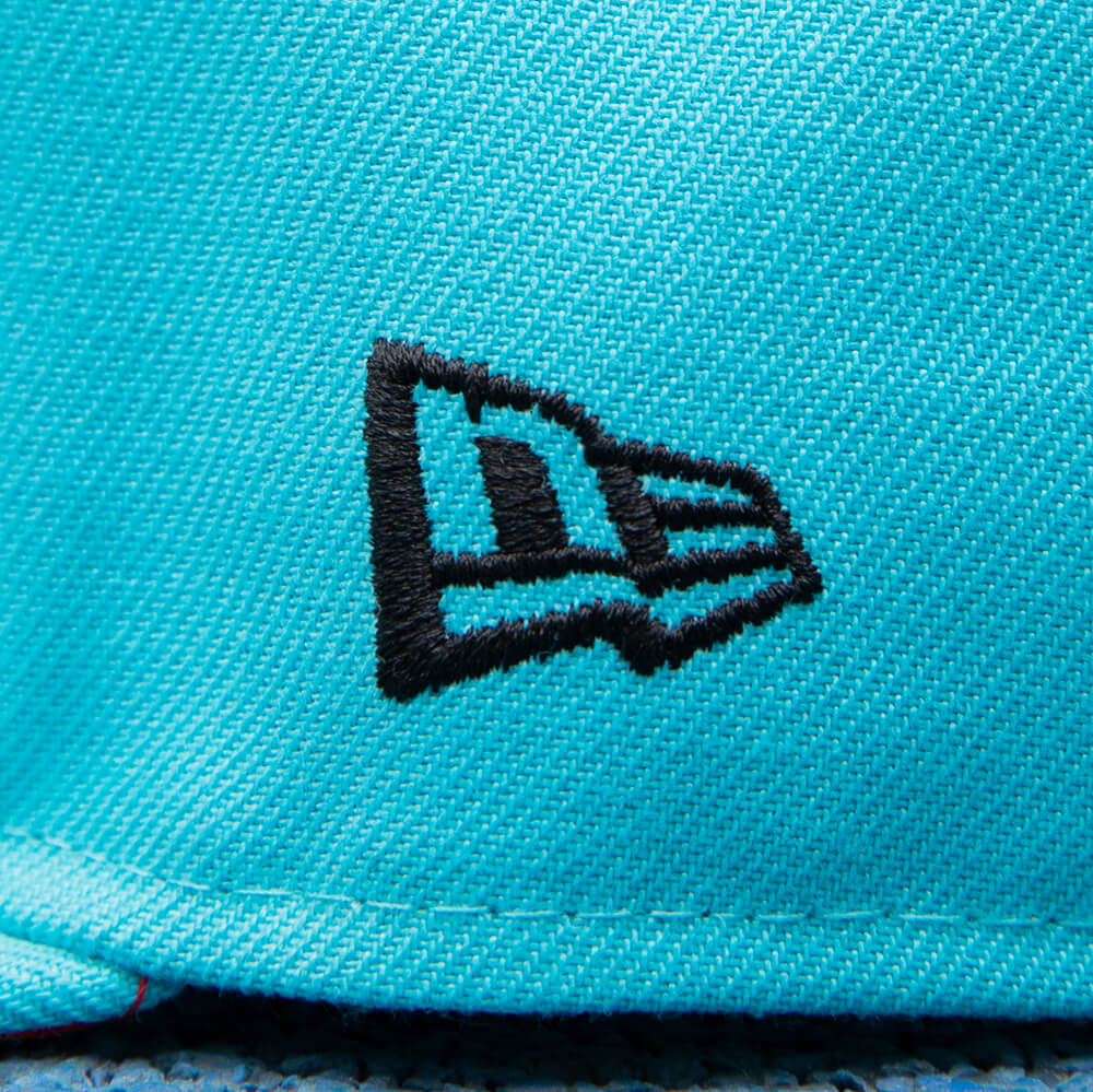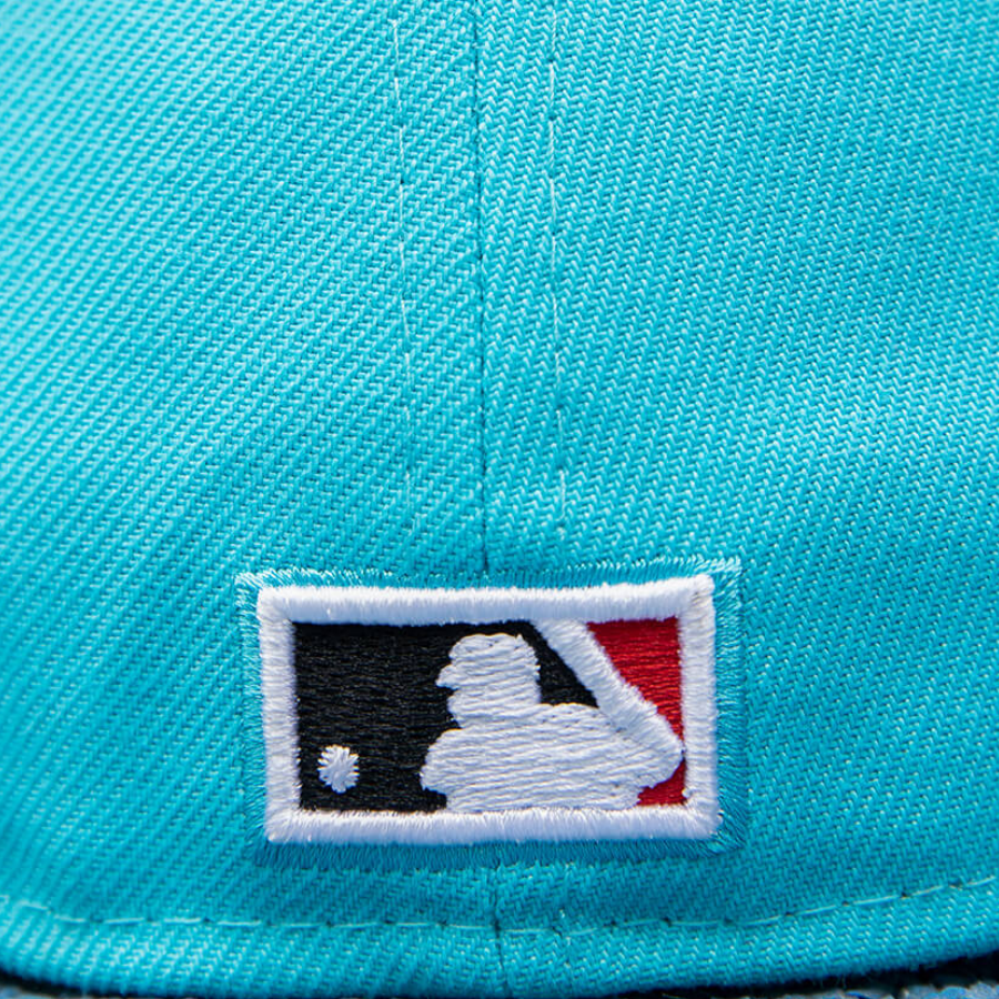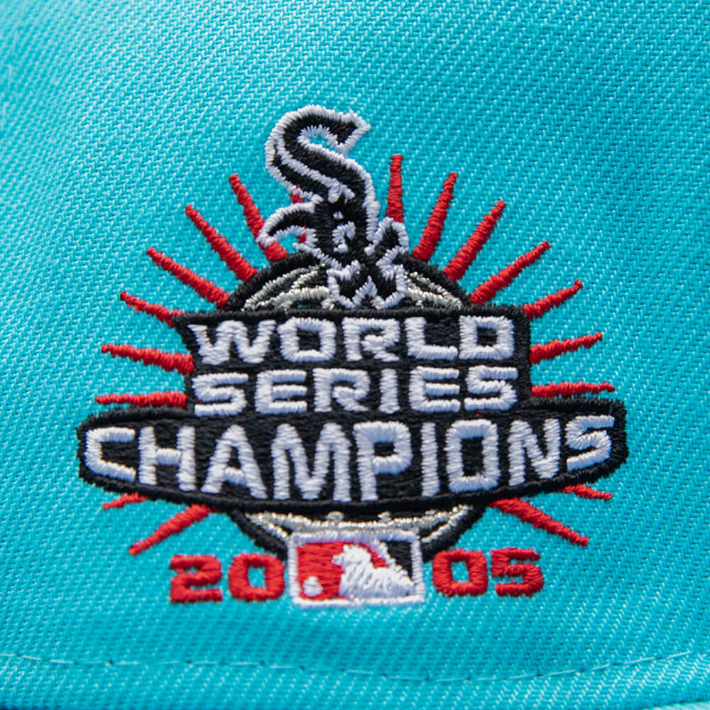 This New Era Chicago White Sox 59FIFTY fitted hat has a vice blue six panel structured high crown, embroidered eyelets and fabric squatchee button. The fitted cap also has a vice blue flat bill with a scarlet red undervisor and black sweatband. The front panel features the Chicago White Sox logo embroidery and a 2005 World Series side patch embroidery on the right panel. The rear crown of the fitted features the official MLB Batterman logo.
