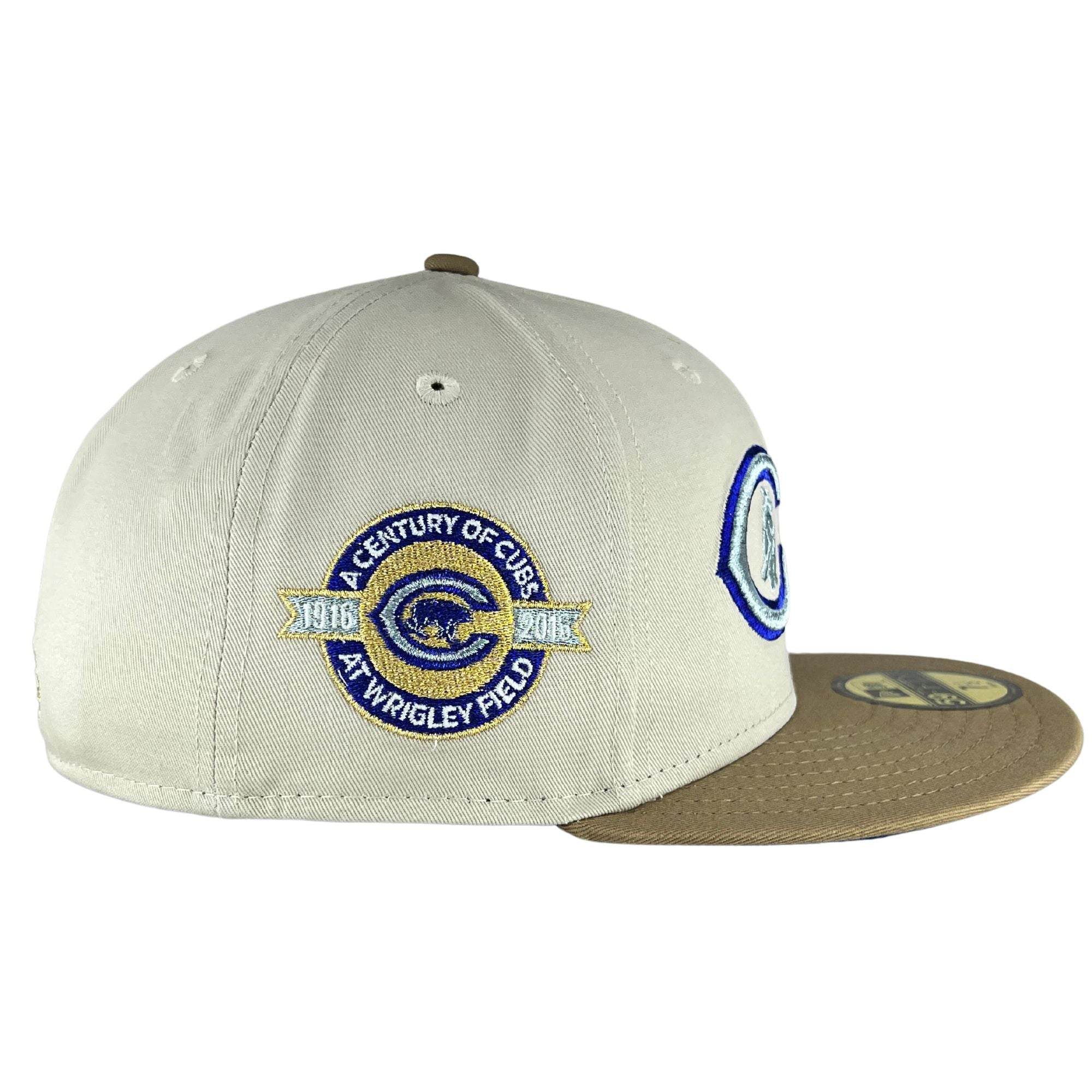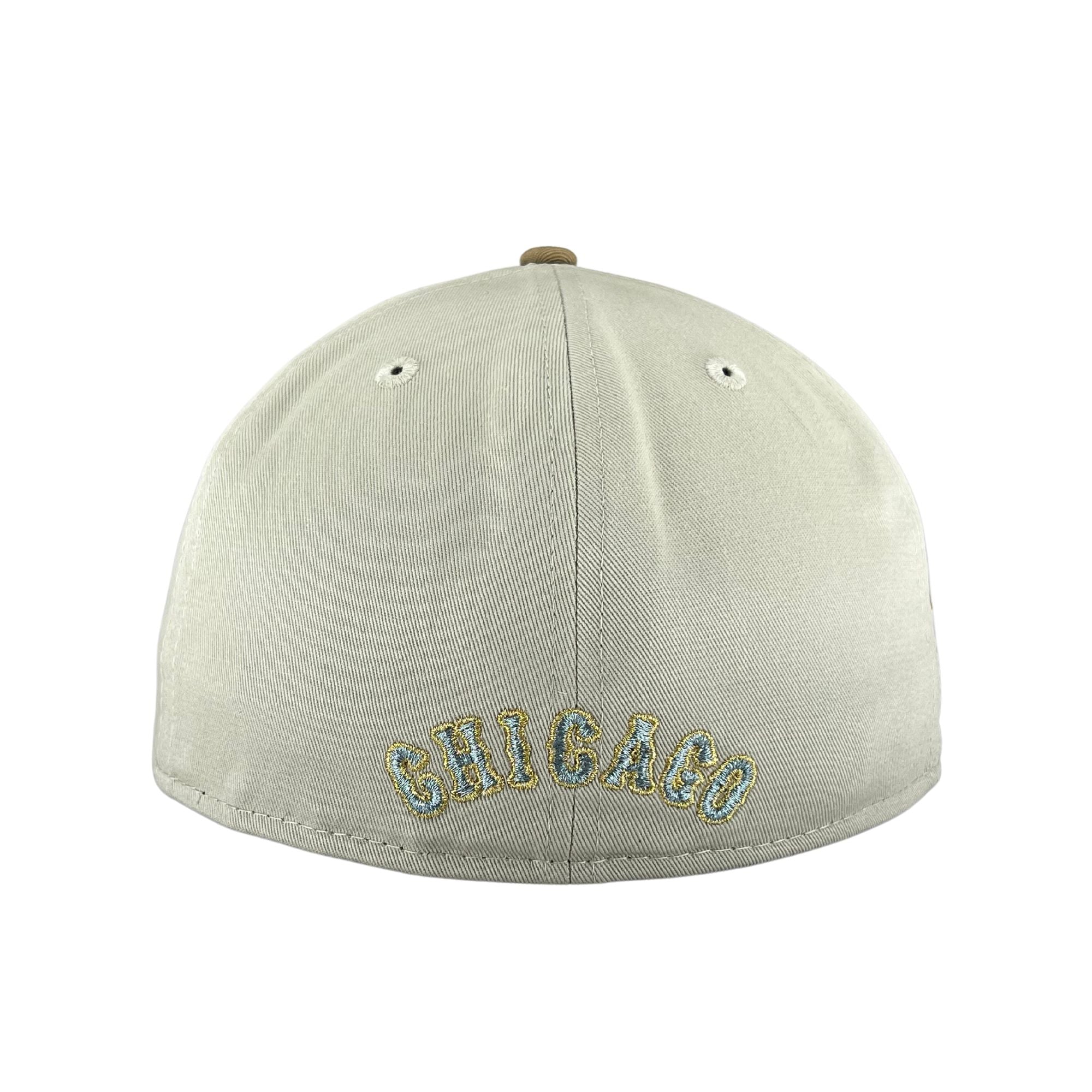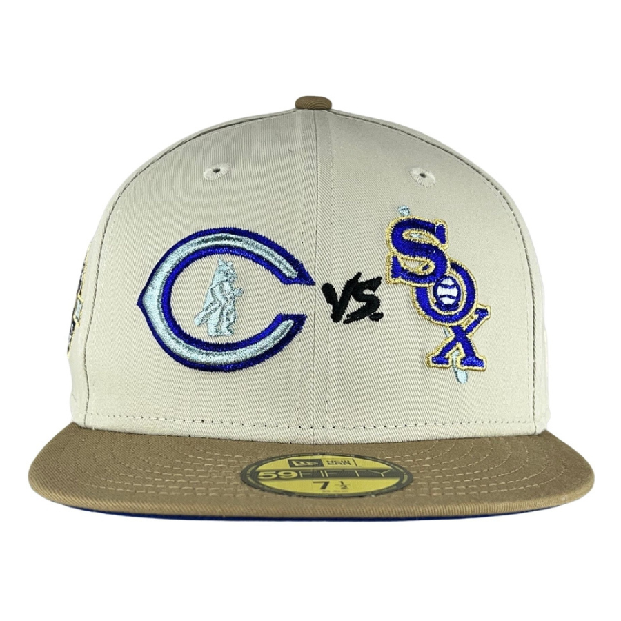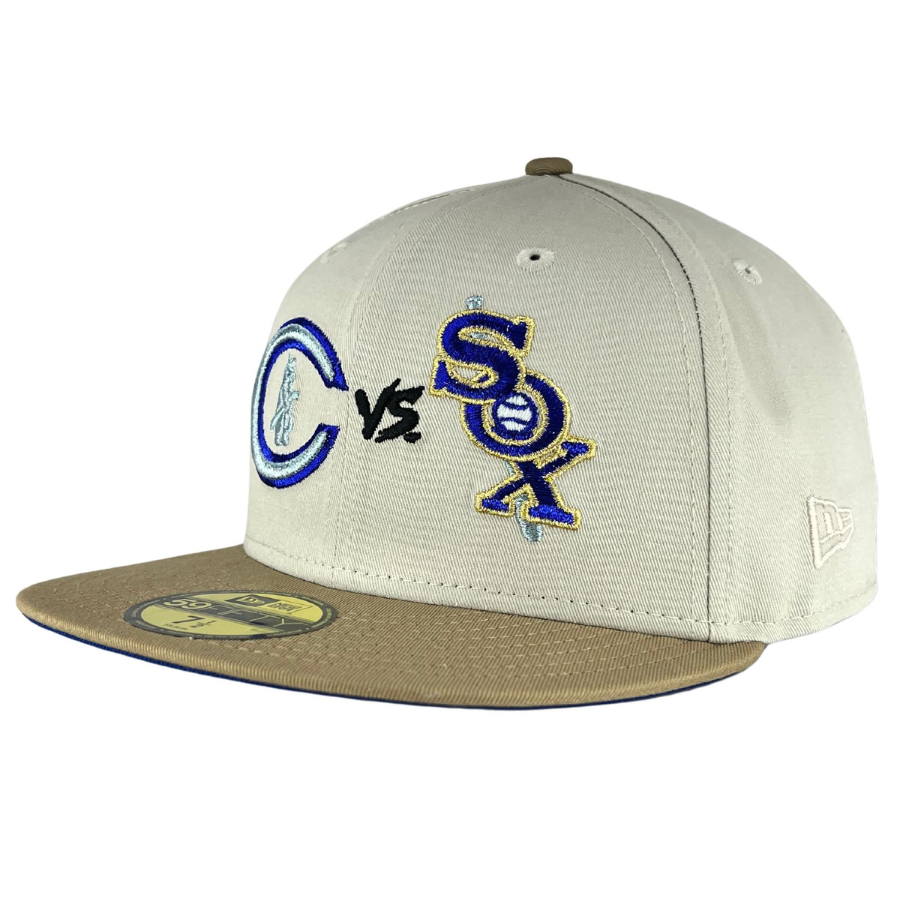 This Chicago White Sox fitted hat was released by Clark Street Sports. The fitted has a stone six panel structured high crown and embroidered eyelets with a tan fabric squatchee button. The flat bill of the cap is tan with a blue undervisor and black sweatband. The front panel features the Chicago White Sox logo embroidery and a Wrigley Field side patch embroidery on the right panel. The left panel of the fitted displays the New Era logo and the official MLB Batterman logo embroidery on the rear crown.