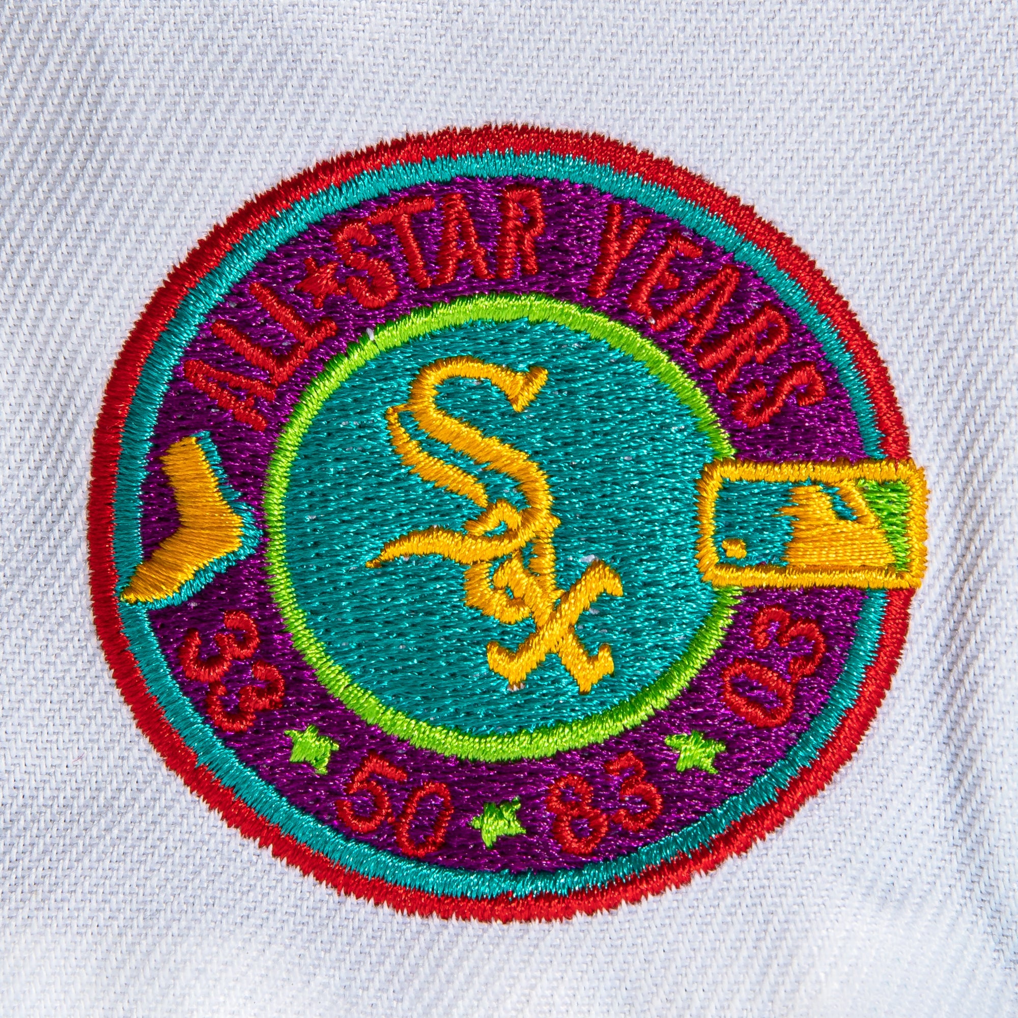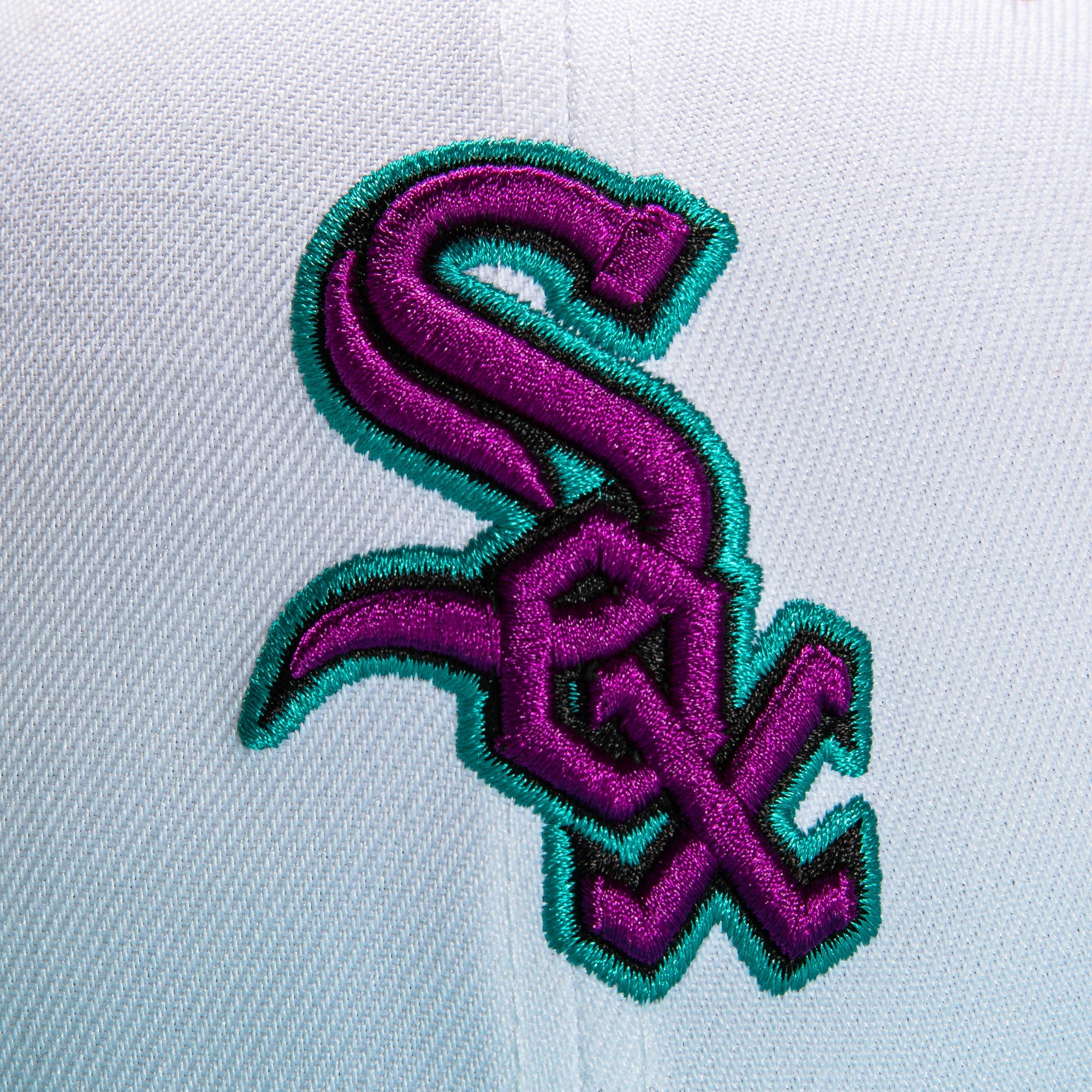 This New Era Dogtown Chicago White Sox All Star Game Years 59FIFTY Fitted Hat has a white six panel structured high crown and embroidered eyelets with a teal fabric squatchee button. The fitted cap has a teal flat bill with a lime green undervisor. The front panel features the Chicago White Sox logo embroidery and a side patch embroidery on the right panel. The left panel of the fitted displays the New Era logo and the official MLB logo embroidery on the rear crown.