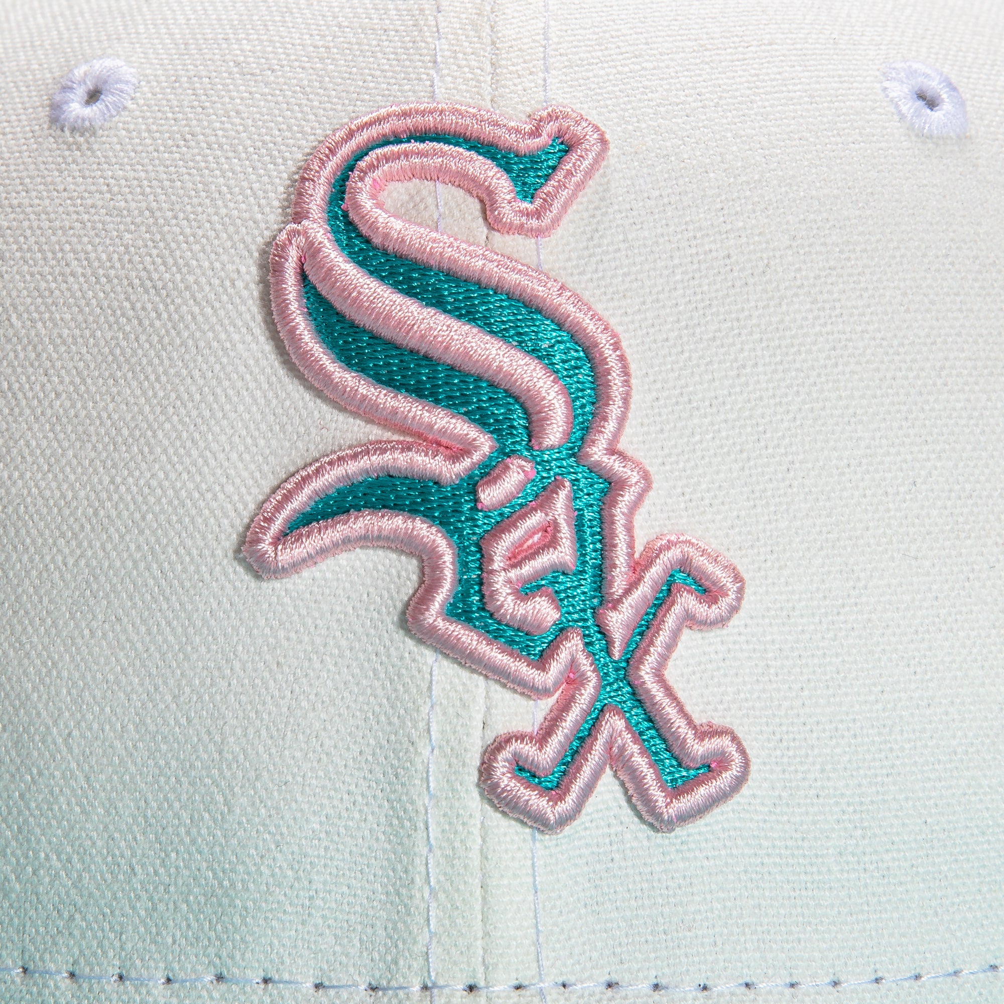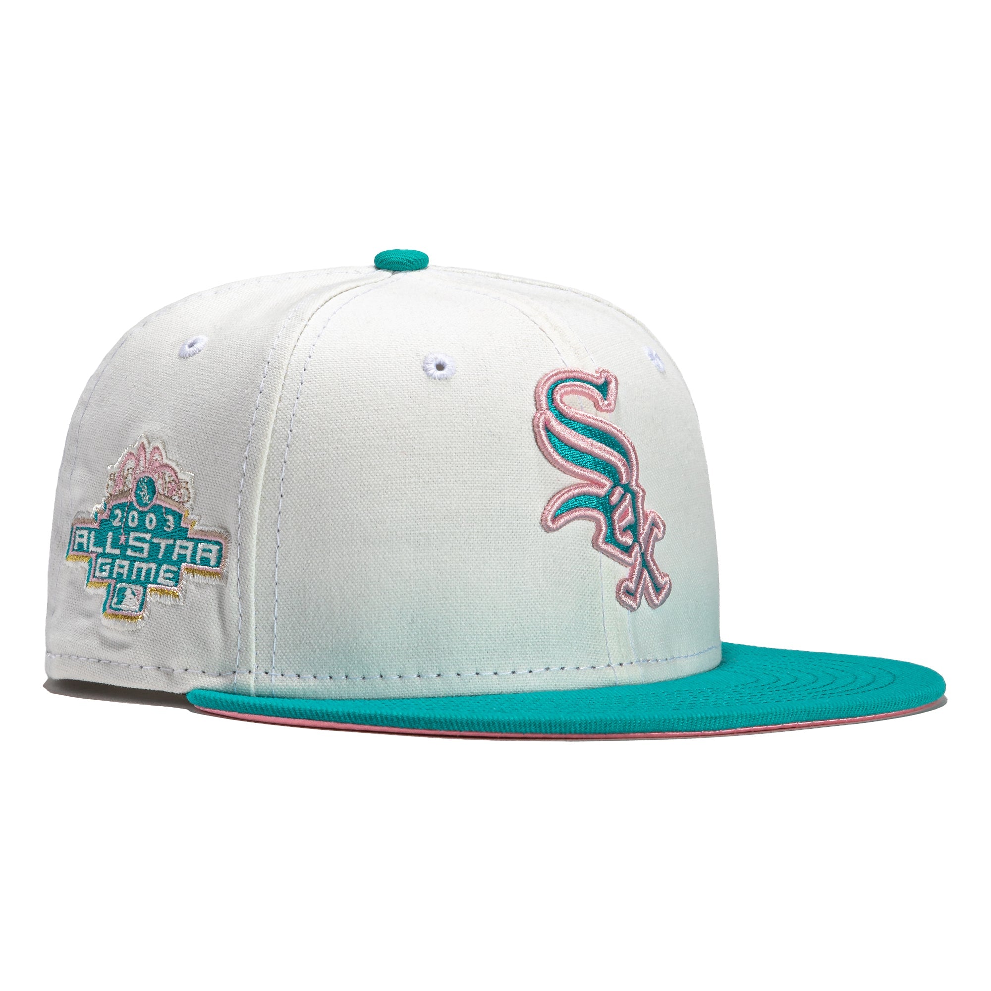 This New Era Monaco Chicago White Sox 2003 All-Star Game 59FIFTY Fitted Hat is a Hat Club exclusive. The fitted has a stone six panel structured high crown and embroidered eyelets with a teal fabric squatchee button. The fitted cap also has a teal flat bill with a pink satin undervisor. The front panel features the Chicago White Sox logo embroidery and a 2003 ASG side patch embroidery on the right panel. The left panel of the fitted displays the New Era logo and the official MLB logo embroidery on the rear crown.