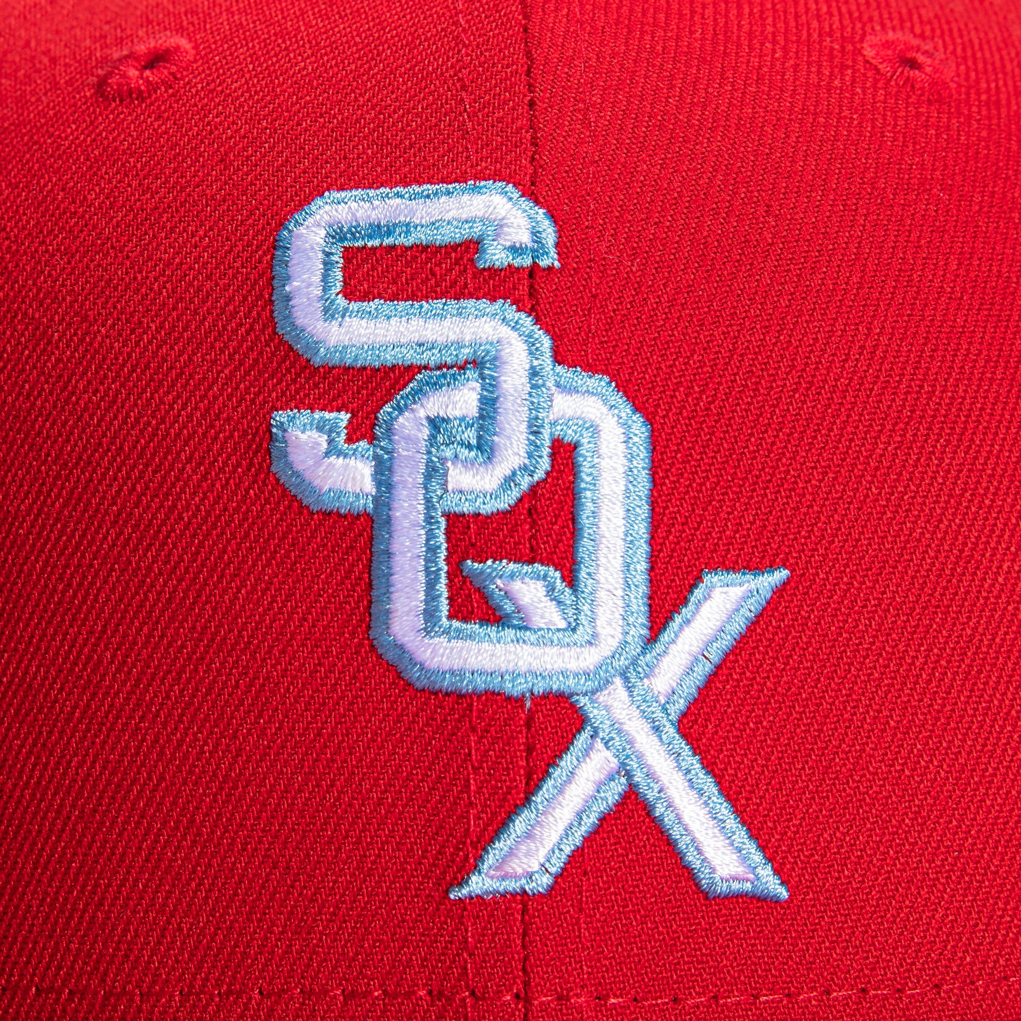 This New Era Red Icy Chicago White Sox 1960 59FIFTY Fitted Hat was released by Hat Club. The fitted has a red six panel structured high crown, embroidered eyelets with and fabric squatchee button. The fitted also has a red flat bill with an "icy" (light blue) undervisor. The front panel features the Chicago White Sox logo embroidery and a side patch embroidery on the right panel. The left panel of the fitted displays the New Era logo and the official MLB logo embroidery on the rear crown.