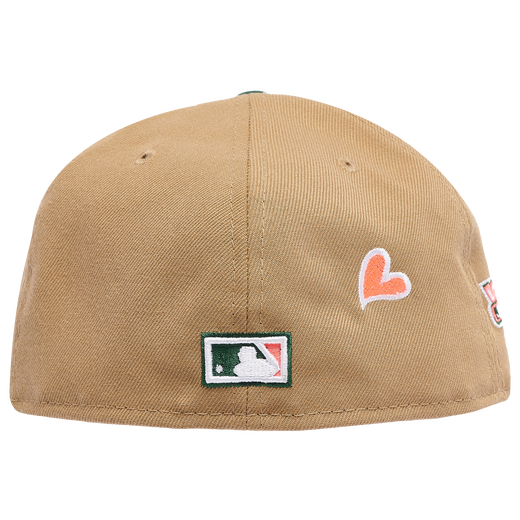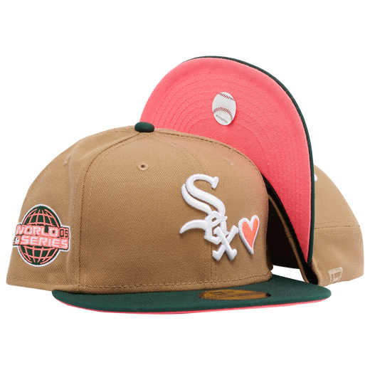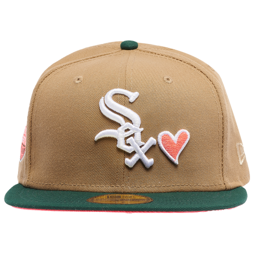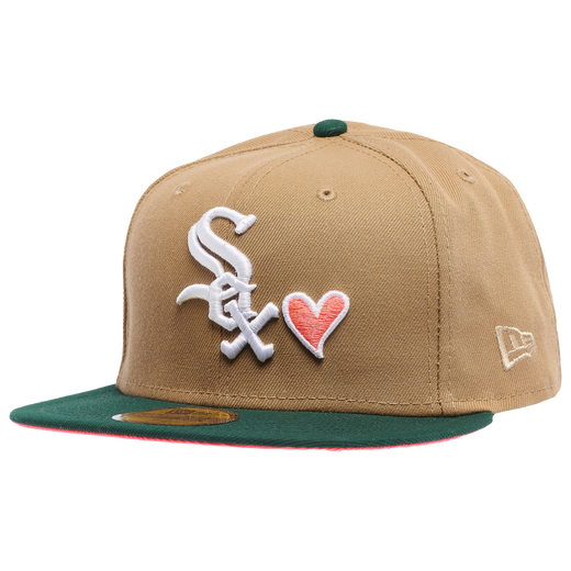 This New Era Chicago White Sox 59FIFTY fitted hat was released by Champs Sports. The fitted has a tan six panel structured high crown and embroidered eyelets with a pine greeb fabric squatchee button. The fitted cap also has a pine green flat bill with a hot pink undervisor and black sweatband. The front panel features the Chicago White Sox logo embroidery with a pink heart and a side patch embroidery on the right panel. The left panel of the fitted displays the New Era logo and the official MLB logo embroidery on the rear crown.