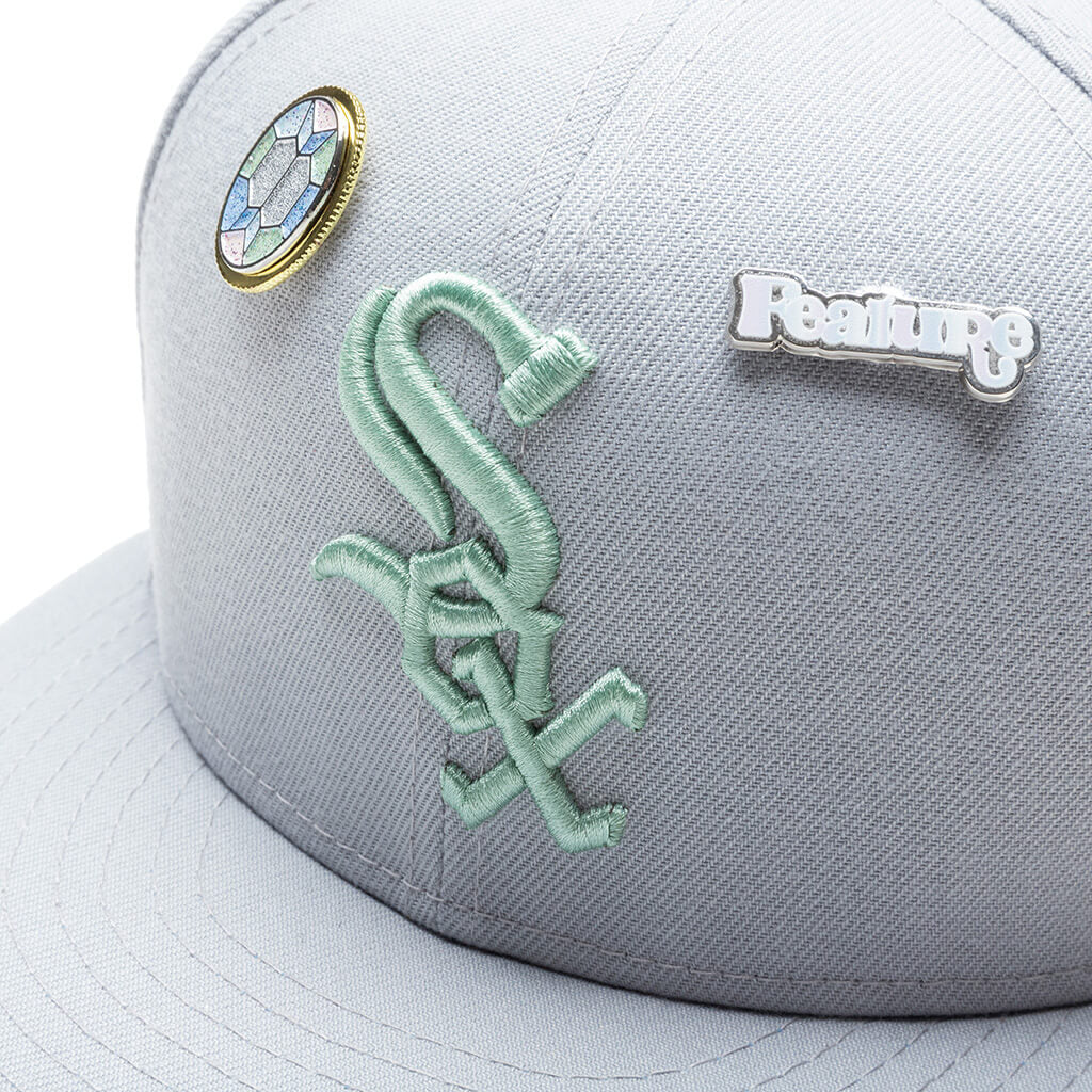 This New Era x Feature Chicago White Sox "Opal" 59FIFTY Fitted Hat has a light grey six panel structured high crown and embroidered eyelets with a sky blue fabric squatchee button. The fitted cap has a light grey flat bill with a sky blue undervisor and white sweatband. The front panel features the Chicago White Sox logo embroidery. The left panel of the fitted displays the New Era logo and the official MLB logo embroidery on the rear crown.