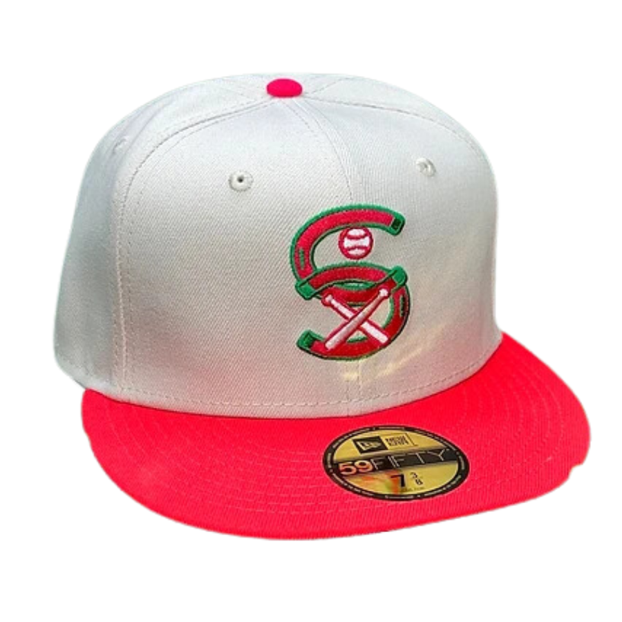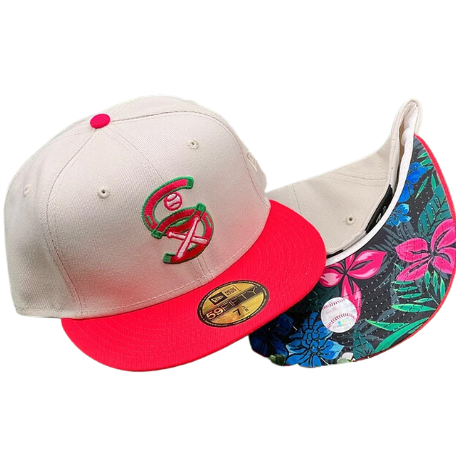 This New Era Chicago White Sox 59FIFTY fitted hat was released by Grand Stand. The fitted has a white six panel structured high crown and embroidered eyelets with a fluorescent pink fabric squatchee button and flat bill. The front panel features the Chicago White Sox logo embroidery with a cross bat and baseball. The fitted also includes a floral bottom undervisor.