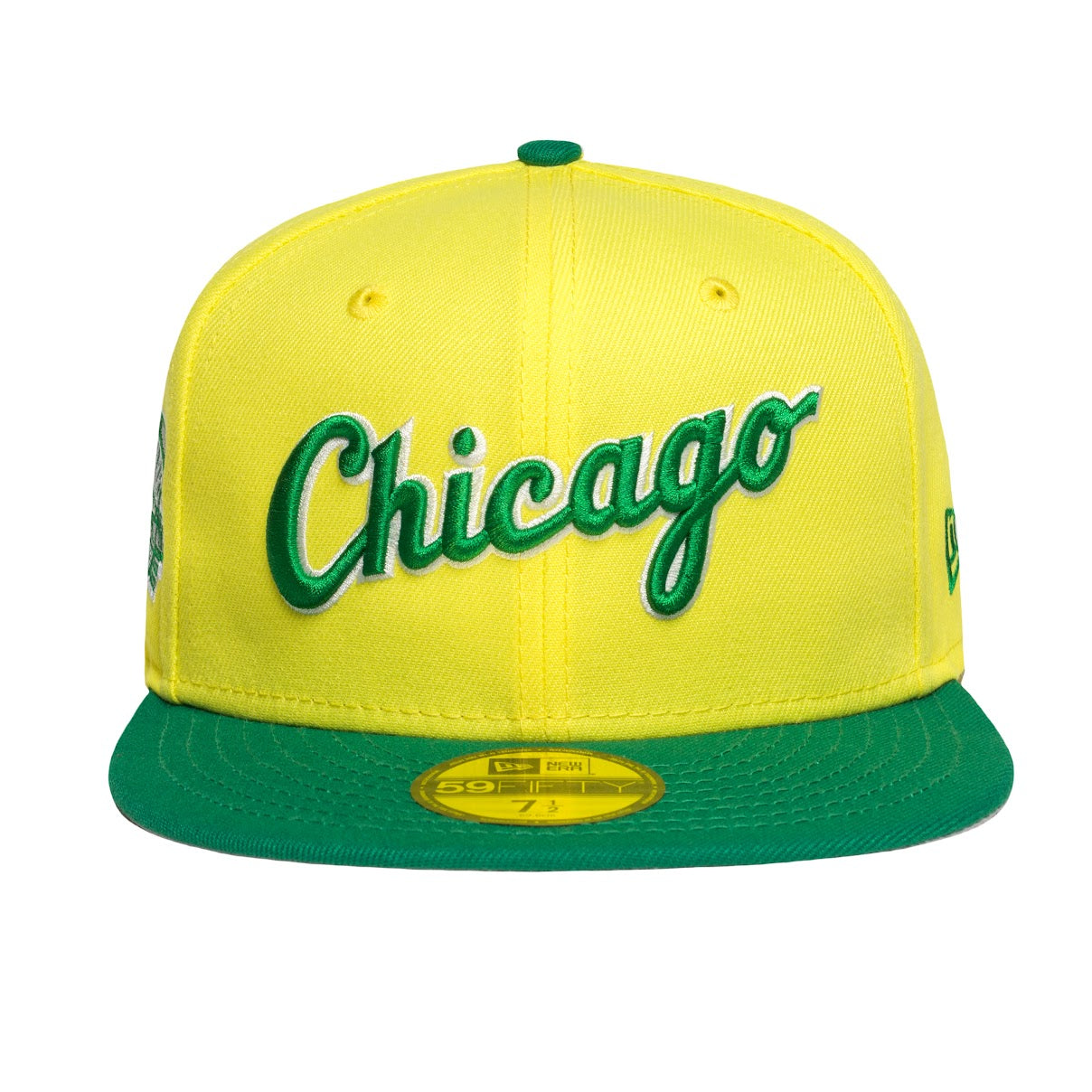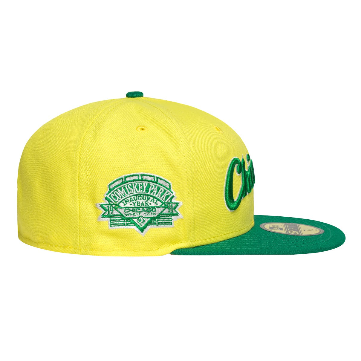 This New Era x Leaders 1354 Chicago White Sox "Key Lime Pie" Comiskey Park Inaugural Year 59FIFTY Fitted Hat has a yellow six panel structured high crown and embroidered eyelets with a green fabric squatchee button. The fitted cap has a green flat bill. The front panel features the Chicago White Sox logo embroidery and a Comiskey Park side patch embroidery on the right panel. The left panel of the fitted displays the New Era logo and the official MLB logo embroidery on the rear crown.