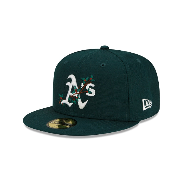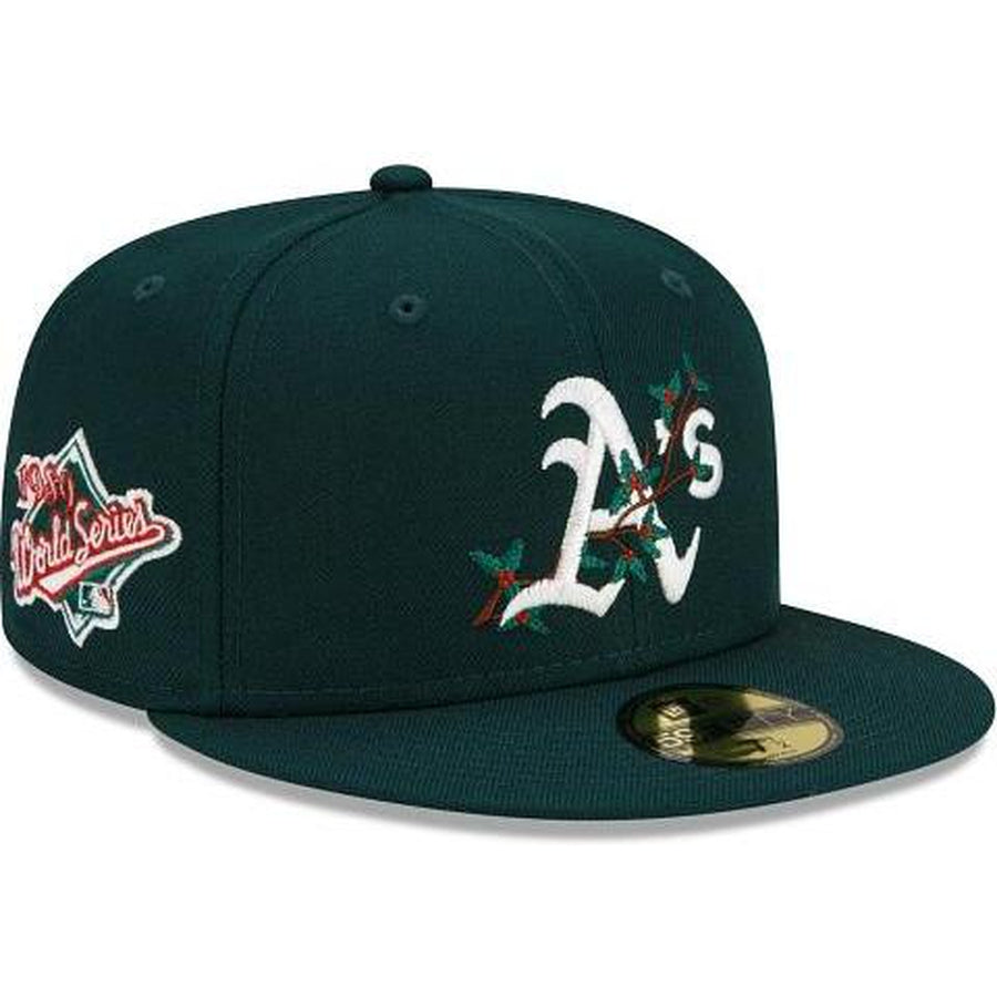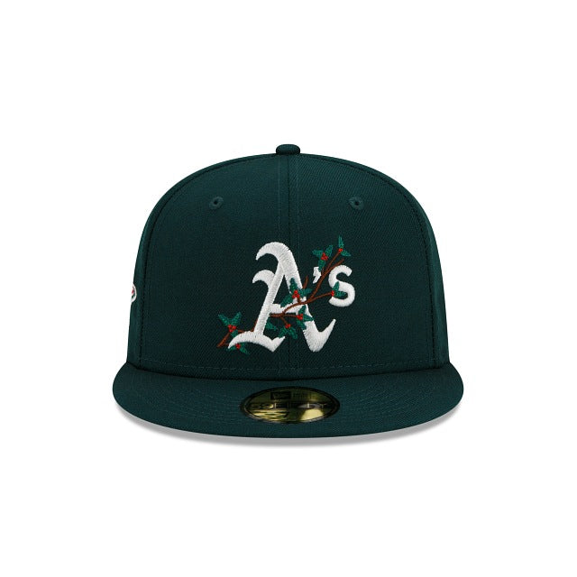 Unwrap your new favorite Fitted with the Oakland Athletics Holly 59FIFTY Fitted Cap featuring an embroidered Athletics logo intertwined with seasonal mistletoe leaves at the front panels, a World Series patch at the right-wear side and a team logo embroidered at the rear.