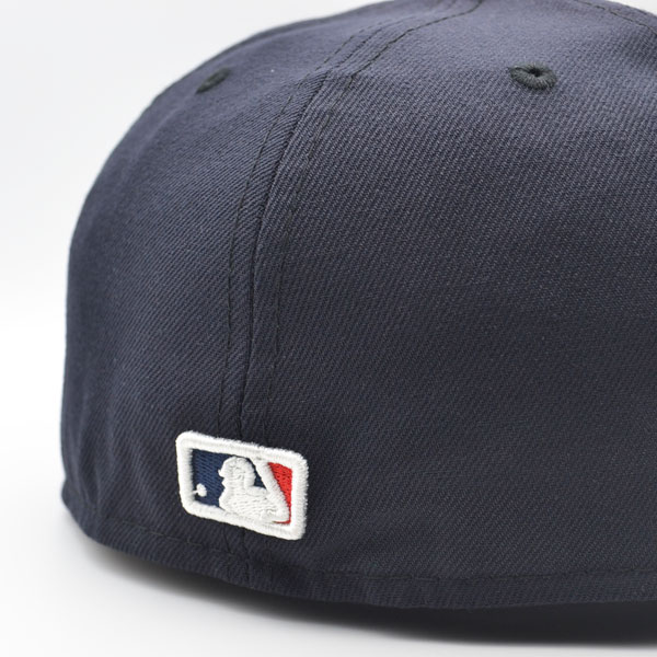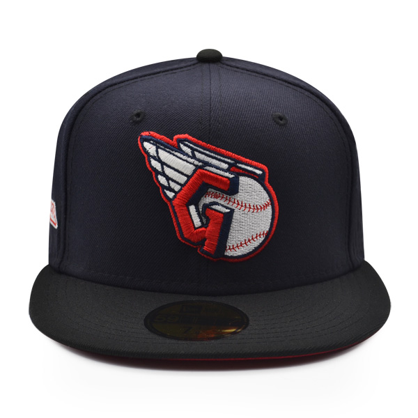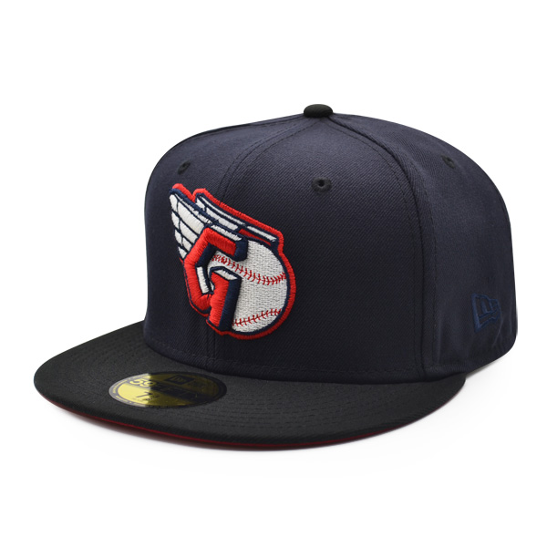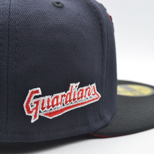 This New Era Cleveland Guardians Navy Blue /Red UV 59FIFTY fitted hat has a navy blue six panel structured high crown and embroidered eyelets with a navy blue fabric squatchee button located at the top of the crown. The flat brim of the fitted is navy blue with a red undervisor. The front panel features the Cleveland Guardians logo embroidered in red and white stitching with a team side patch embroidery on the right-wear side in the same colorway.