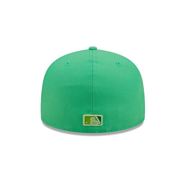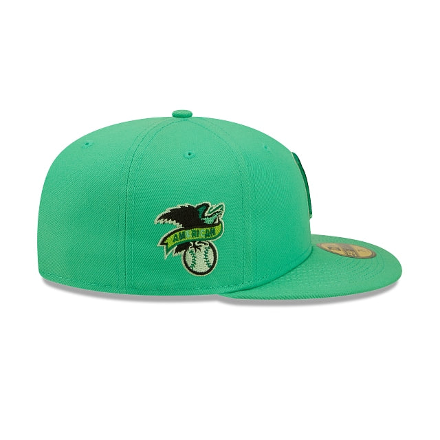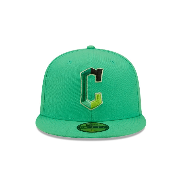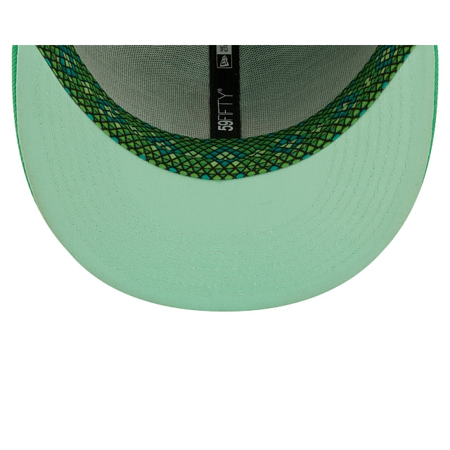The Cleveland Guardians Snakeskin 59FIFTY Fitted Cap features an embroidered Guardians multi-colored logo at the front panels, an American League patch at the right-wear side, and a matching MLB Batterman logo at the rear. Additional details include a snakeskin inspired inner sweatband and green undervisor.