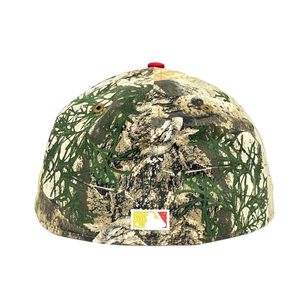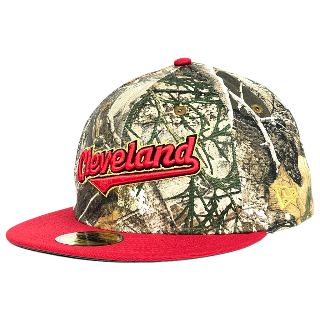 This New Era 59FIFTY Cleveland Indians fitted hat was released by Prociety. The fitted has a realtree six panel structured high crown and embroidered eyelets with a red fabric squatchee button and flat bill with a kelly green bottom undervisor. The front panel features the Cleveland Indians script logo embroidery and 1997 All-Star Game embroidered side patch on the right panel.