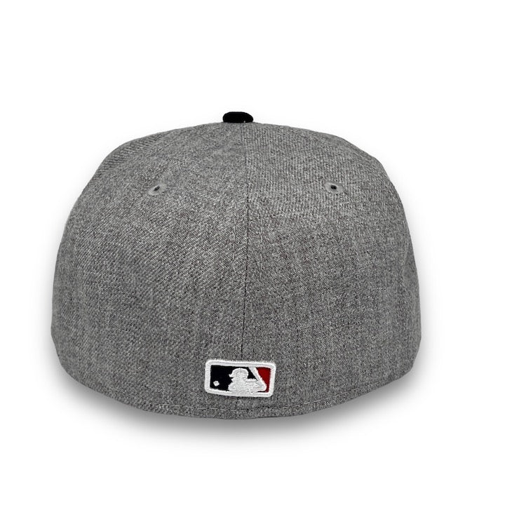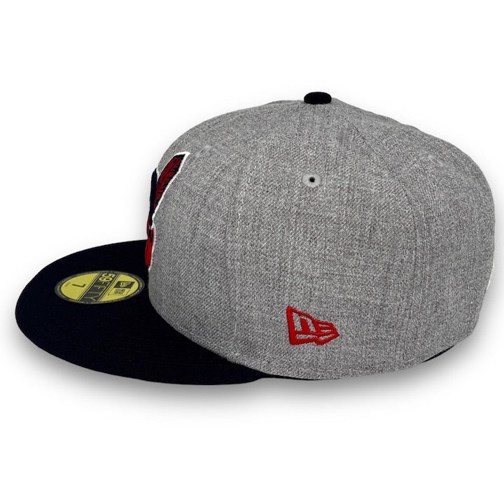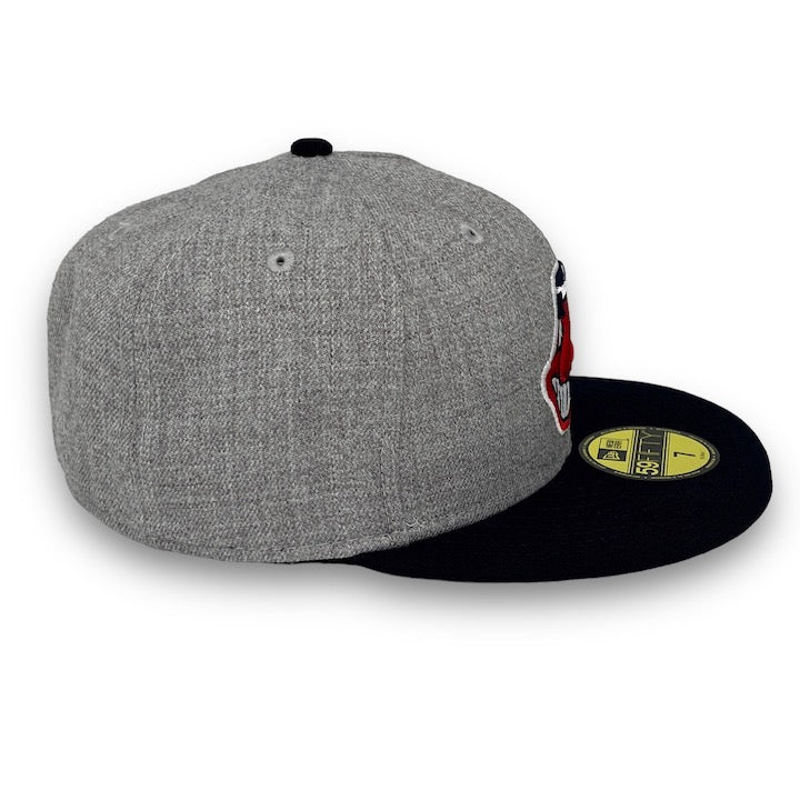 This New Era Cleveland Indians (now the Cleveland Guardians) fitted hat has a heather gray six panel structured high crown and embroidered eyelets with a navy fabric squatchee button. The fitted has a gray bottom undervisor and a black sweatband. The front panel features the Chief Wahoo logo embroidery.