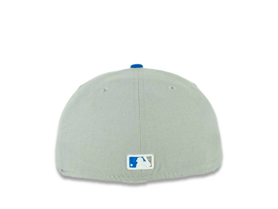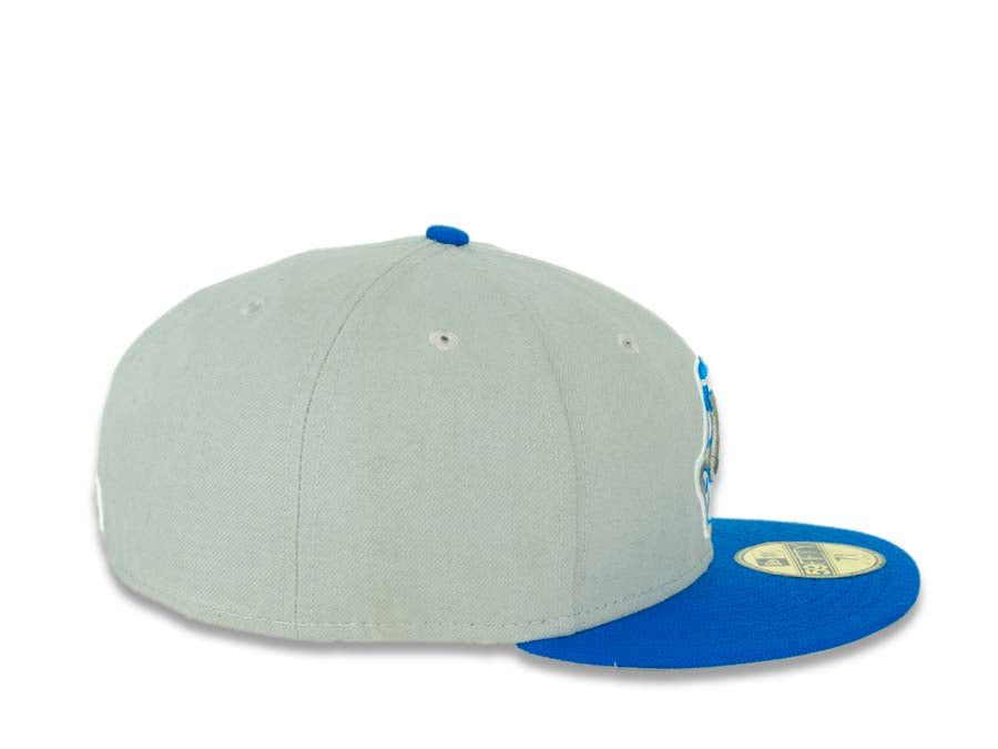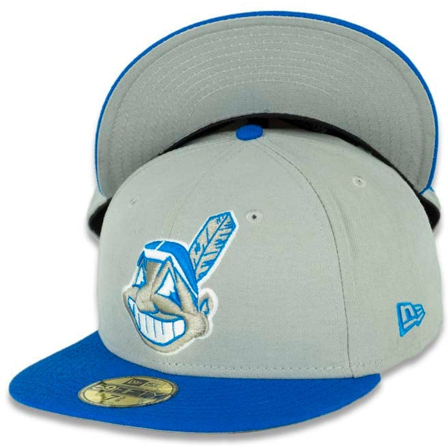 This New Era Cleveland Indians Light Gray/Blue Chief Wahoo 59FIFTY Fitted Hat has a light gray six panel structured high crown and embroidered eyelets with a blue fabric squatchee button. The fitted cap has a blue flat bill with a grey undervisor. The front panel features the Cleveland Indians former "Chief Wahoo" logo embroidery. The left panel of the fitted displays the New Era logo and the official MLB logo embroidery on the rear crown.