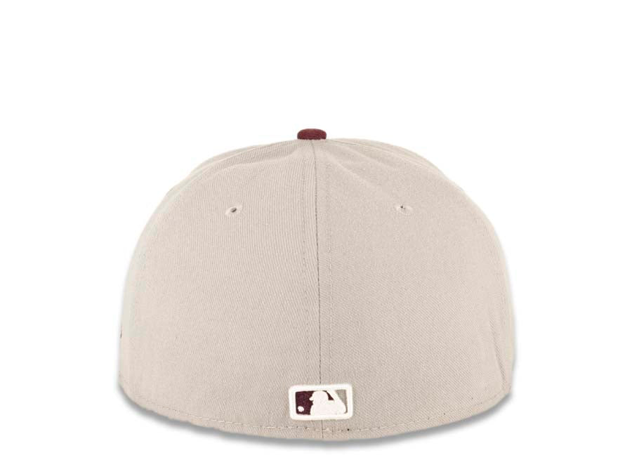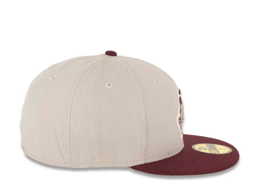 This New Era Cleveland Indians Light Gray/Maroon Chief Wahoo 59FIFTY Fitted Hat has a light gray six panel structured high crown and embroidered eyelets with a maroon fabric squatchee button. The fitted cap has a maroon flat bill with a gray undervisor. The front panel features the Cleveland Indians former "Chief Wahoo" logo embroidery. The left panel of the fitted displays the New Era logo and the official MLB logo embroidery on the rear crown.