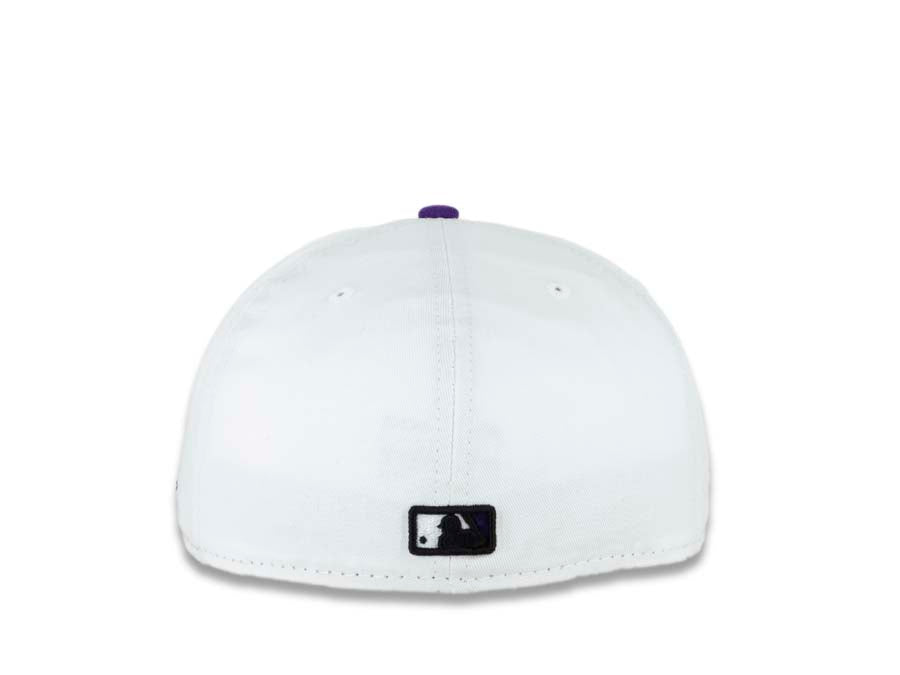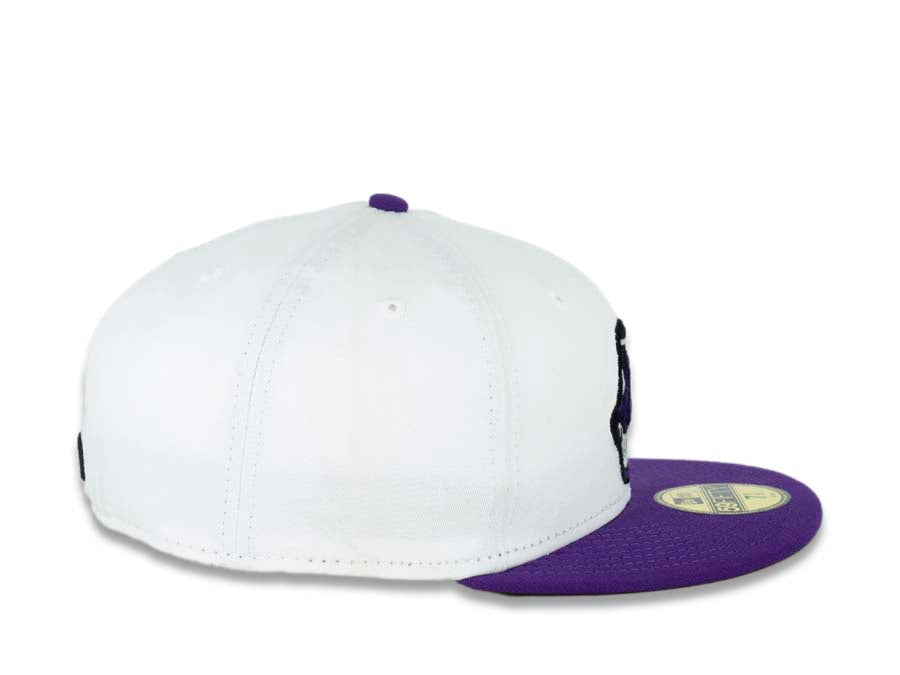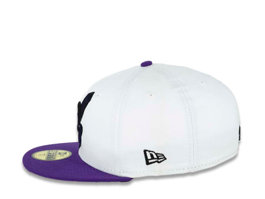 This New Era Cleveland Indians White/Purple Chief Wahoo 59FIFTY Fitted Hat has a white six panel structured high crown and embroidered eyelets with a purple fabric squatchee button. The fitted cap has a purple flat bill. The front panel features the Cleveland Indians former "Chief Wahoo" logo embroidery. The left panel of the fitted displays the New Era logo and the official MLB logo embroidery on the rear crown.