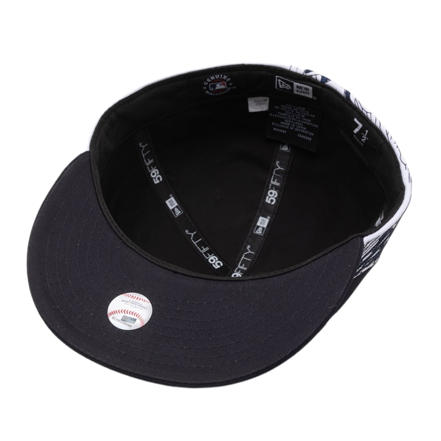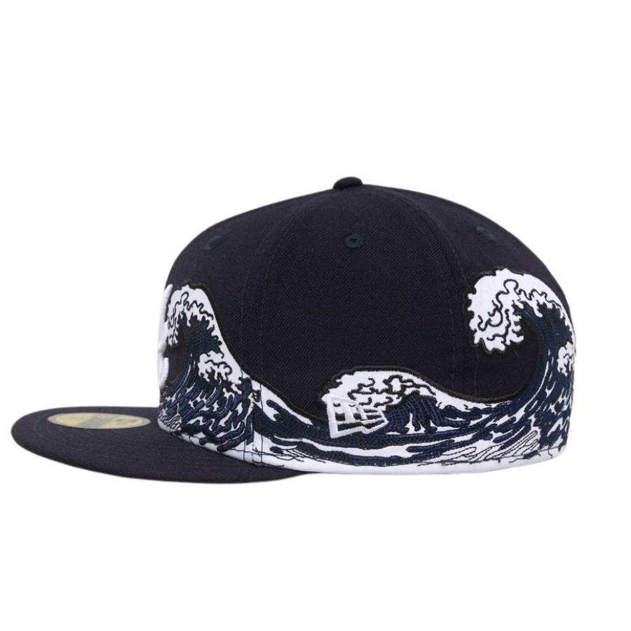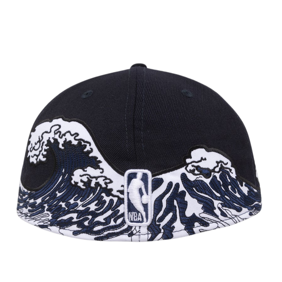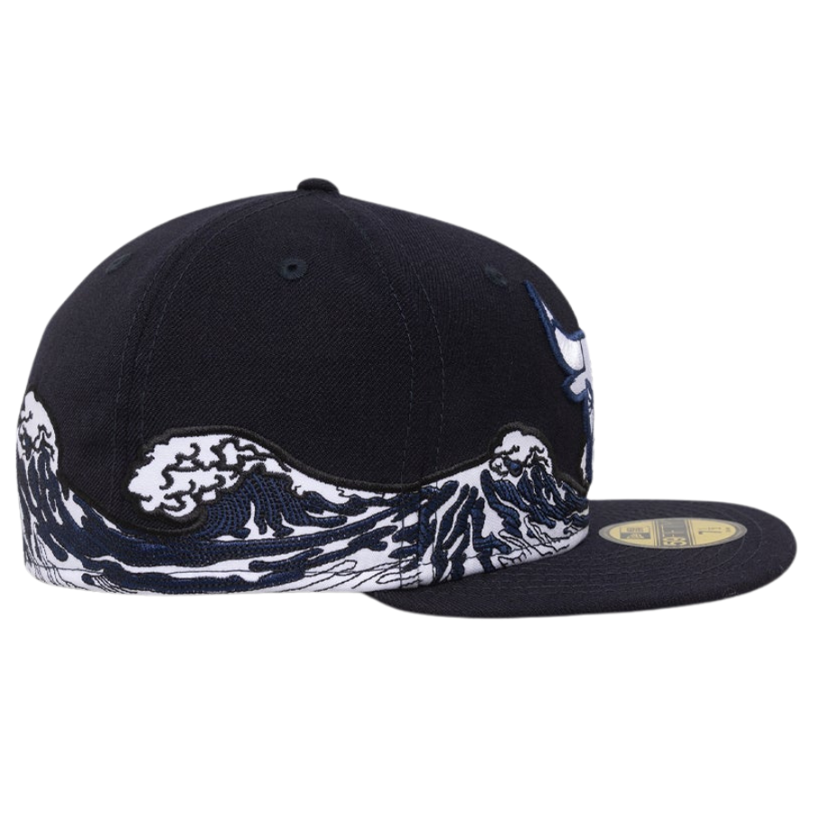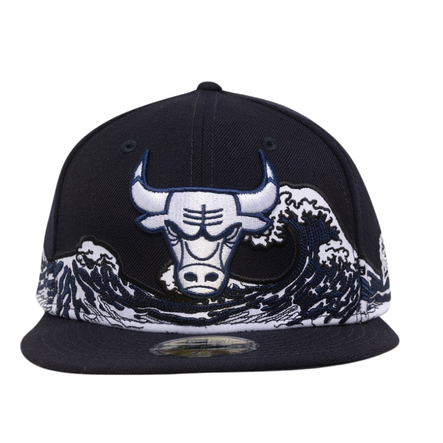 This Chicago Bulls fitted hat was released by Culture Kings. The fitted has a navy blue six panel structured high crown and embroidered eyelets with a navy blue fabric squatchee button. The flat bill of the cap is also navy blue as well as the under brim. The front panel features the Chicago Bulls logo embroidery and an ocean wave graphic around the circumference of the dome. The left panel of the fitted displays the New Era logo.