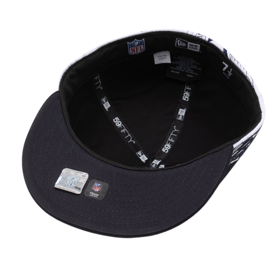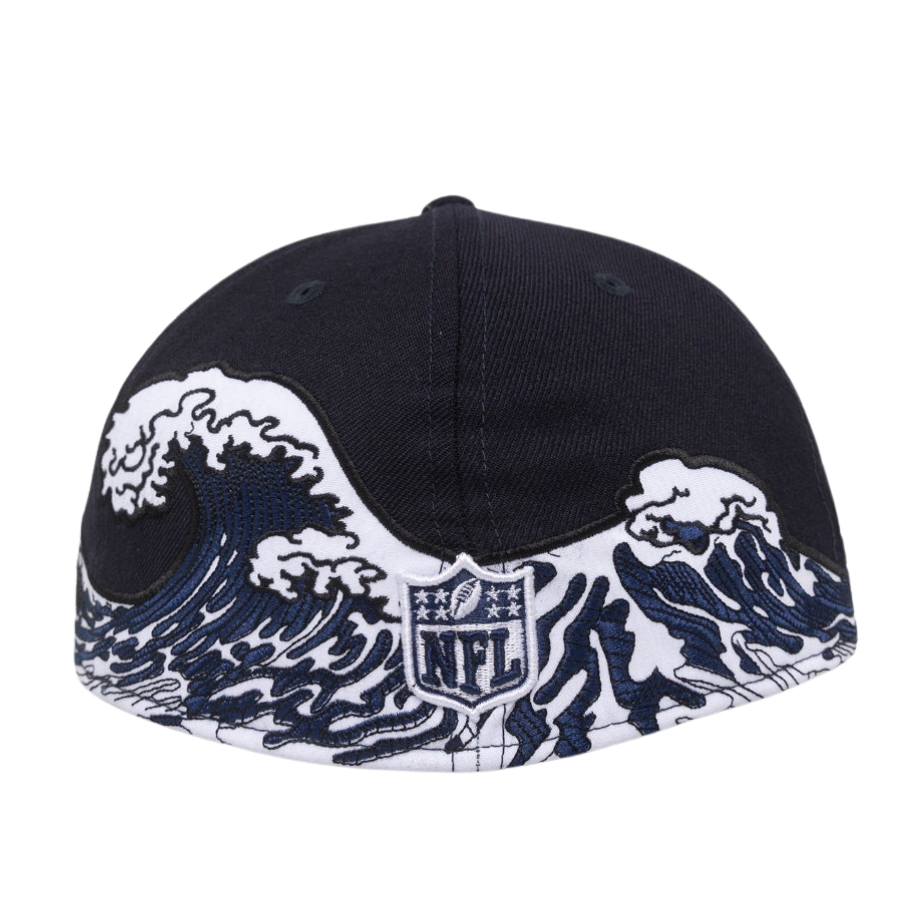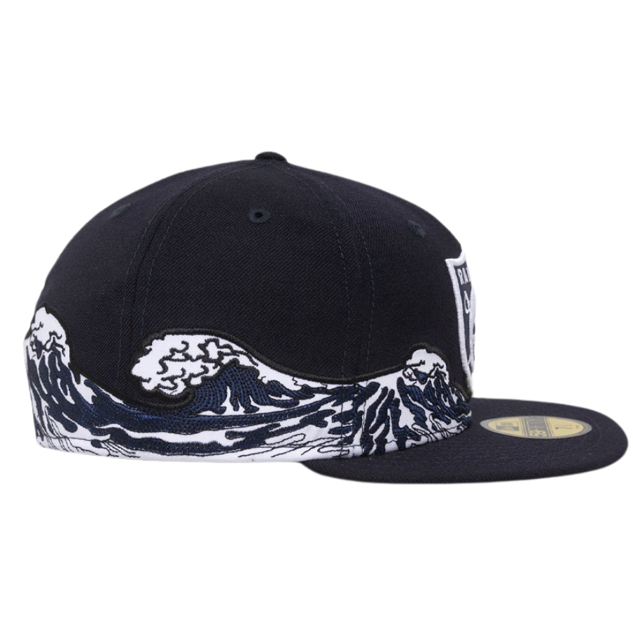This Las Vegas Raiders fitted hat was released by Culture Kings. The fitted has a navy blue six panel structured high crown and embroidered eyelets with a navy blue fabric squatchee button. The flat bill of the cap is also navy blue as well as the under brim. The front panel features the Las Vegas Raiders logo embroidery and an ocean wave graphic around the circumference of the dome. The left panel of the fitted displays the New Era logo.