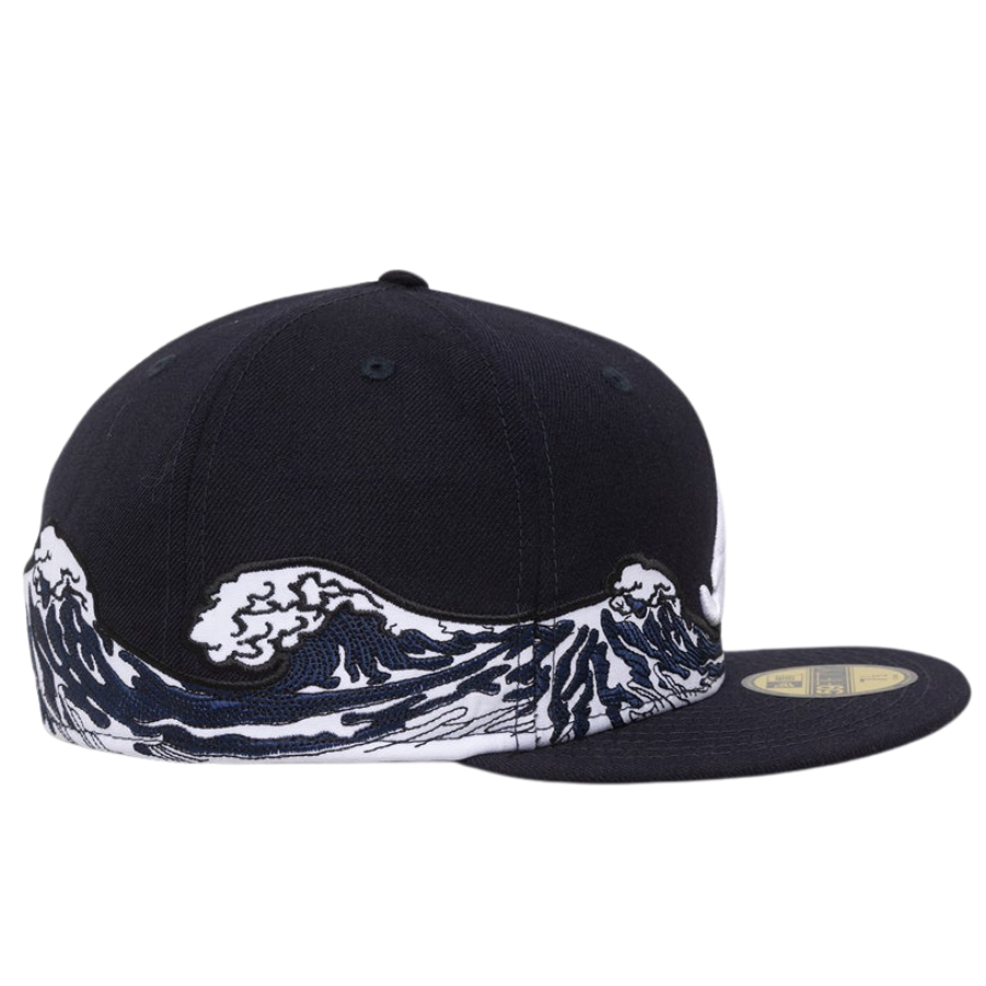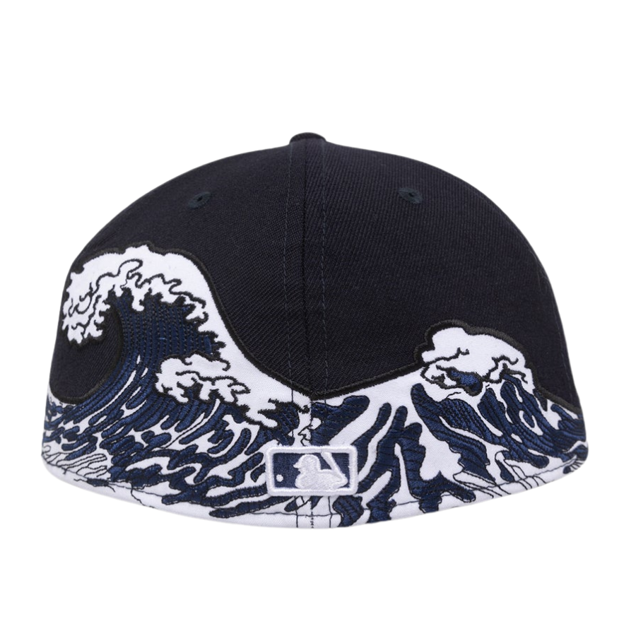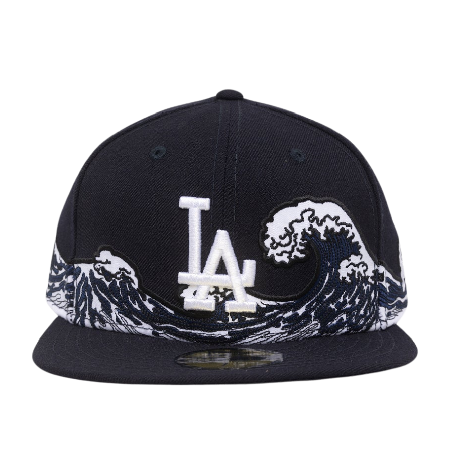 This Los Angeles Dodgers fitted hat was released by Culture Kings. The fitted has a navy blue six panel structured high crown and embroidered eyelets with a navy blue fabric squatchee button. The flat bill of the cap is also navy blue as well as the under brim. The front panel features the Los Angeles Dodgers logo embroidery and an ocean wave graphic around the circumference of the dome. The left panel of the fitted displays the New Era logo.