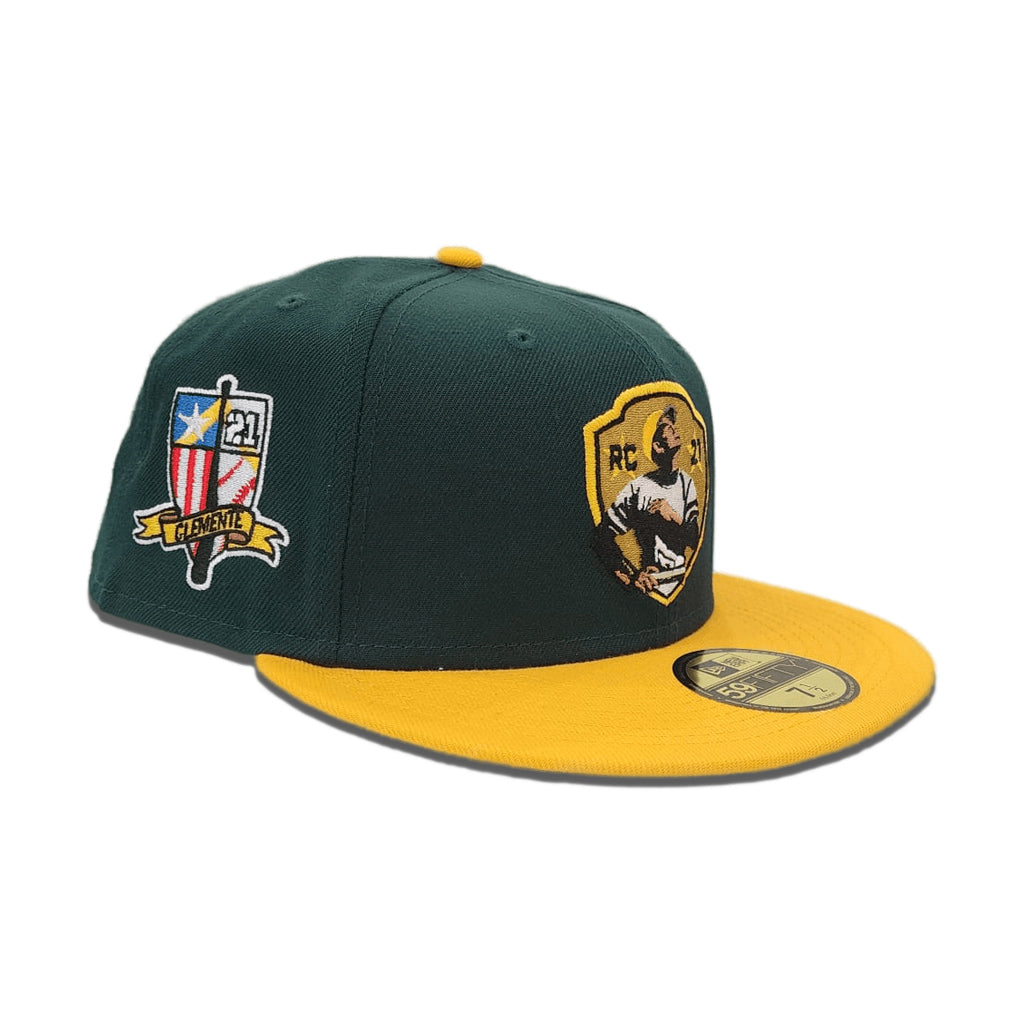 This Roberto Clemente 59FIFTY fitted hat was released by Exclusive Fitted. The fitted has a dark green six panel structured high crown and embroidered eyelets with a yellow fabric squatchee button. The fitted cap also has a yellow flat bill with a grey undervisor. The front panel features a Roberto Clemente embroidery and a #21 side patch embroidery on the right panel. The left panel of the fitted displays the New Era logo and the official MLB Batterman logo embroidery on the rear crown.