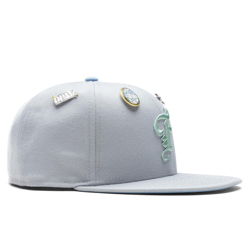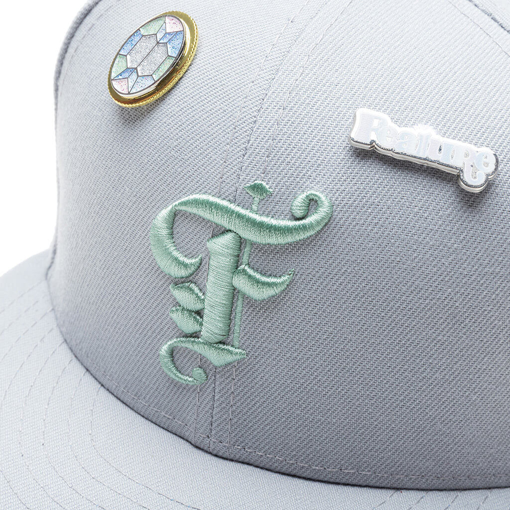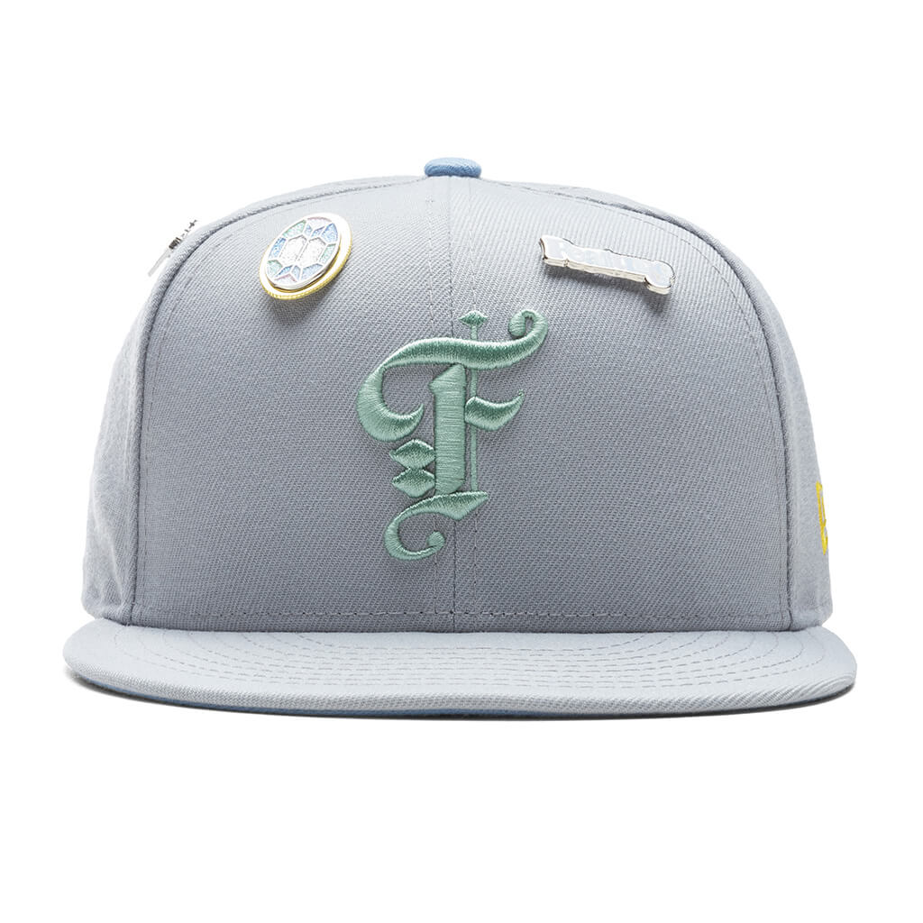 This New Era x Feature F "Opal" 59FIFTY Fitted Hat has a light grey six panel structured high crown and embroidered eyelets with a sky blue fabric squatchee button. The fitted cap has a light grey flat bill with a sky blue undervisor and white sweatband. The front panel features the Features "F" logo embroidery. The left panel of the fitted displays the New Era logo and the official logo embroidery on the rear crown.