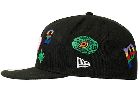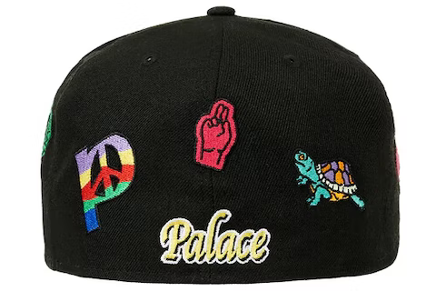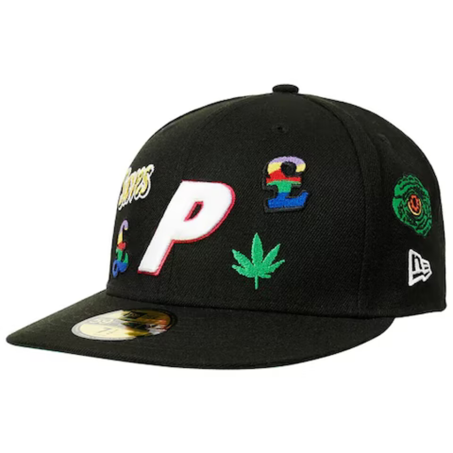 This New Era x Palace collaboration Jesus 59FIFTY fitted hat has a black six panel structured high crown, embroidered eyelets, fabric squatchee button and flat bill. The front panel features the Palace logo embroidered in white thread outlined in red. Across the entire crown are unique embroideries.