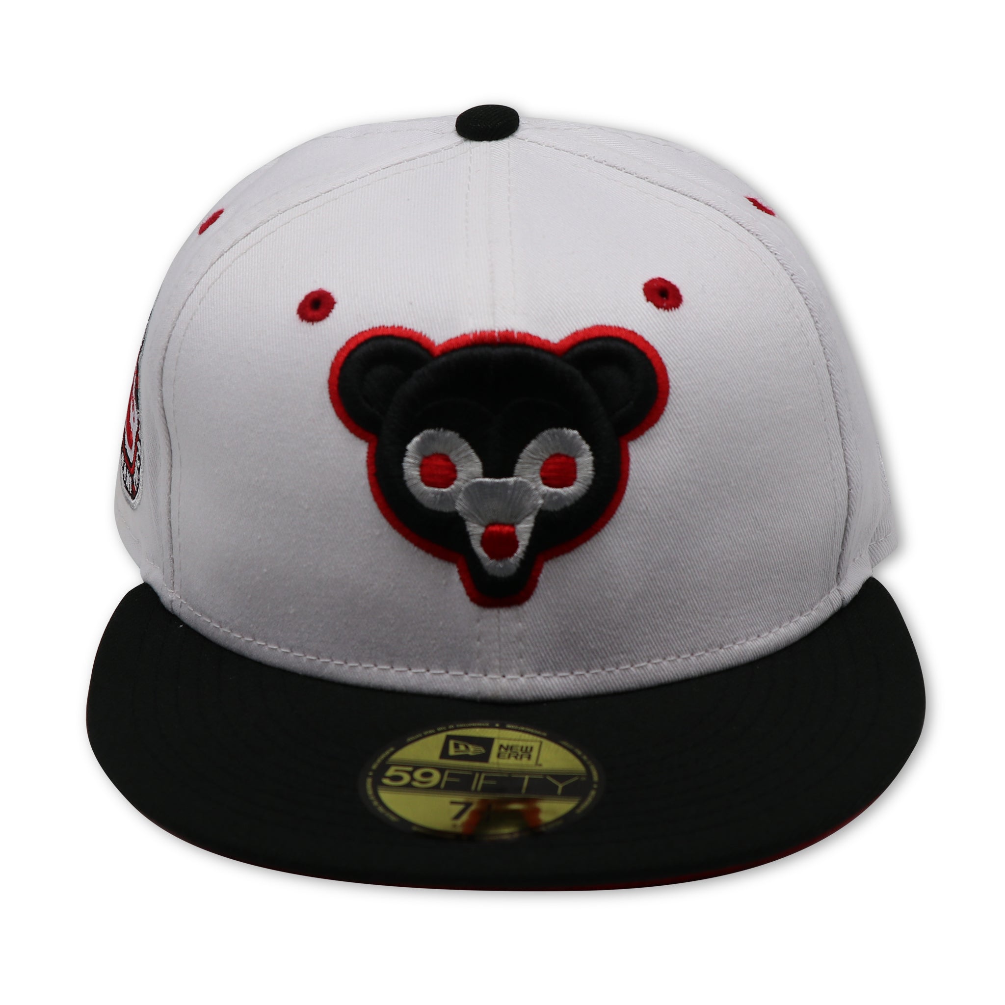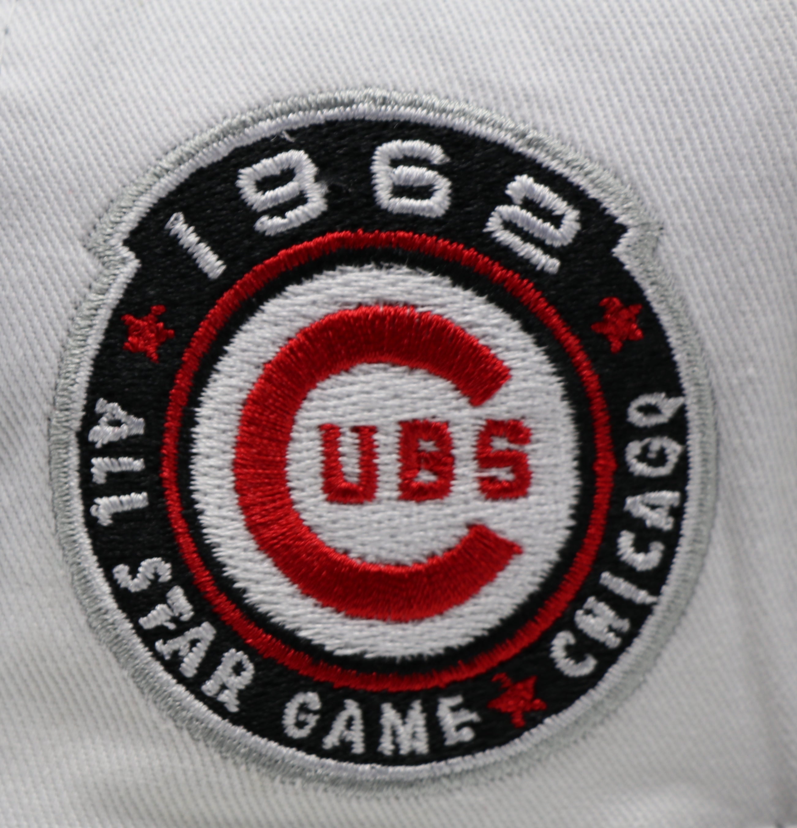 This New Era Chicago Cubs White/Black/Red Cooperstown 1962 All-Star Game 59FIFTY Fitted Hat is a 4ucaps exclusive. The fitted has a white six panel structured high crown, black embroidered eyelets with a black fabric squatchee button. The fitted cap also has a white flat bill with a red undervisor. The front panel features the Chicago Cubs logo embroidery and a 1962 ASG side patch embroidery on the right panel. The left panel of the fitted displays the New Era logo and the official MLB logo embroidery on the rear crown.