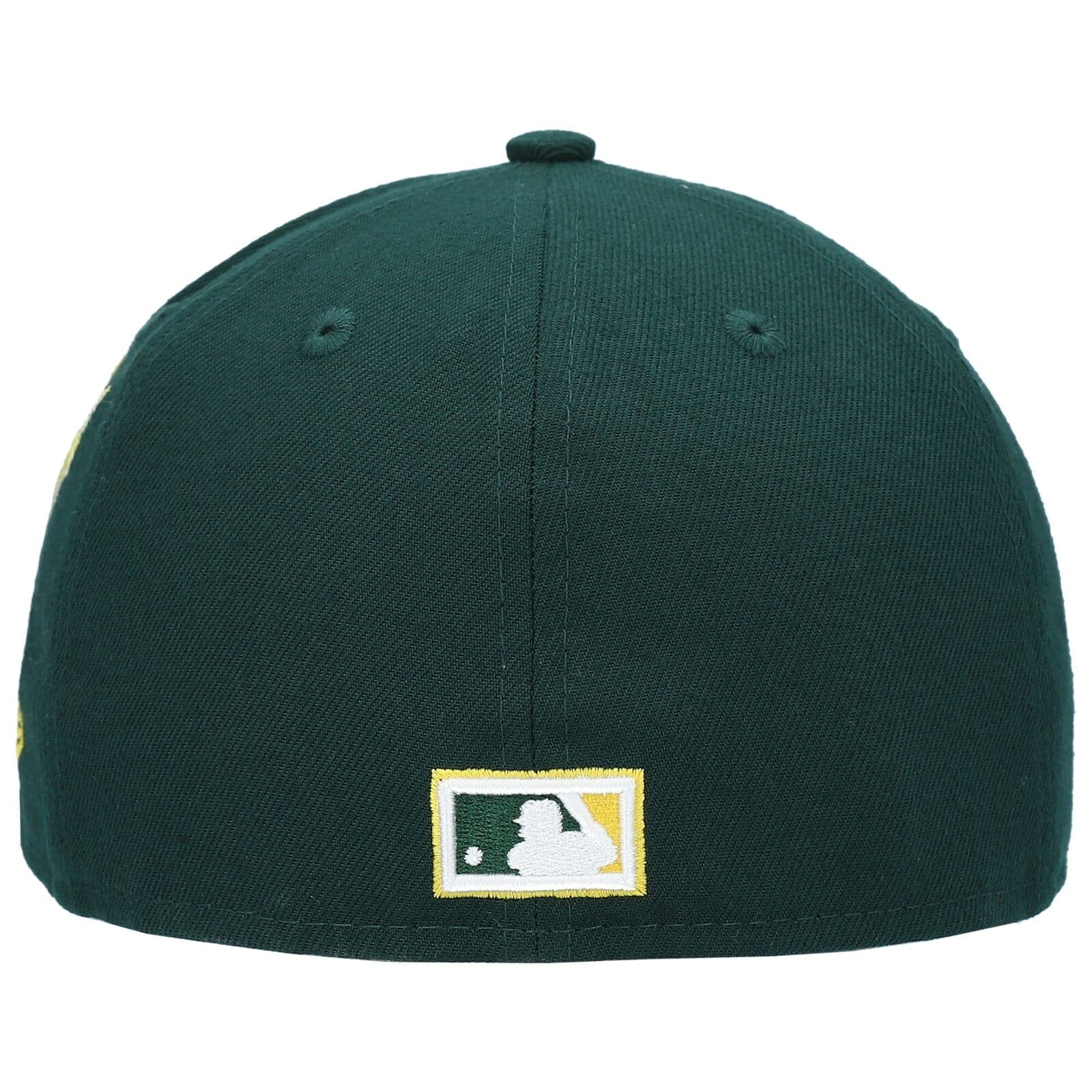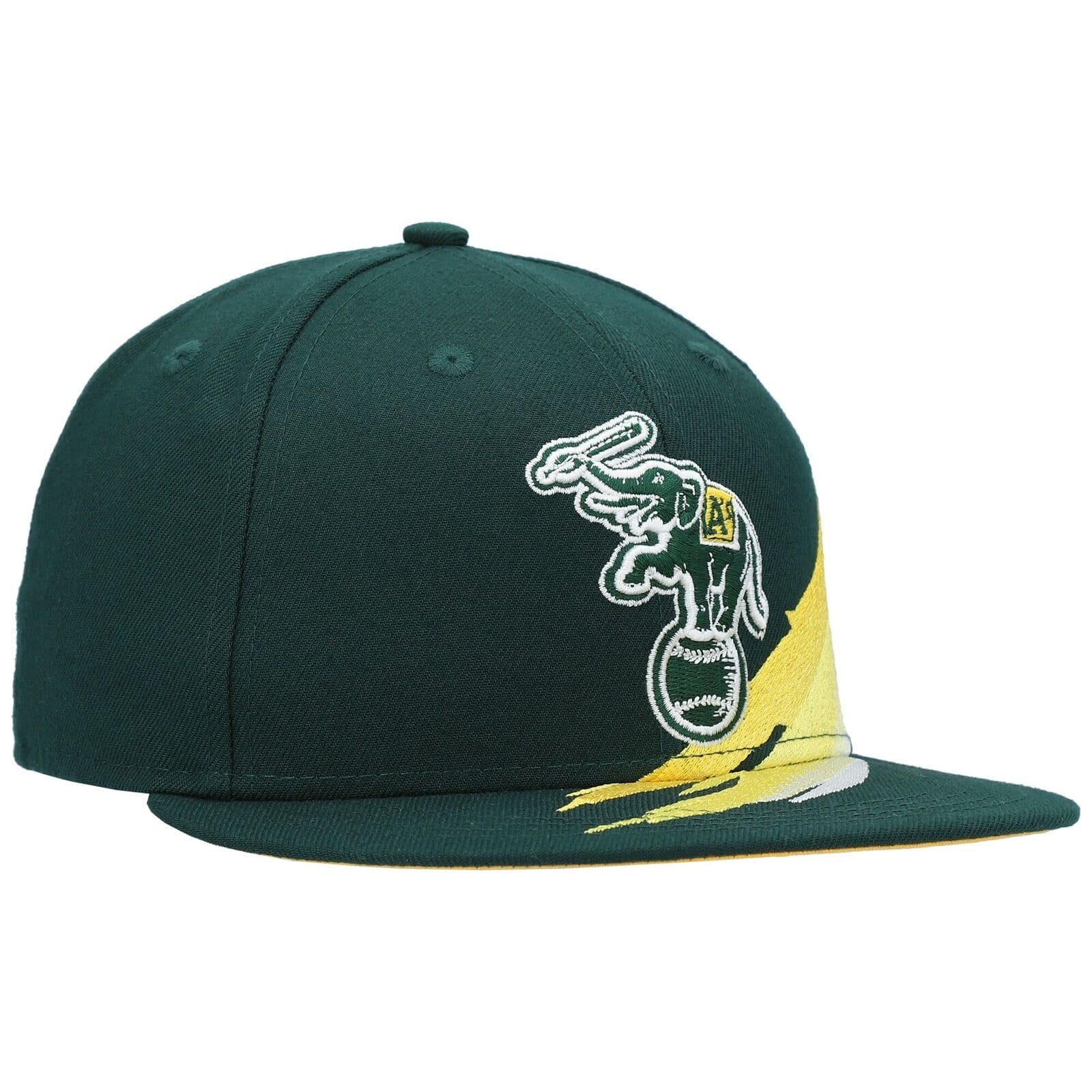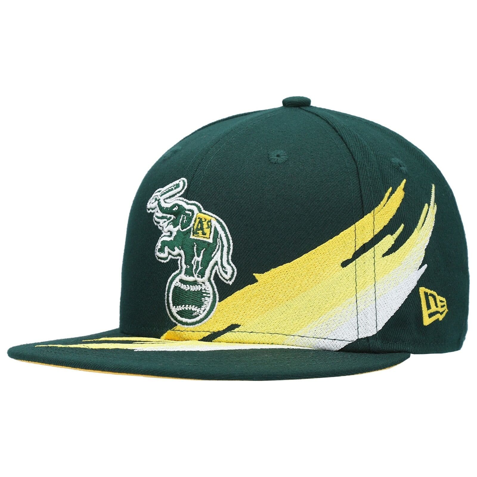 The New Era Oakland Athletics Cooperstown Brush 59FIFTY Fitted Hat features a green, yellow and white colorway. The six panel structured high crown, embroidered eyelets and fabric squatchee button are green. The flat bill of the fitted is also green with a yellow undervisor (under brim). The front panel features the Oakland Athletics Elephant balancing on a baseball. From the left side of the front panel to the left panel is a brush of yellow and white. The back of the crown is the embroidery of the official MLB Batterman logo in green, yellow and white threads. The Oakland Athletics Cooperstown Brush fitted hat is great for Fans of the A's or for someone who simply want to represent Oakland.