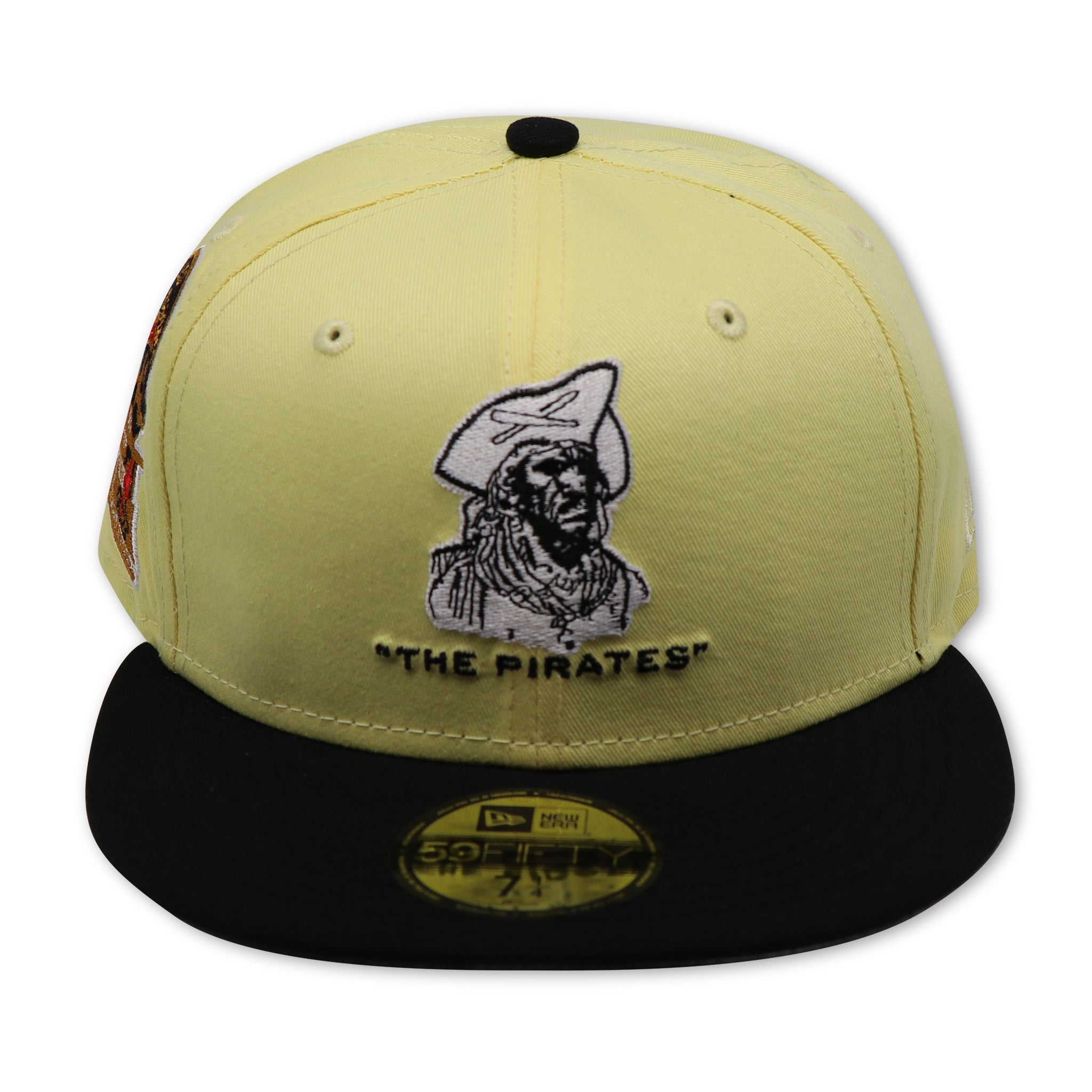 This New Era Pittsburgh Pirates Cooperstown Yellow/Black 1959 All-Star Game 59FIFTY Fitted Hat is a 4ucaps exclusive. The fitted has a soft yellow six panel structured high crown and embroidered eyelets with a black fabric squatchee button. The fitted cap also has a black flat bill with a light gray undervisor. The front panel features the Pittsburgh Pirates logo embroidery and a 1959 ASG side patch embroidery on the right panel. The left panel of the fitted displays the New Era logo and the official MLB logo embroidery on the rear crown.