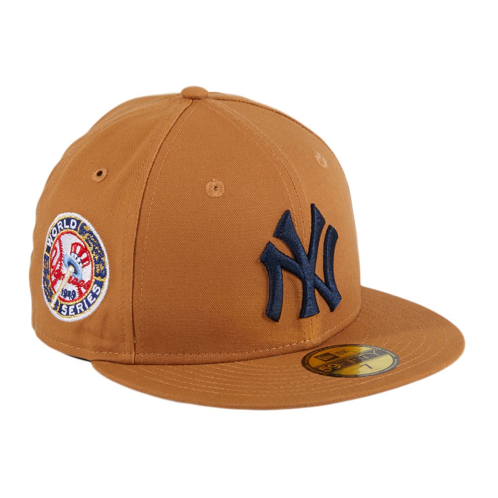 The New York Yankees Cowboy Pack fitted hat is a Hat Club Exclusive drop. The fitted hat features a light western brown six panel structured high crown, embroidered eyelets and fabric squatchee button. The flat bill of the fitted cap is also light brown with a grey bottom undervisor and black sweatband. The front panel features the NY Yankees logo embroidered in navy blue thread. The right panel features a World Series side patch. The back of the crown includes the official MLB Batterman logo embroidered in red, white and blue thread.