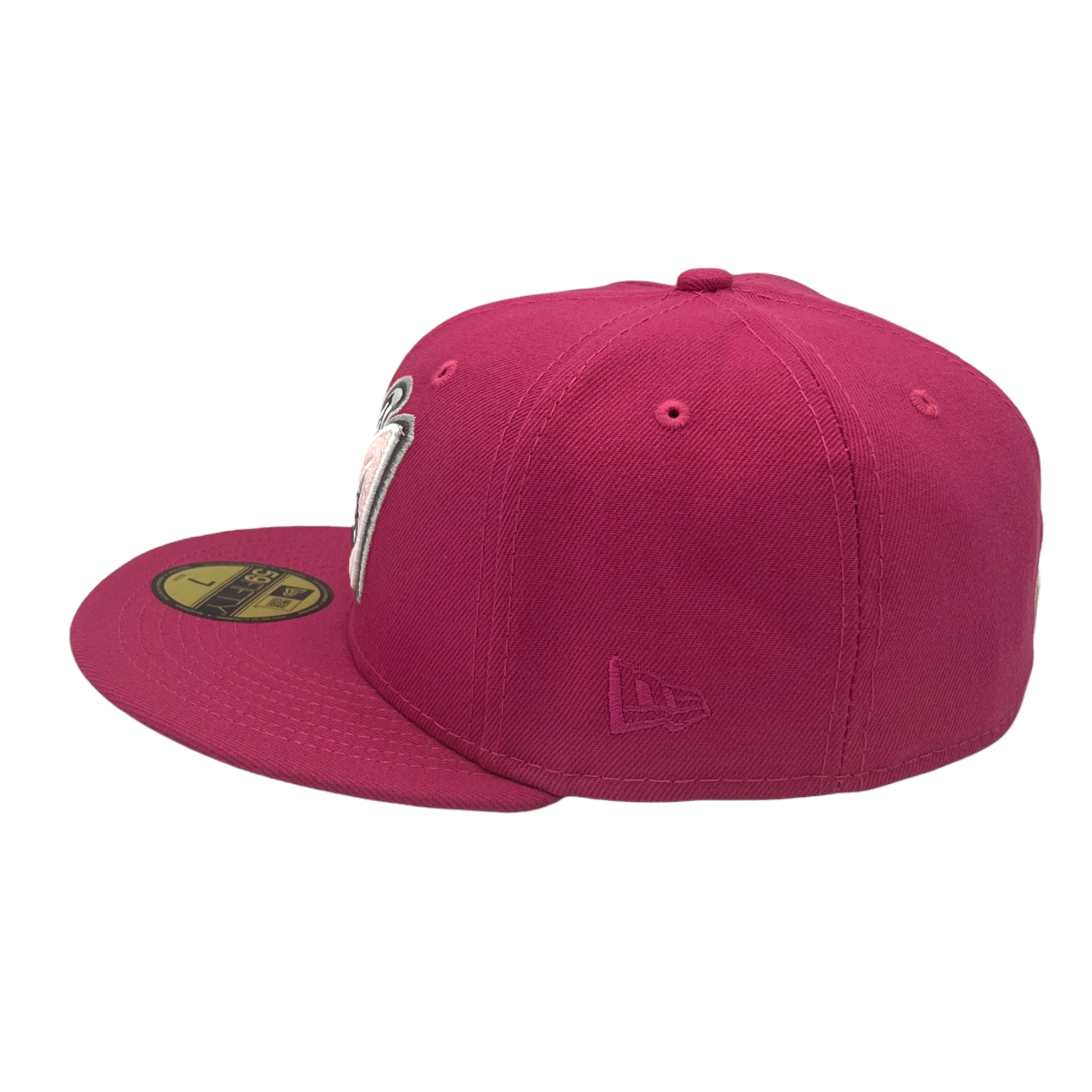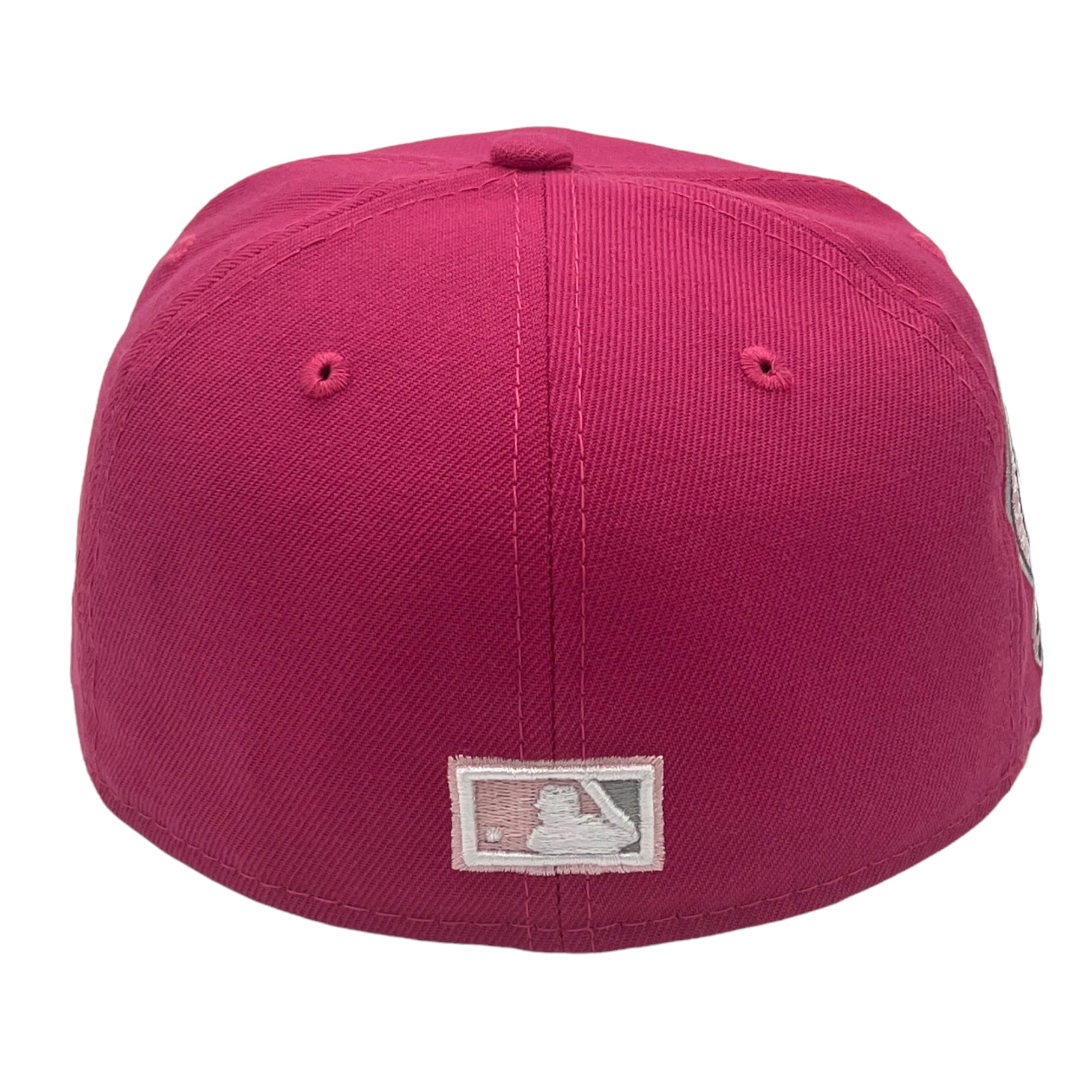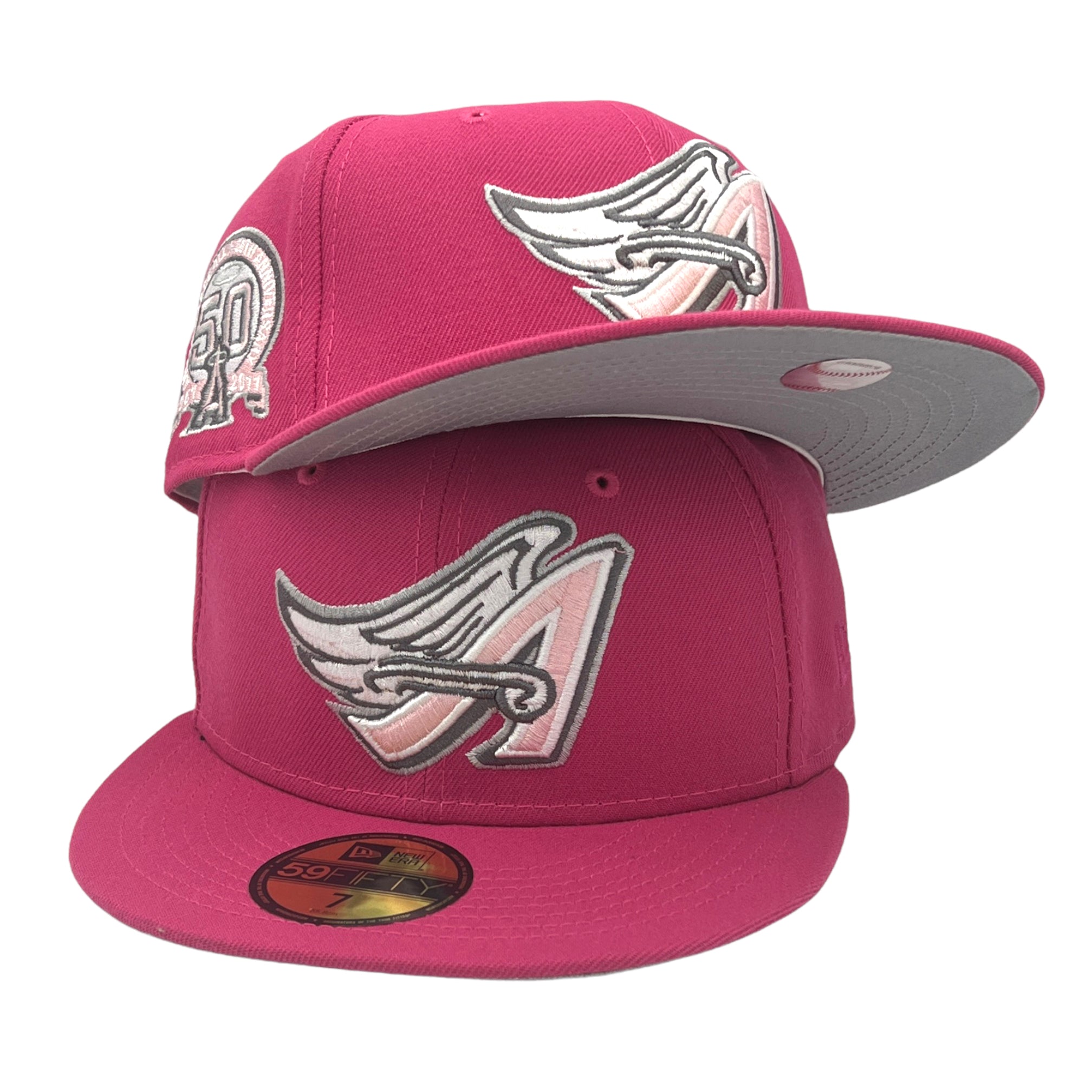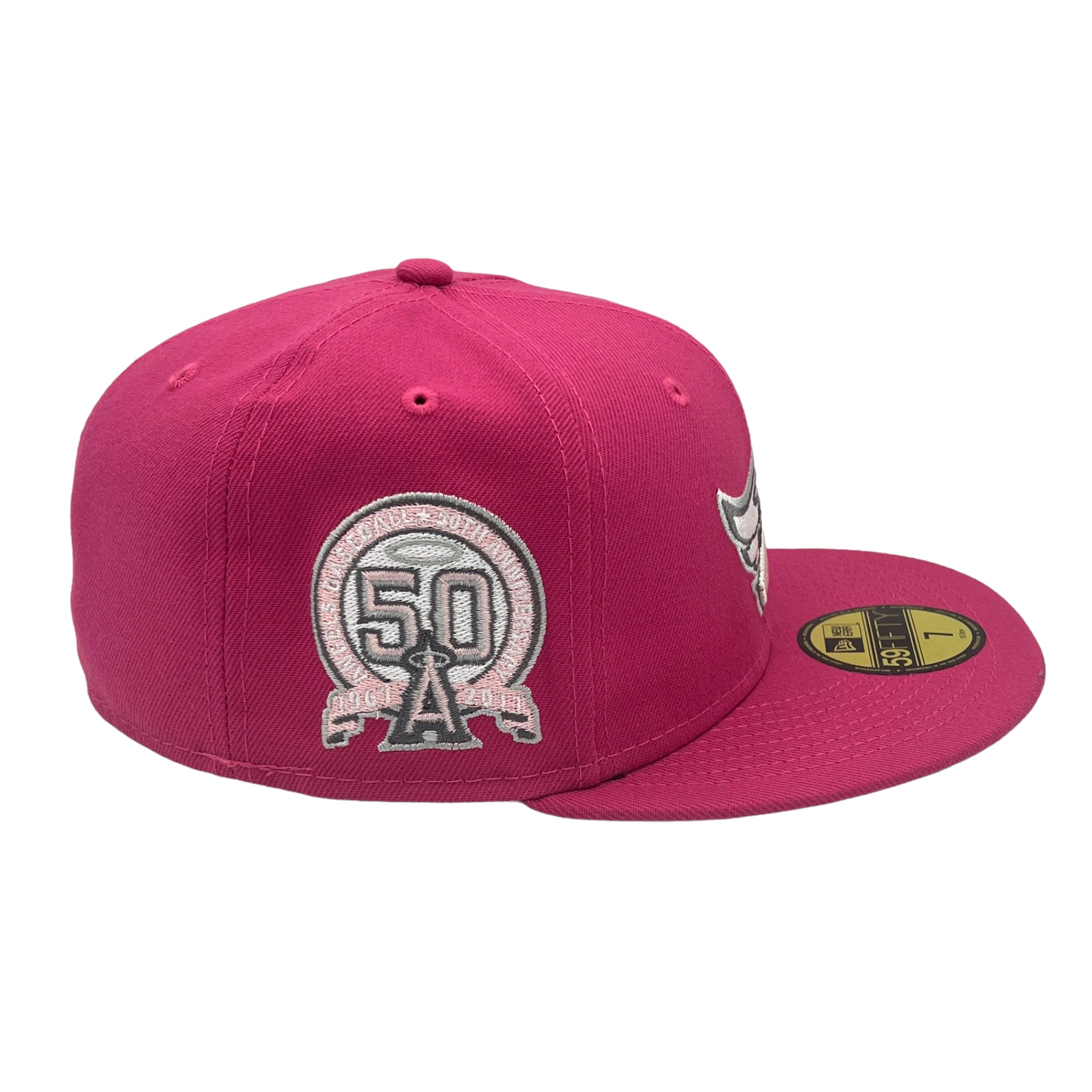 This New Era Anaheim Angels 59FIFTY fitted hat has a beetroot six panel structured high crown, embroidered eyelets and fabric squatchee button. The flat bill of the fitted cap is also bettroot with a grey undervisor and white sweatband. The front panel features the Anaheim Angels logo embroidery and a 50th Anniversary side patch embroidery on the right panel.