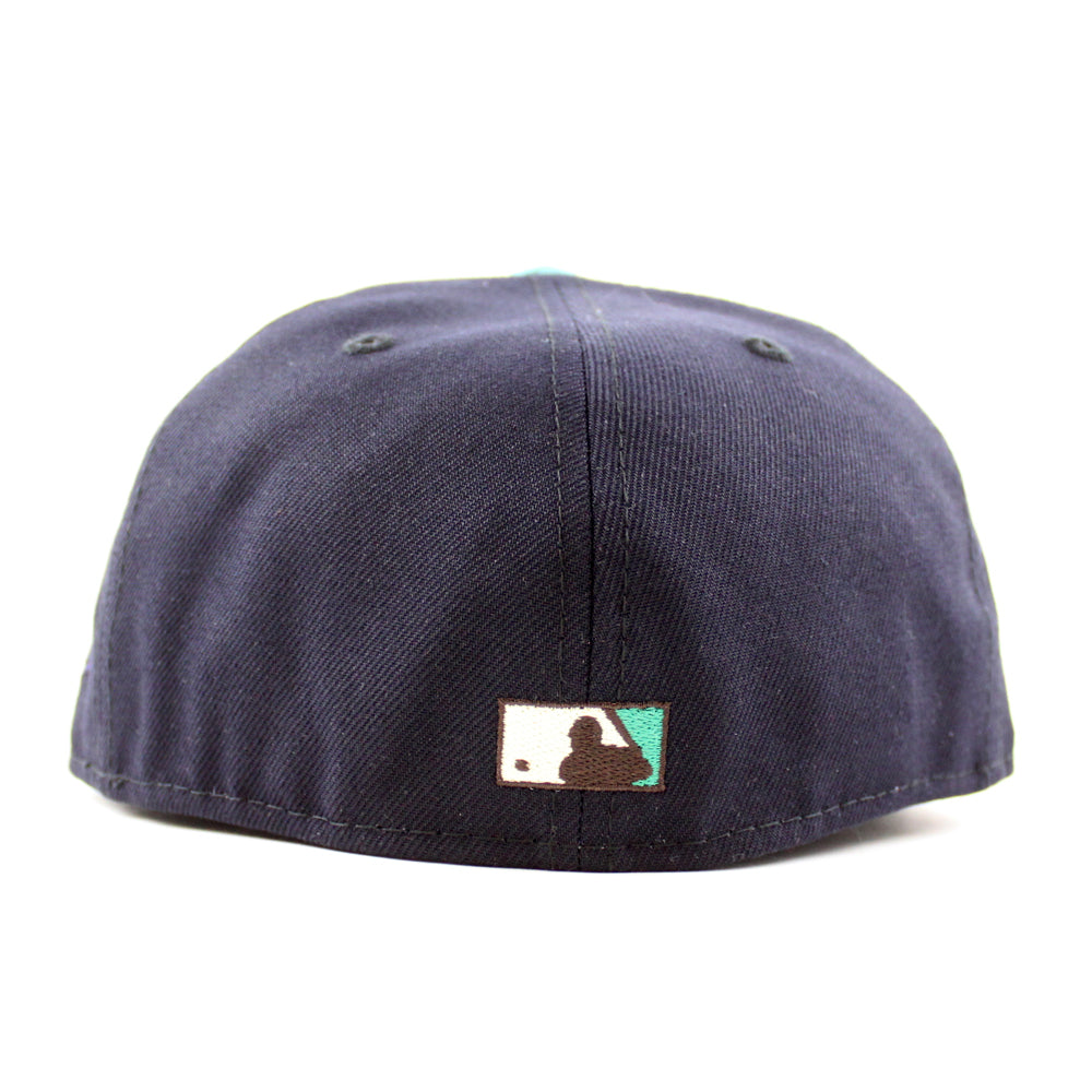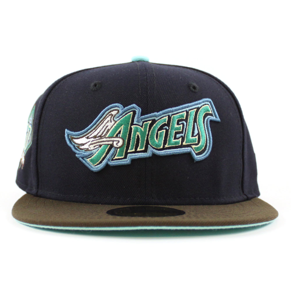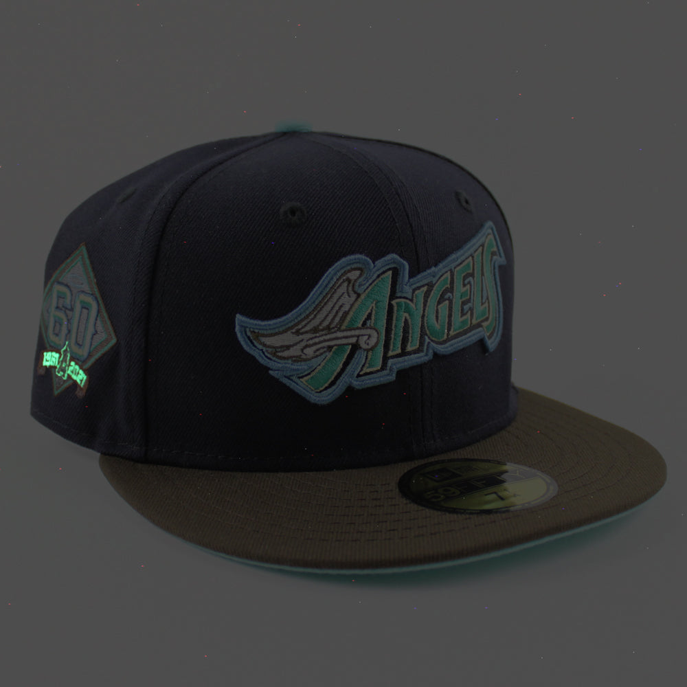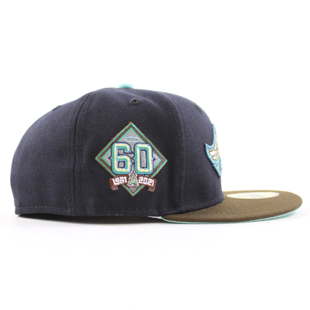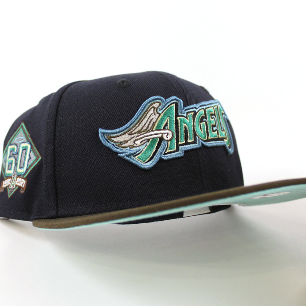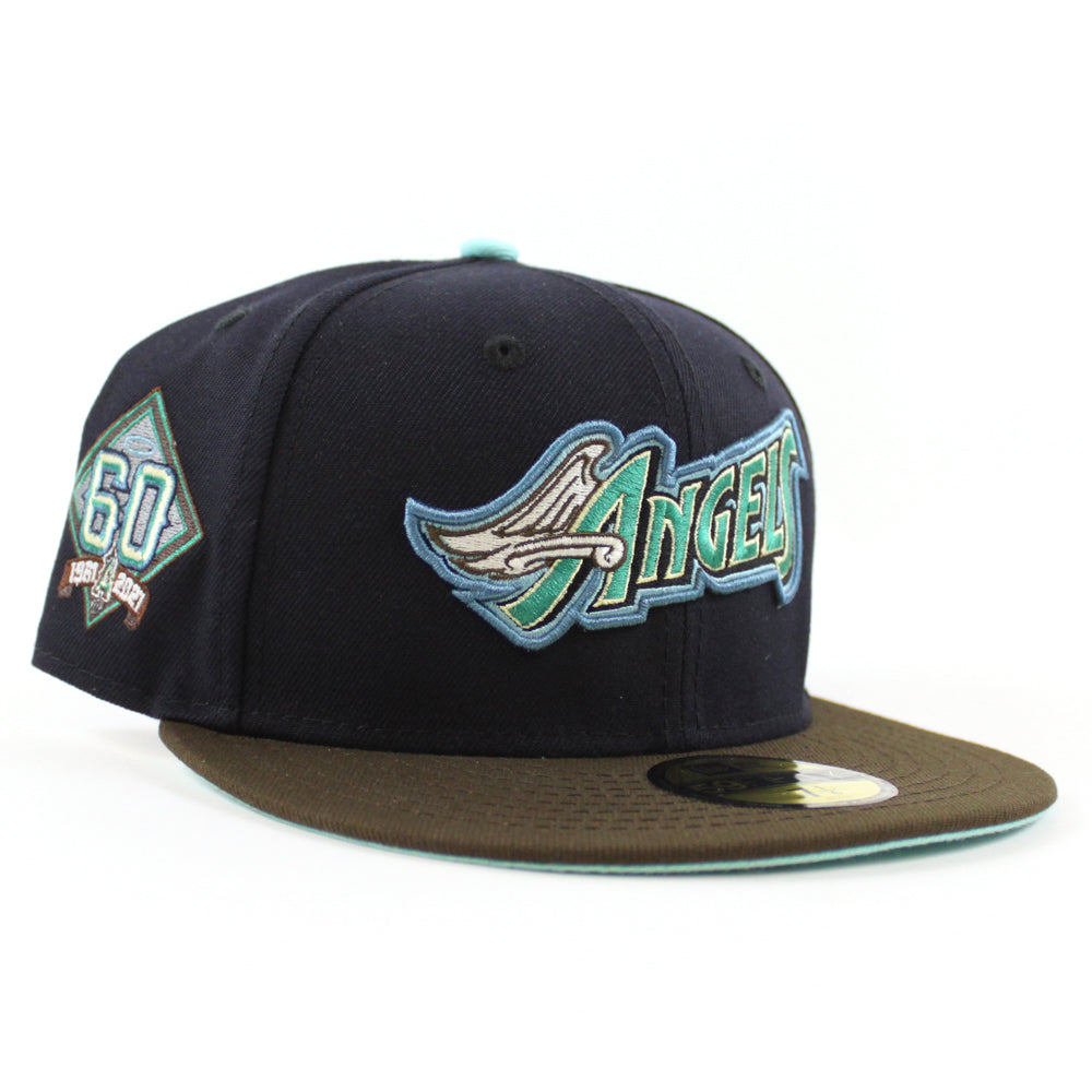 This New Era Anaheim Angels Navy/Walnut/Tint 60th Anniversary 59FIFTY Fitted Hat has a navy blue six panel structured high crown and embroidered eyelets with a tint fabric squatchee button. The fitted cap also has a walnut brown flat bill with a tint undervisor and black sweatband. The front panel features the Anaheim Angels logo embroidery and a 60th Anniversary side patch embroidery on the right panel. The left panel of the fitted displays the New Era logo and the official MLB logo embroidery on the rear crown.