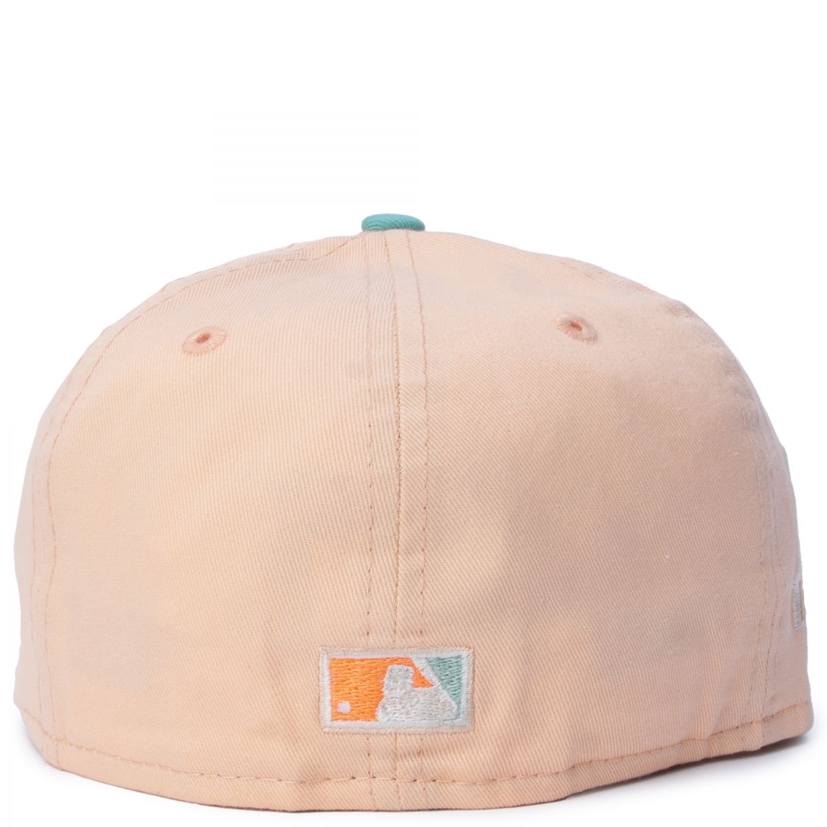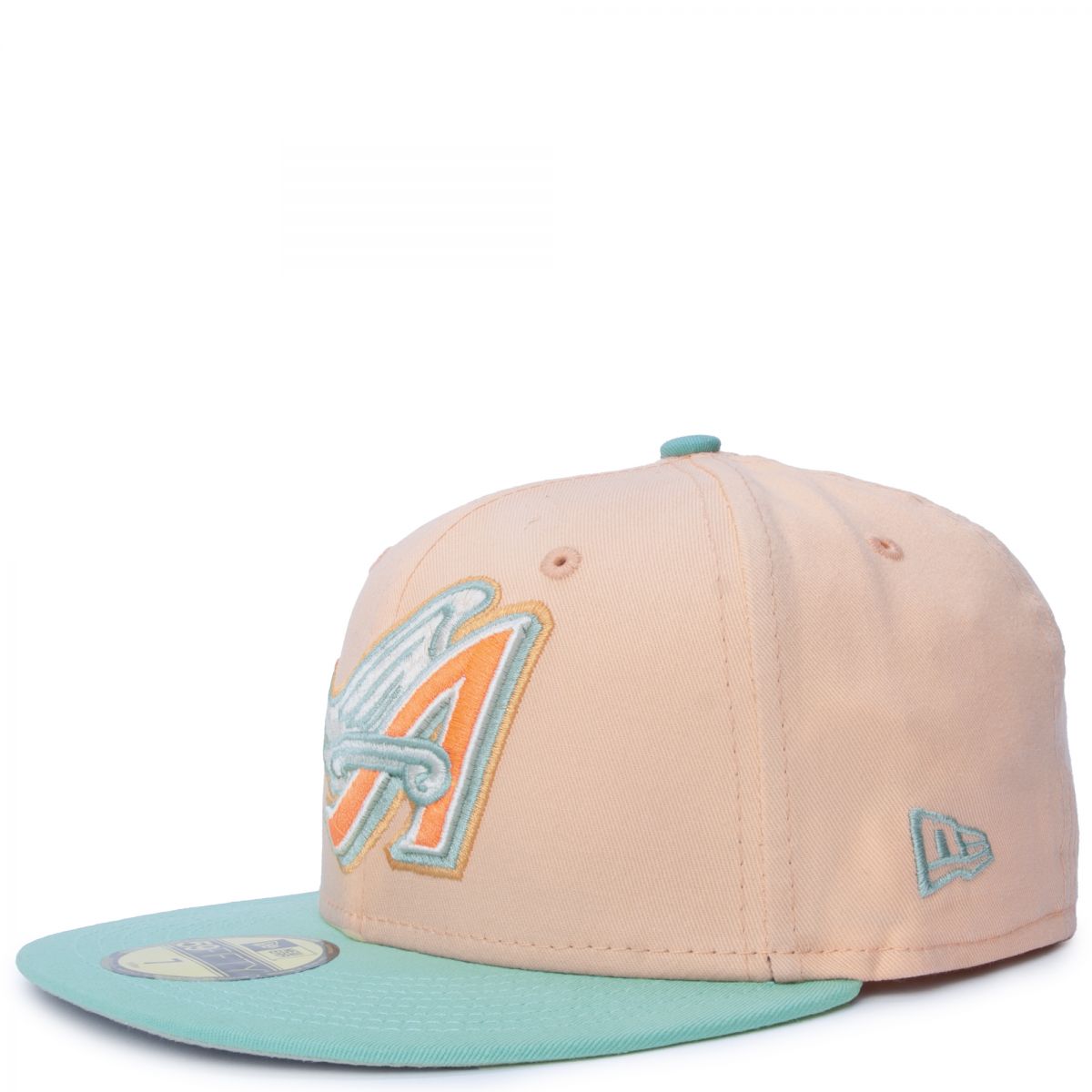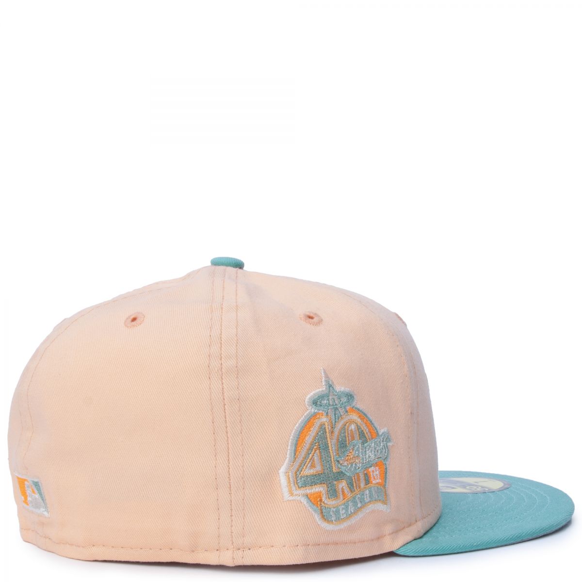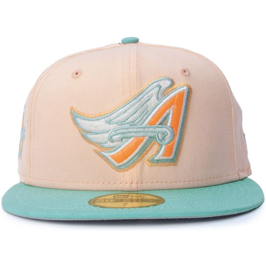 This New Era Anaheim Angels Peach/Mint 40 Seasons 2023 59FIFTY Fitted Hat was released by Karma Loop. The fitted has a peach six panel structured high crown and embroidered eyelets with a mint fabric squatchee button. The fitted cap also has a mint flat bill with a grey undervisor and white sweatband. The front panel features the Anaheim Angels logo embroidery and a 40 Seasons side patch embroidery on the right panel. The left panel of the fitted displays the New Era logo and the official MLB Batterman logo embroidery on the rear crown.