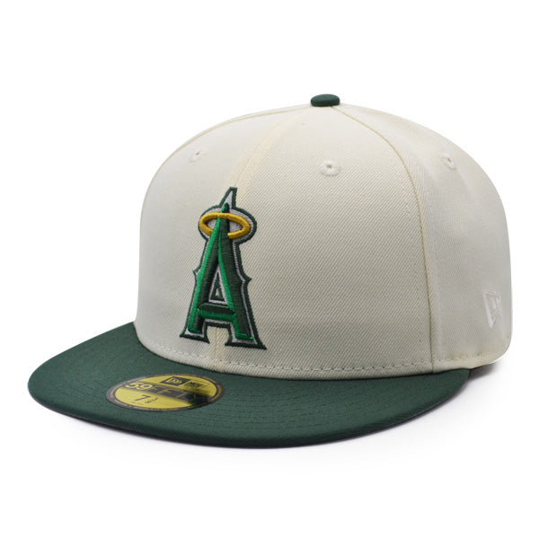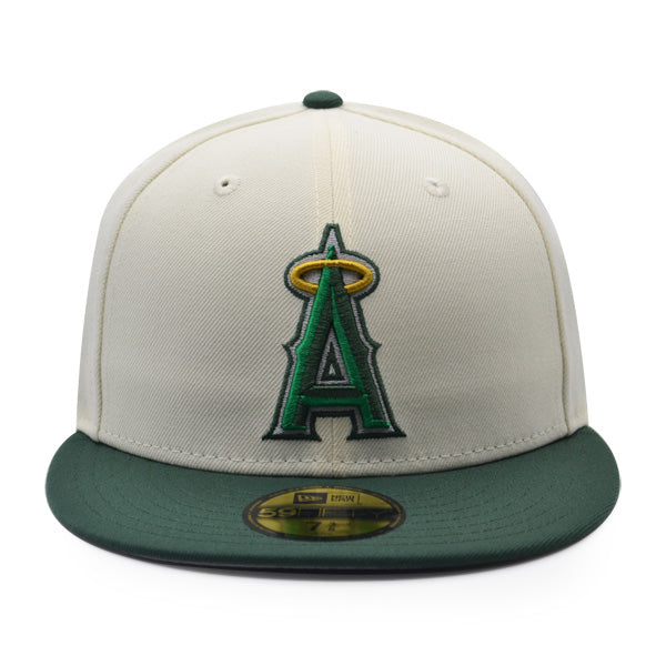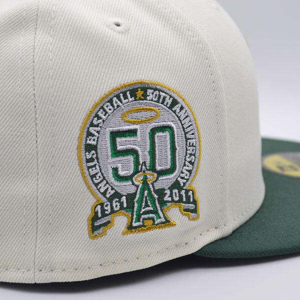 This New Era Anaheim Angels White/Pine/Gold 50th Anniversary 59FIFTY Fitted Hat was released by Hat Dreams. The fitted has a white six panel structured high crown and embroidered eyelets with a pine green fabric squatchee button. The flat bill of the fitted cap is also pine green with a grey bottom undervisor. The front panel features the Anaheim Angels logo embroidery and a side patch embroidered on the right panel. The left panel of the fitted displays the New Era logo and the official MLB Batterman logo embroidered on the rear crown.