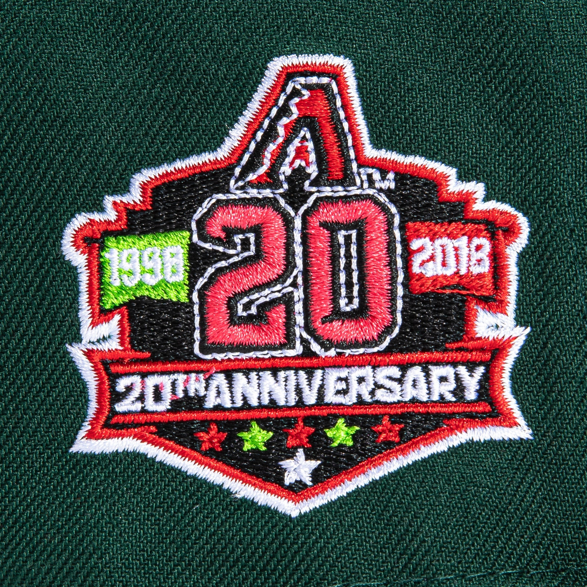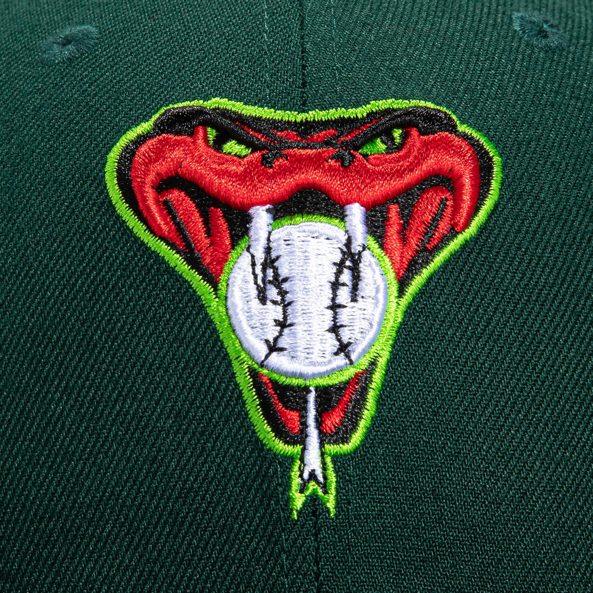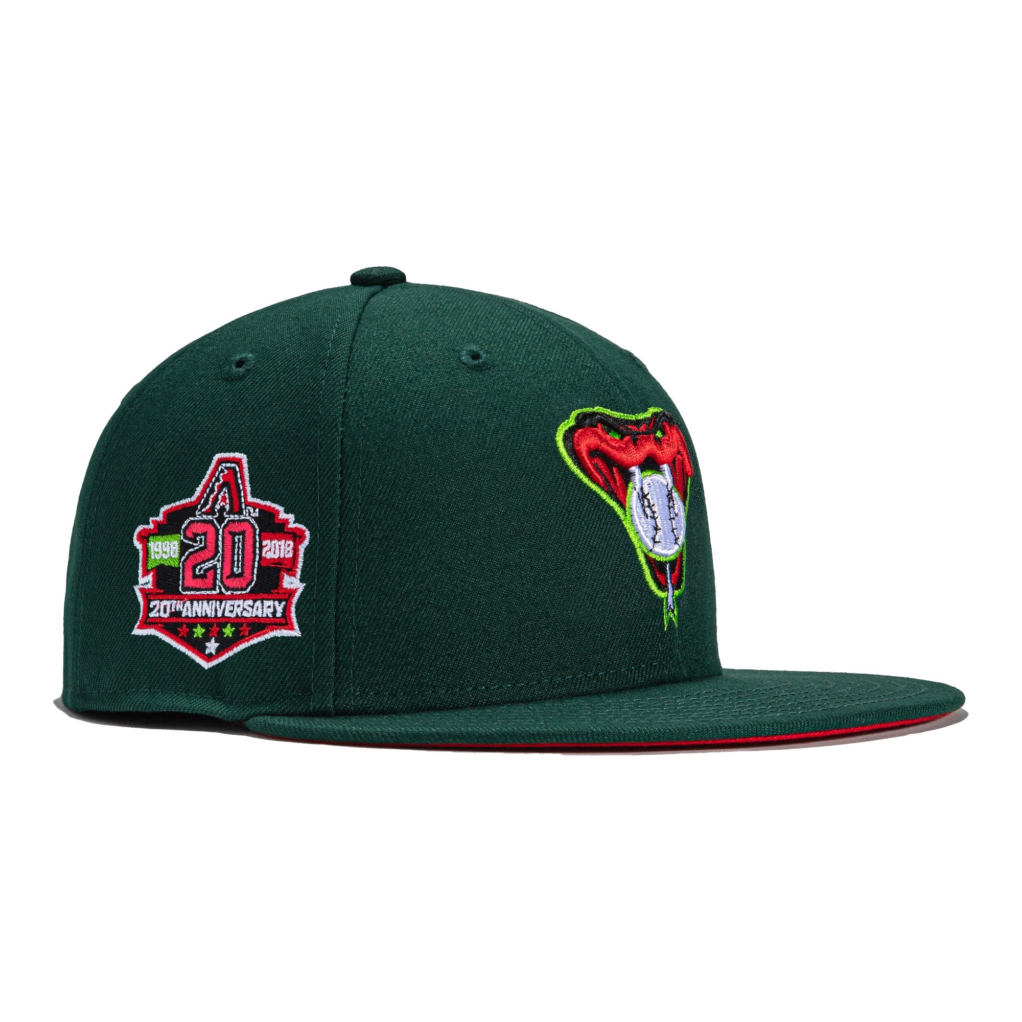 This New Era Arizona Diamondbacks 20th Anniversary Snakehead 'Watermelon' 59FIFTY Fitted Hat was originally released by Hat Club. The fitted has a dark green six panel structured high crown, embroidered eyelets and fabric squatchee button. The flat bill of the fitted cap is also dark green with a red bottom undervisor. The front panel features the Arizona Diamondbacks logo embroidery and a side patch embroidered on the right panel. The left panel of the fitted displays the New Era logo and the official MLB insignia embroidered on the rear crown. The fitted hat colorway is inspired by the colors of a watermelon.