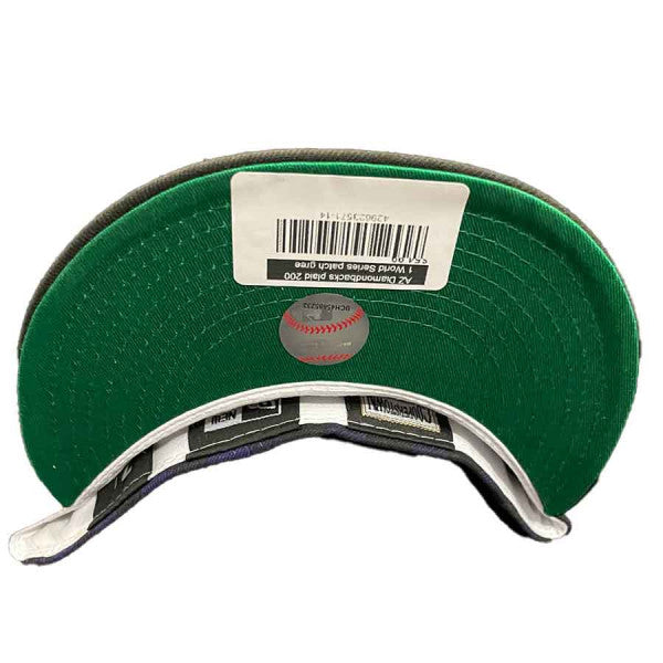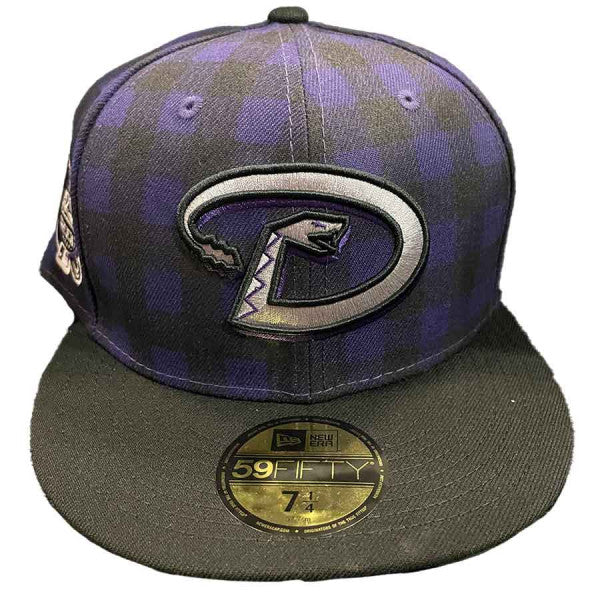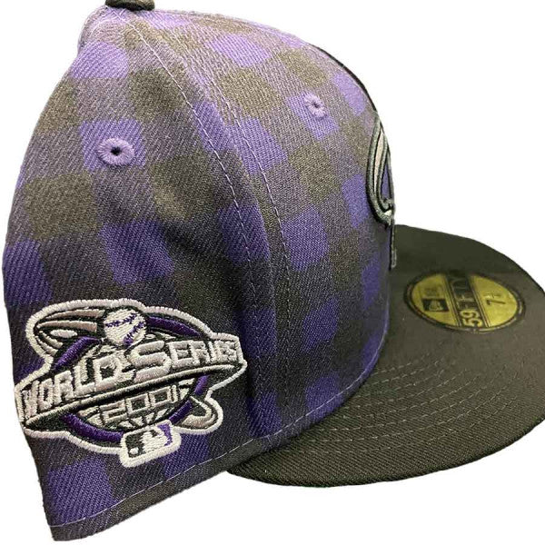 This New Era Arizona Diamondbacks Blue Plaid Collection 2001 World Series 59FIFTY Fitted Hat was released by Pro Image Sports. The fitted has a blue and black plaid six panel structured high crown and embroidered eyelets with a black fabric squatchee button. The fitted cap also has a black flat bill with a green undervisor and white sweatband. The front panel features the Arizona Diamondbacks logo embroidery and a 2001 World Series side patch embroidery on the right panel. The left panel of the fitted displays the New Era logo and the official MLB logo embroidery on the rear crown.