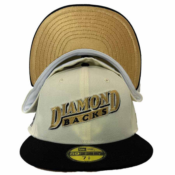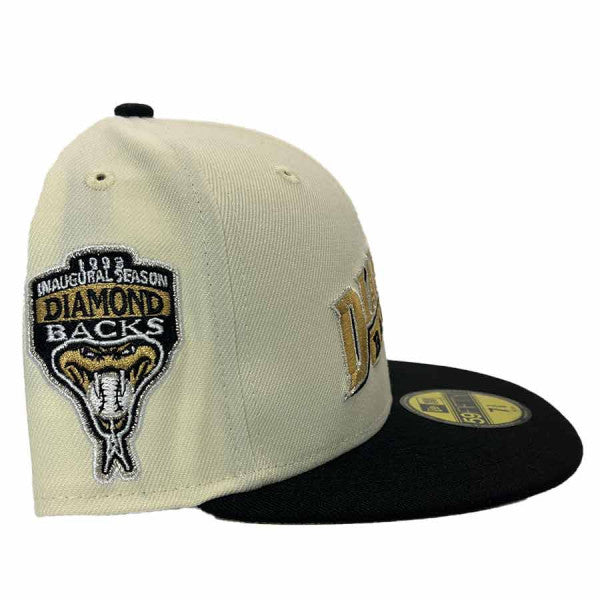 This New Era Arizona Diamondbacks 'Champagne' 1993 Inaugural Season Gold UV 59FIFTY Fitted Hat was released by Pro Image Sports. The fitted has a cream six panel structured high crown and embroidered eyelets with a black fabric squatchee button. The fitted cap also has a black flat bill with a metallic gold undervisor and white sweatband. The front panel features the Arizona Diamondbacks logo embroidery and a 1993 Inaugural Season side patch embroidery on the right panel. The left panel of the fitted displays the New Era logo and the official MLB logo embroidery on the rear crown.