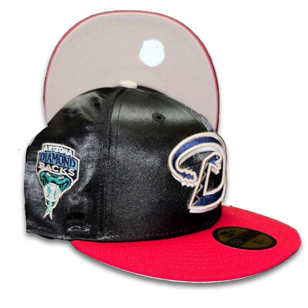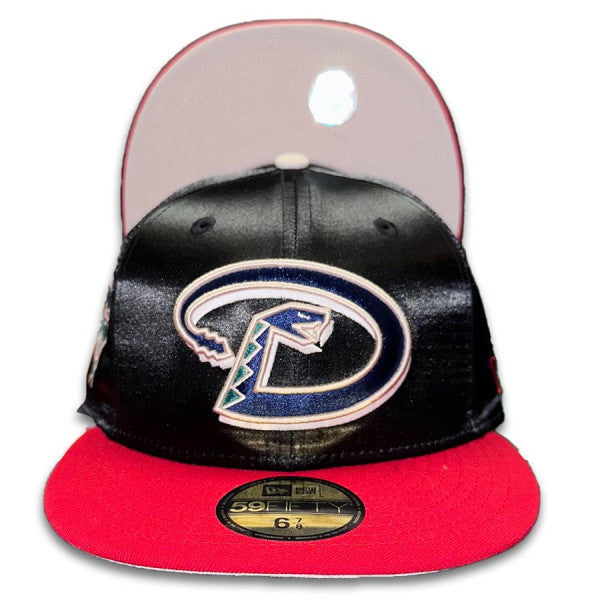 This Arizona Diamondbacks 59FIFTY fitted hat was released by Pro Image Sports. The fitted has a black satin six panel structured high crown, embroidered eyelets and a white fabric squatchee button. The fitted cap also has a red flat bill with a grey undervisor. The front panel features the Arizona Diamondbacks logo embroidery and a side patch embroidery on the right panel. The left panel of the fitted displays the New Era logo and the official MLB Batterman logo embroidery on the rear crown.