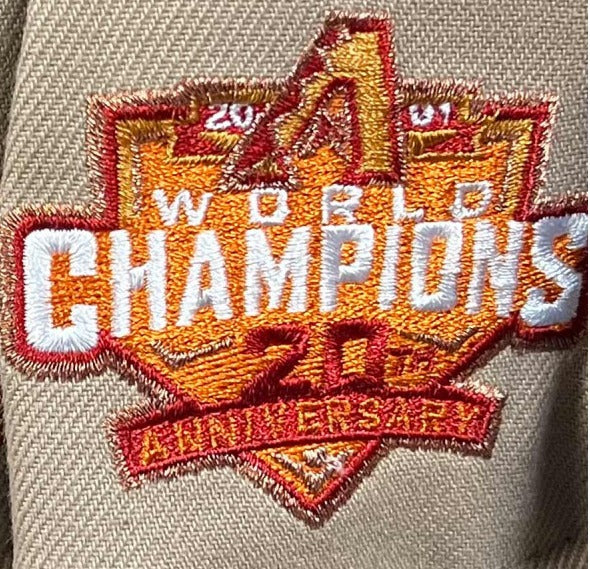 This Arizona Diamondbacks "Sparta" 20th Anniversary fitted hat has a tan six panel structured high crown and embroidered eyelets with a brown fabric squatchee button. The fitted cap also has a brown flat bill with a red undervisor. The front panel features the Arizona Diamondbacks logo embroidery and a side patch embroidery on the right panel. The left panel of the fitted displays the New Era logo and the official MLB logo embroidery on the rear crown.