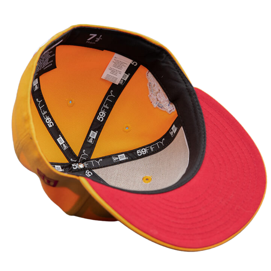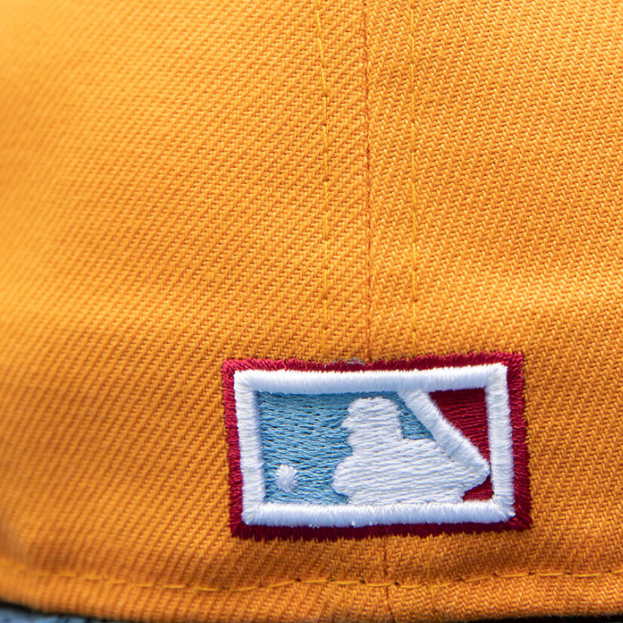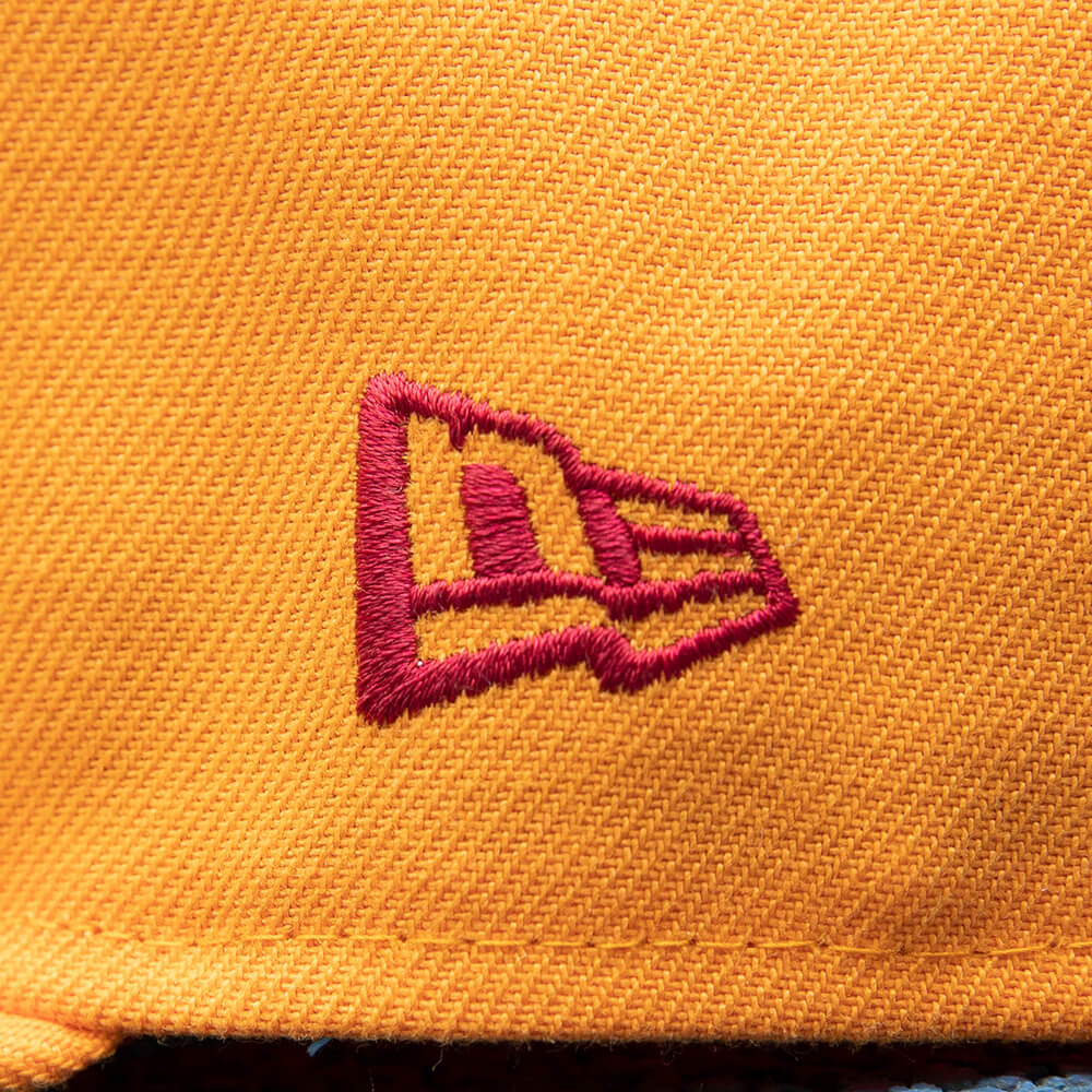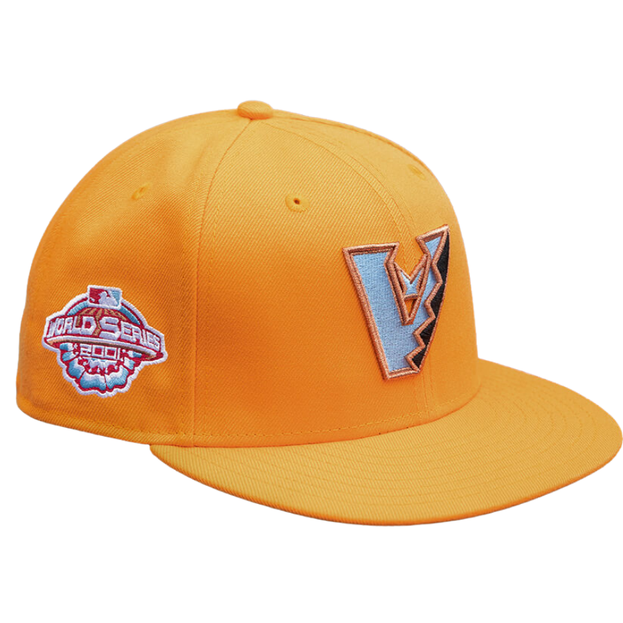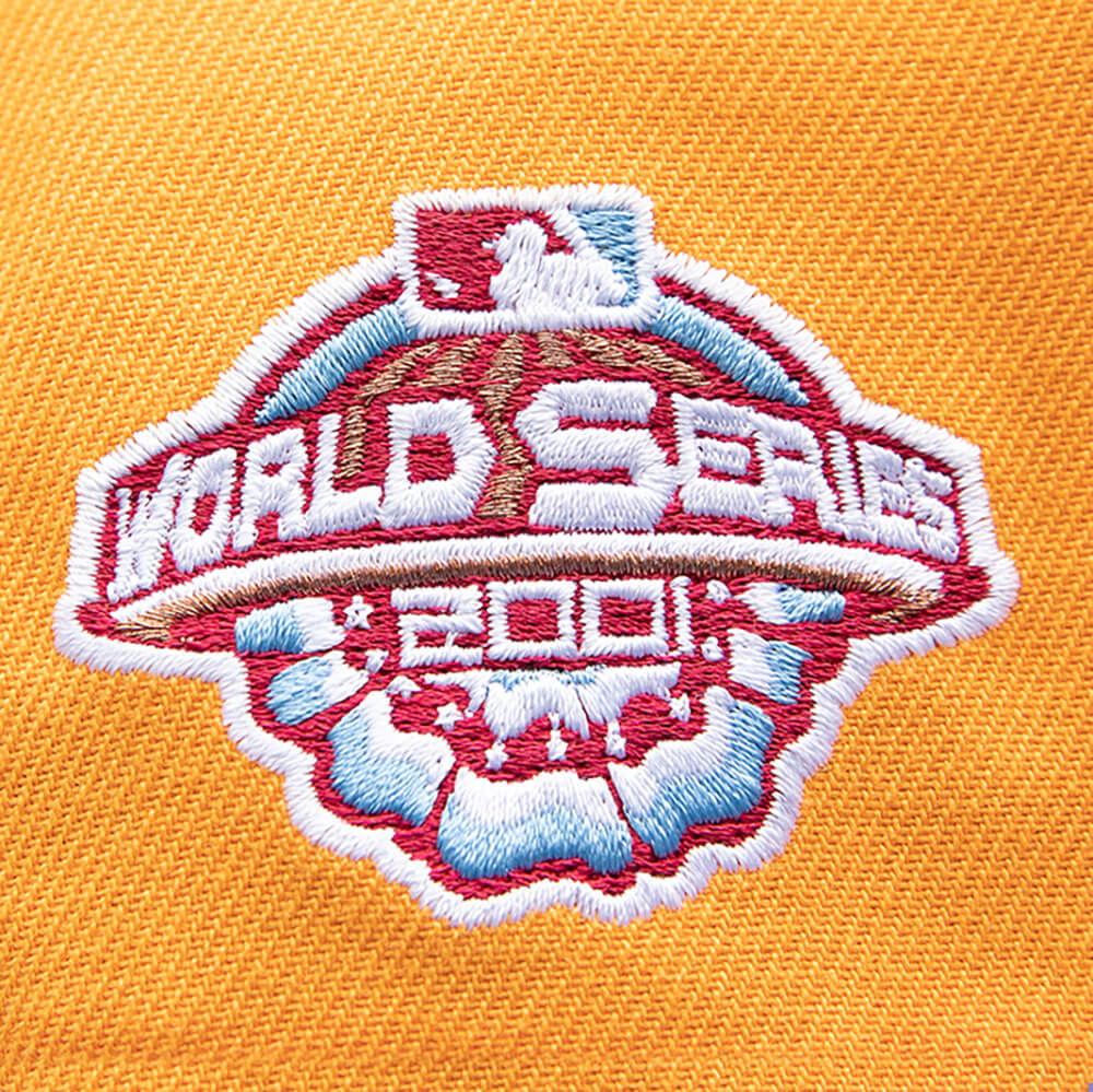 This New Era Arizona Diamondbacks 59FIFTY fitted hat has an orange six panel structured high crown, embroidered eyelets and fabric squatchee button. The fitted cap also has an orange flat bill with a maroon undervisor and black sweatband. The front panel features the Arizona Diamondbacks logo embroidery and a 2001 World Series side patch embroidery on the right panel. The rear crown of the fitted features the official MLB Batterman logo.