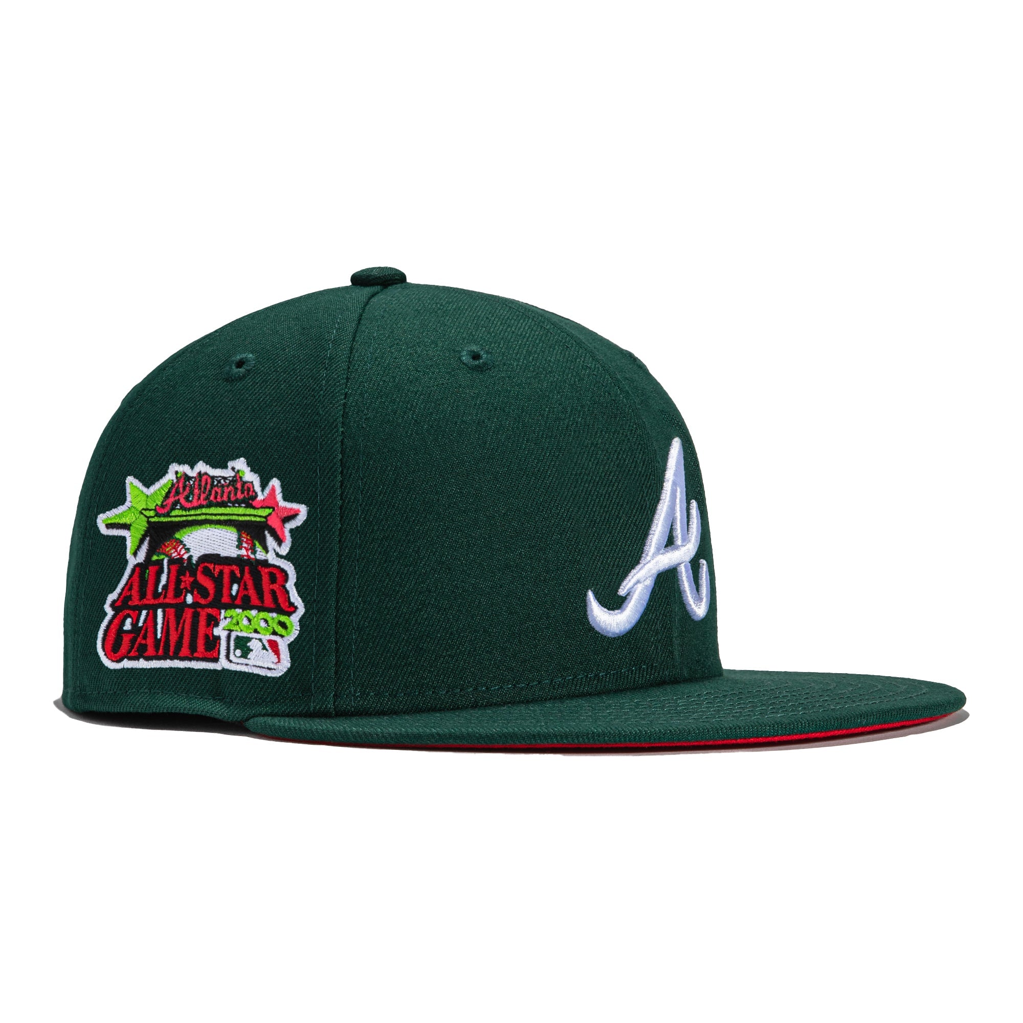 This New Era Atlanta Braves 2000 All-Star Game 'Watermelon' 59FIFTY Fitted Hat was originally released by Hat Club. The fitted has a dark green six panel structured high crown, embroidered eyelets and fabric squatchee button. The flat bill of the fitted cap is also dark green with a red bottom undervisor. The front panel features the Atlanta Braves logo embroidery and a side patch embroidered on the right panel. The left panel of the fitted displays the New Era logo and the official MLB insignia embroidered on the rear crown. The fitted hat colorway is inspired by the colors of a watermelon.