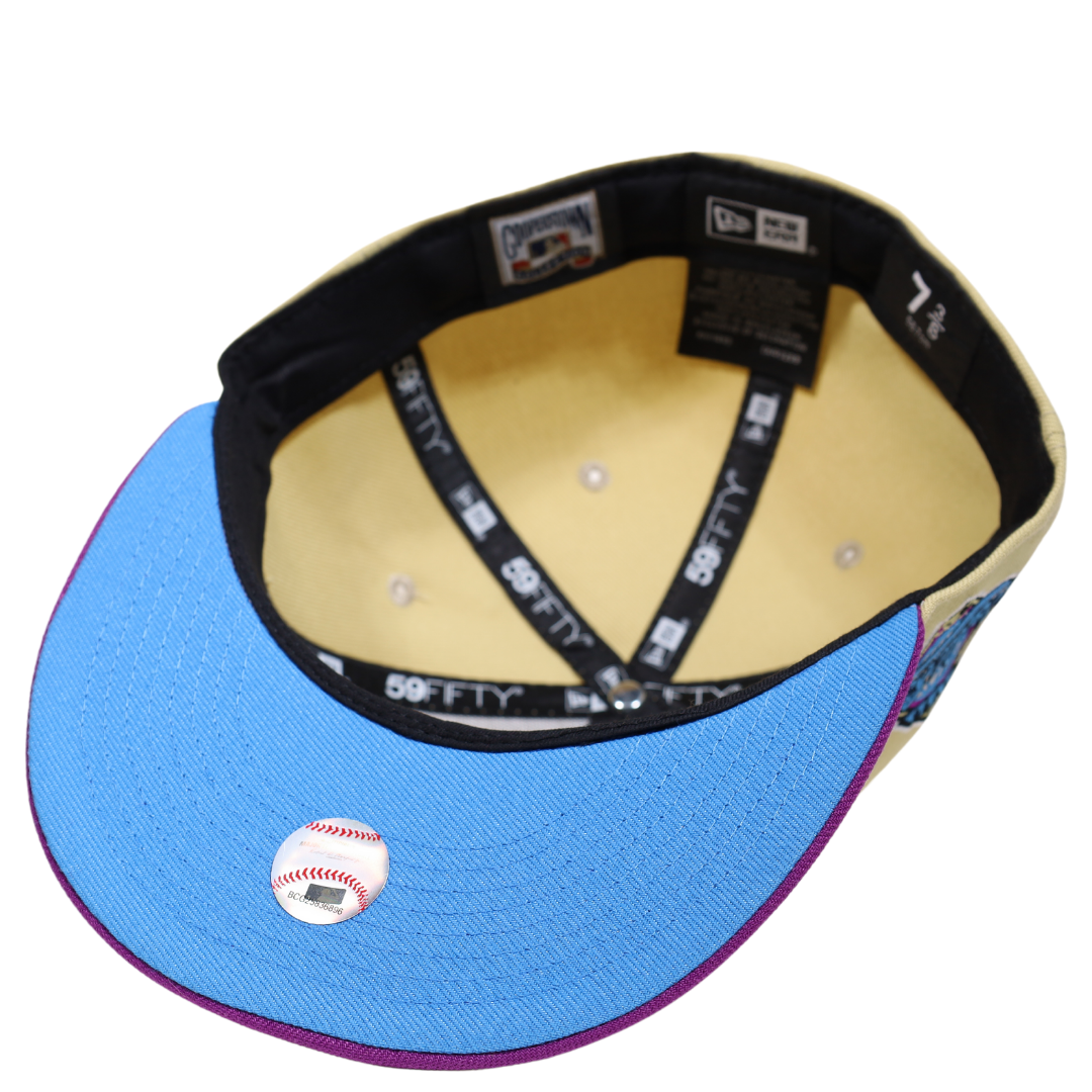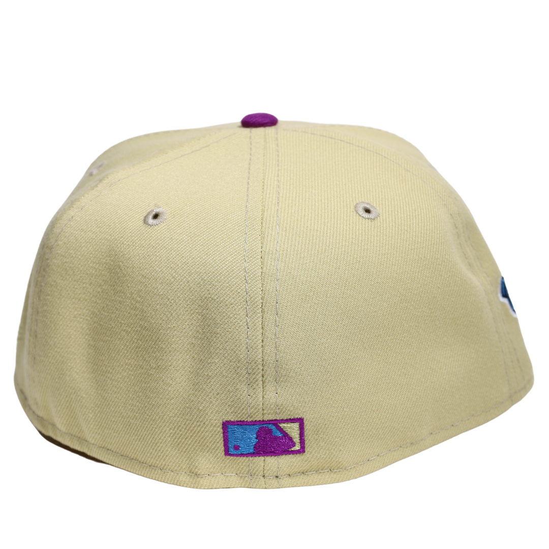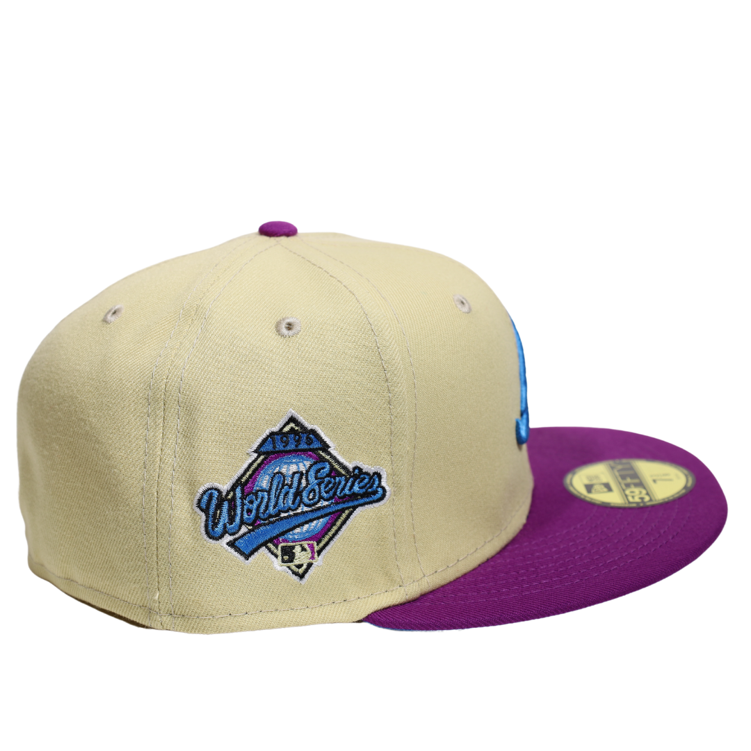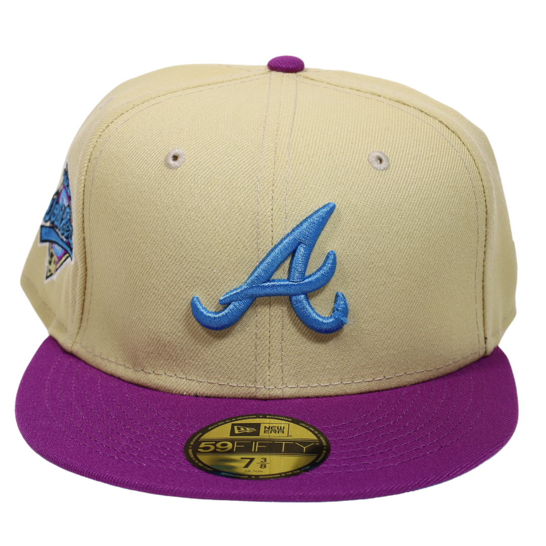 This New Era Atlanta Braves 1996 World Series 59FIFTY Fitted Hat has a six panel structured high crown and embroidered eyelets with a fabric squatchee button. The fitted cap has a flat bill with a sweatband. The front panel features the Atlanta Braves logo embroidery.