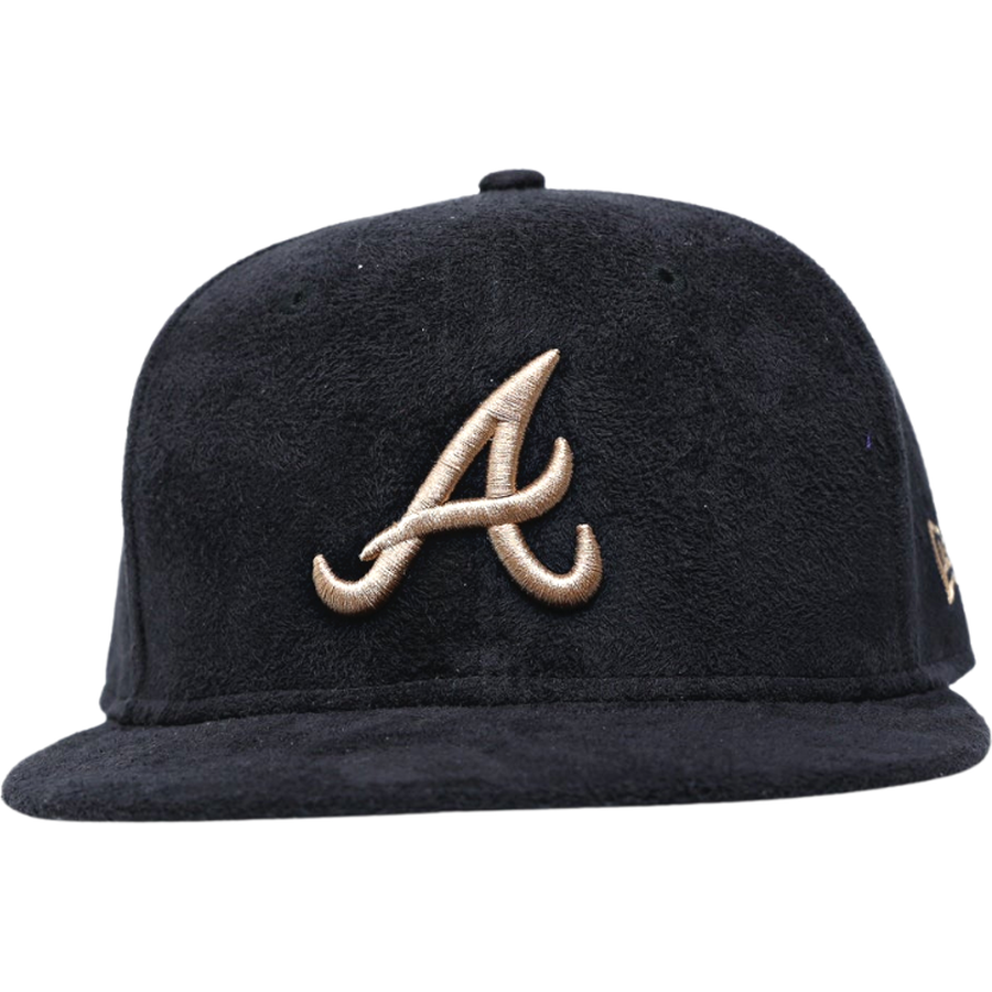 This New Era Atlanta Braves 59FIFTY fitted hat has a black suede six panel structured high crown, embroidered eyelets and squatchee button. The flat bill of the fitted is also black suede with a black undervisor and sweatband. The front panel MLB team logo, left panel New Era logo and the official MLB Batterman logo on the back of the crown are embroidered in tan threads.