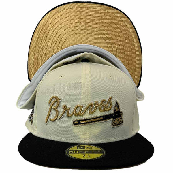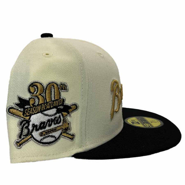 This New Era Atlanta Braves 'Champagne' 30th Season Gold UV 59FIFTY Fitted Hat was released by Pro Image Sports. The fitted has a cream six panel structured high crown and embroidered eyelets with a black fabric squatchee button. The fitted cap also has a black flat bill with a metallic gold undervisor and white sweatband. The front panel features the Atlanta Braves logo embroidery and a 30th Season side patch embroidery on the right panel. The left panel of the fitted displays the New Era logo and the official MLB logo embroidery on the rear crown.