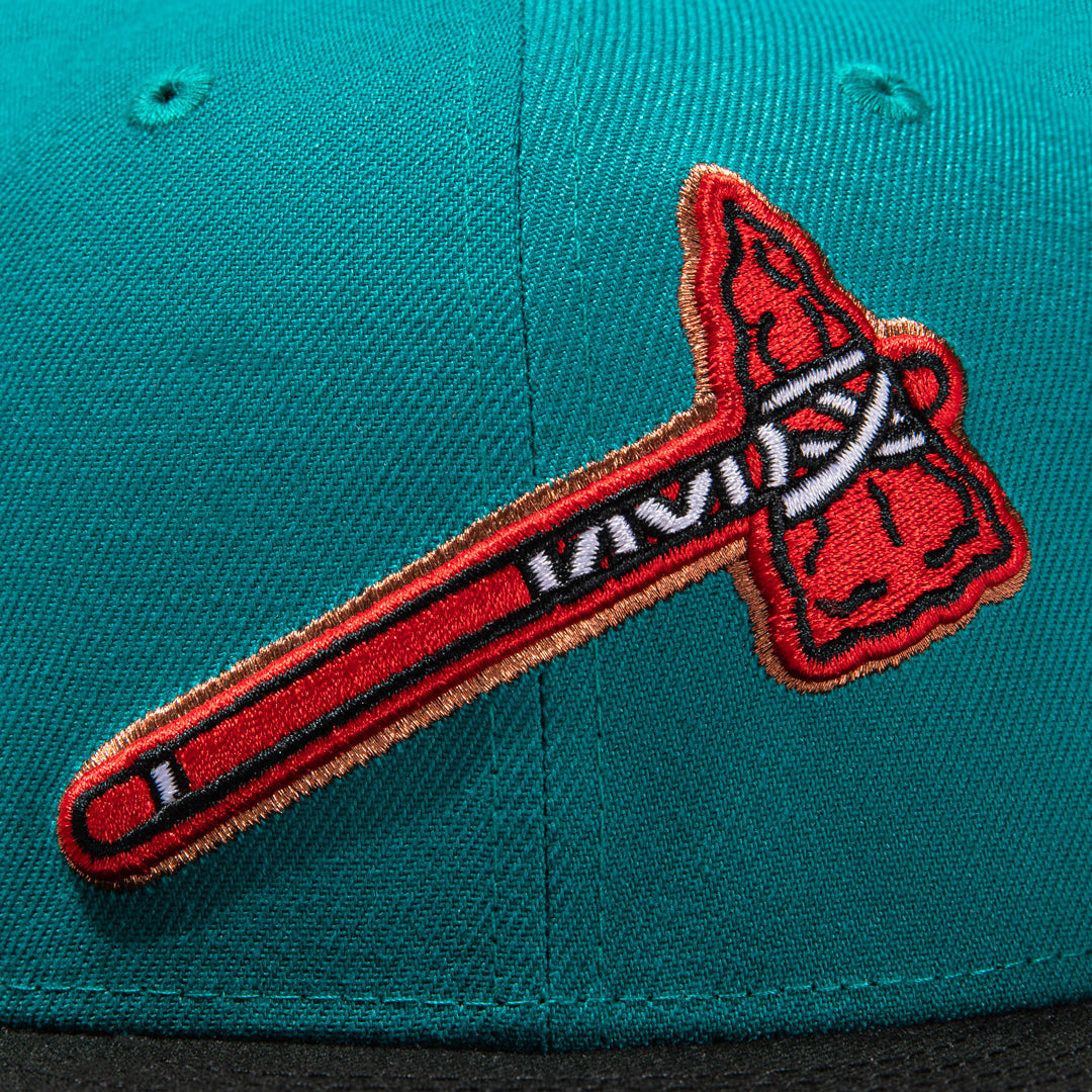 This New Era Atlanta Braves Copper Head 59FIFTY fitted hat has a teal six panel structured high crown, teal embroidered eyelets and a black fabric squatchee button. The fitted cap also has a black flat bill with a grey undervisor and black sweatband. The front panel features the Atlanta Braves logo embroidery and a side patch embroidery on the right panel. The left panel of the fitted displays the New Era logo and the rear crown features the official MLB logo embroidery.